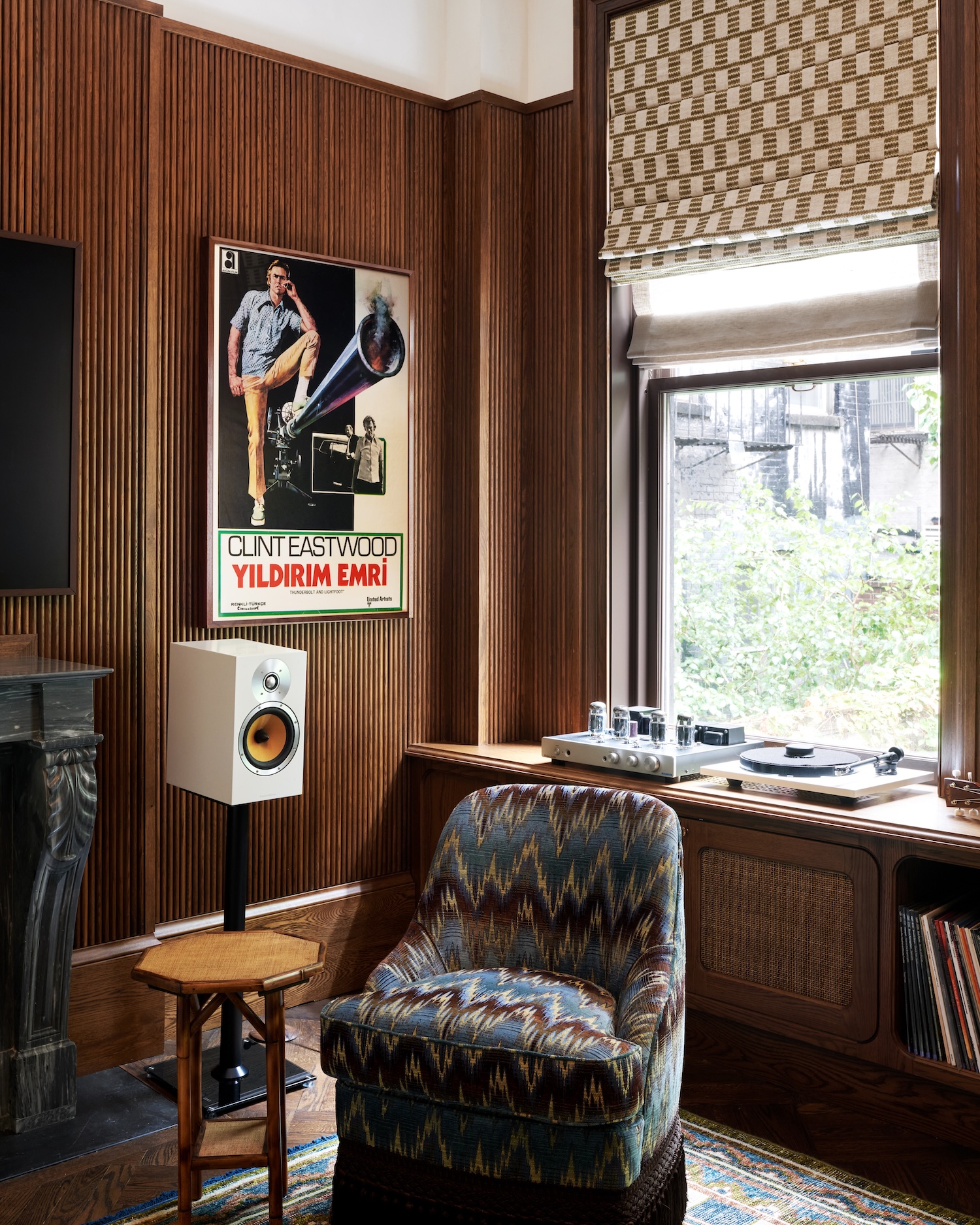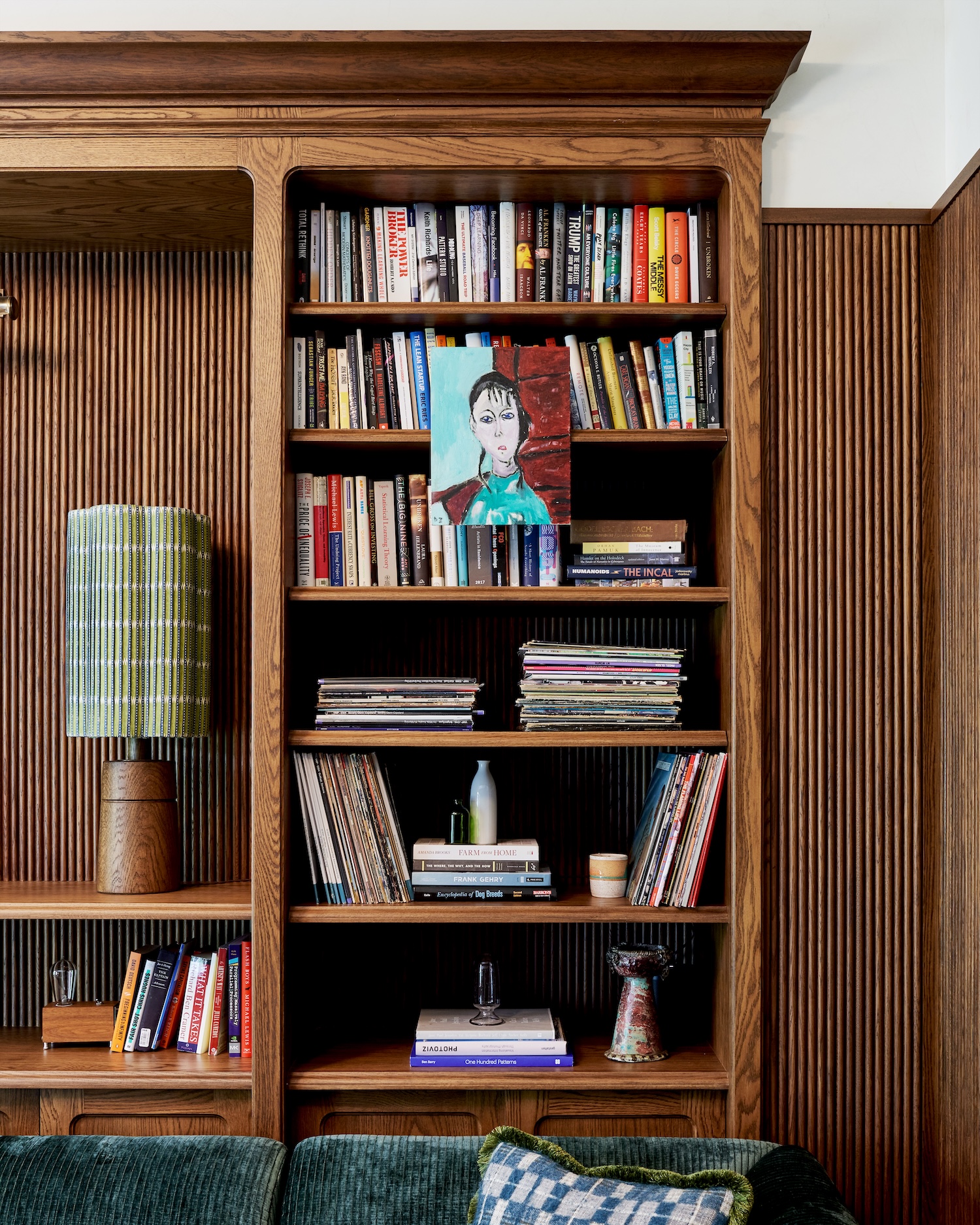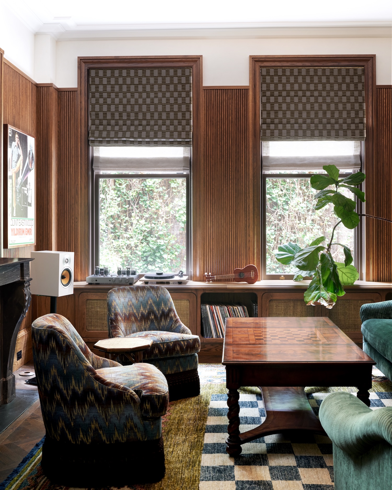 One particularly influential reference was a pharmacy shelving design by Tuthill, which inspired the custom millwork in the den. We paired it with stained wood tambour paneling to make it feel current and appropriate for a young couple. This was one of the most playful spaces. We used a teal corduroy sectional paired with Watts of Westminster Florentine Bargello swivel chairs and carried that boldness into the rug with a custom checkered pattern that references the parquet chess-pattern coffee table layered on top.