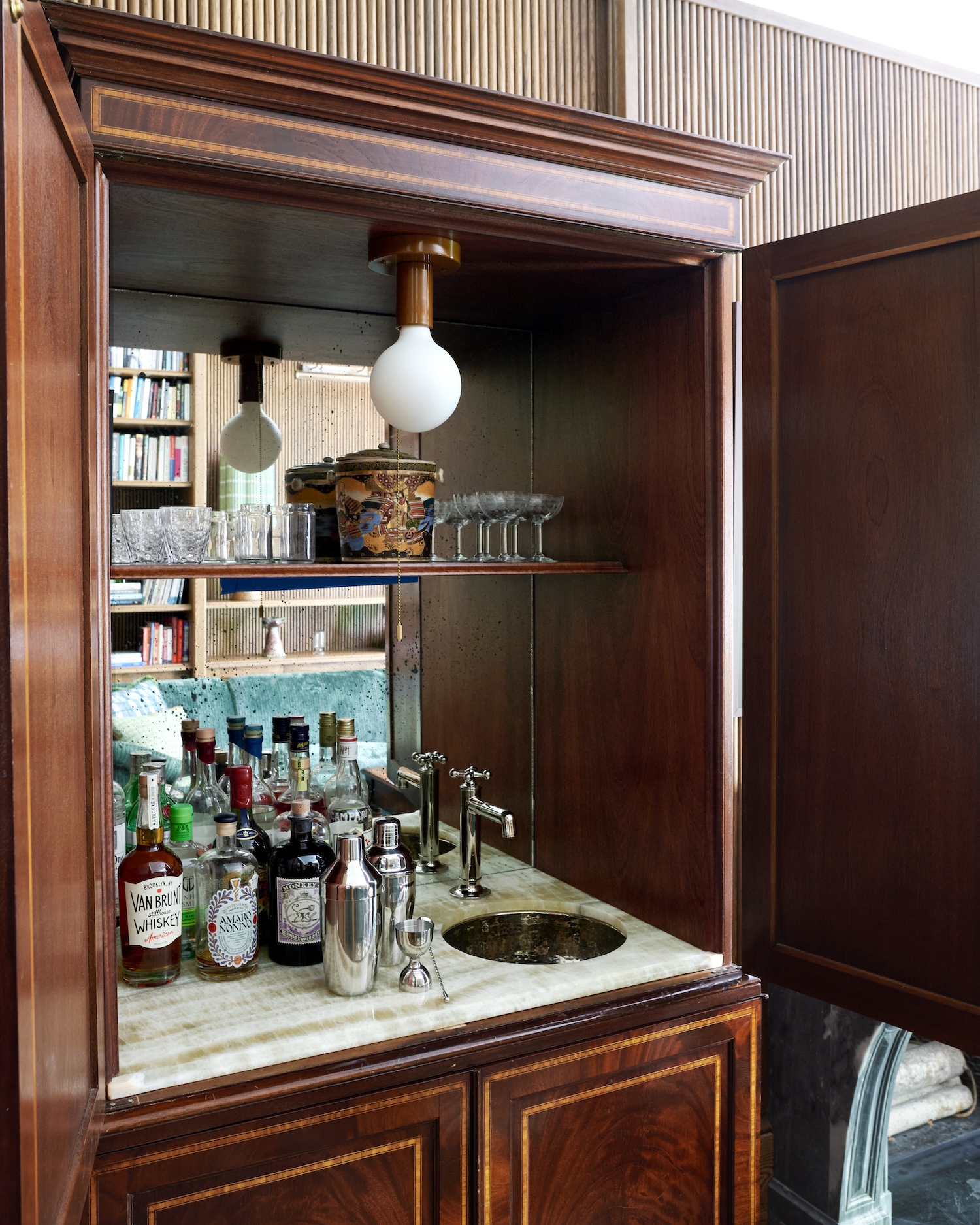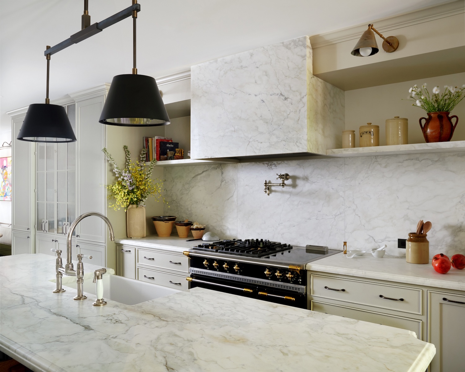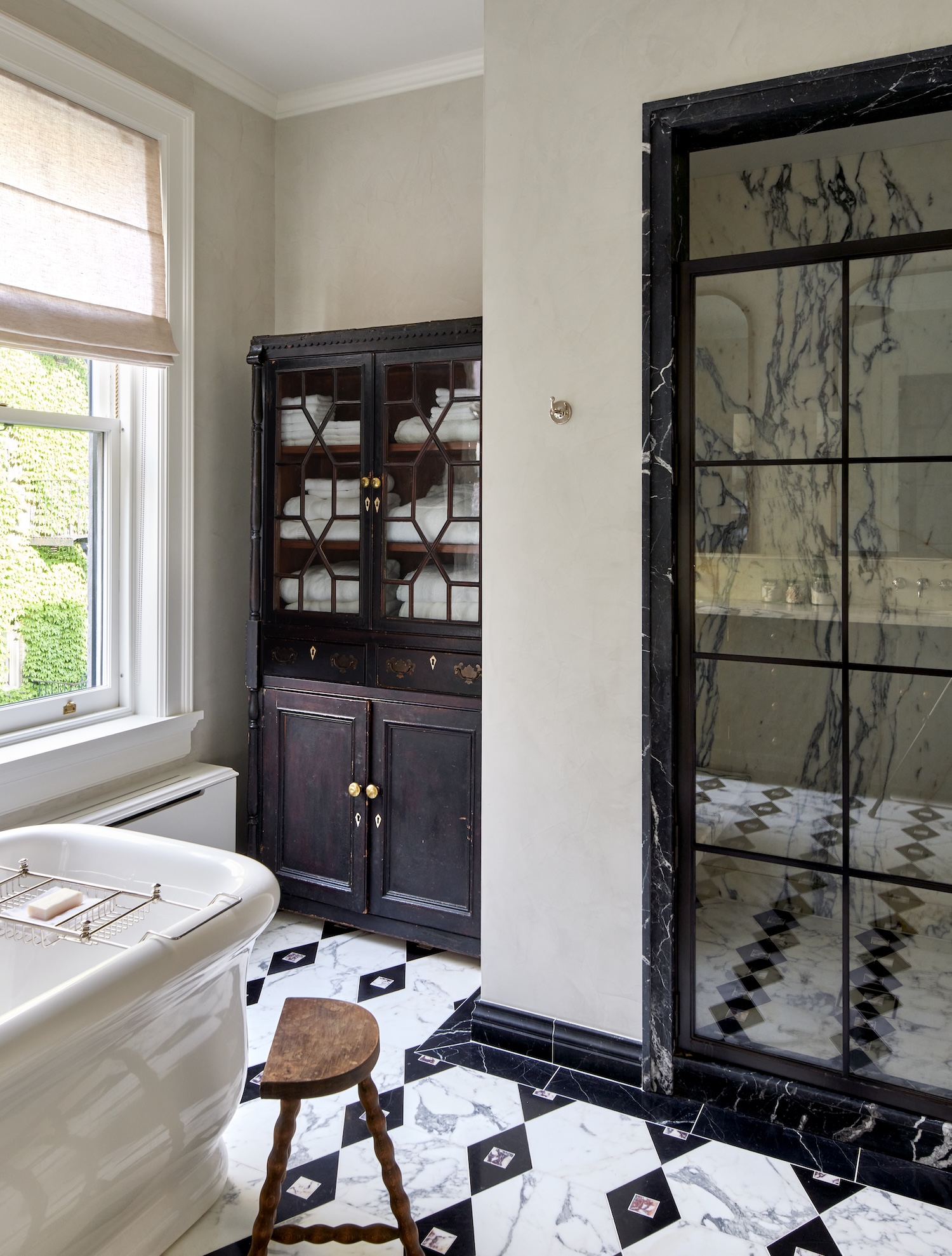 Antiques played an important role throughout the house, helping to ground the interiors in history. In the dining room, we sourced a 1950s English oak bookshelf whose beautifully patinated, ebonized finish echoes the Nero Marquina marble floor tiles in the adjacent kitchen. In the primary bathroom, an 1820s Irish bookshelf was repurposed as a linen cabinet.