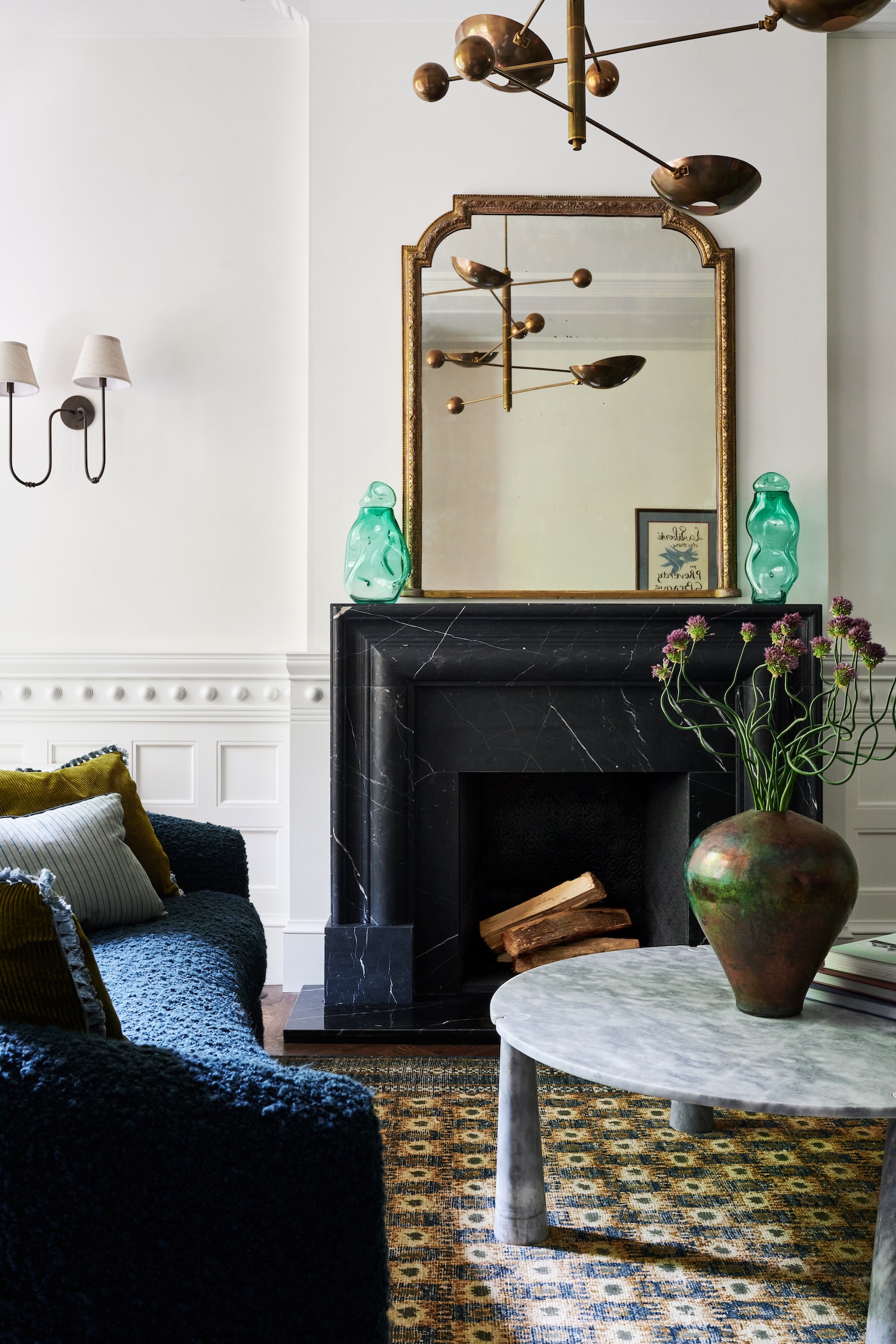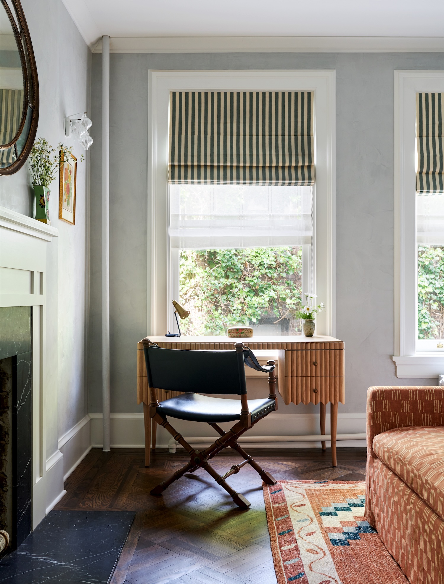 A detail we loved was a traditional paneled wall design with an unexpected round medallion near the chair rail molding. It felt quirky and playful, something we hadn’t seen before, and it allowed us to inject a sense of lightness into what might otherwise be a very formal living room.