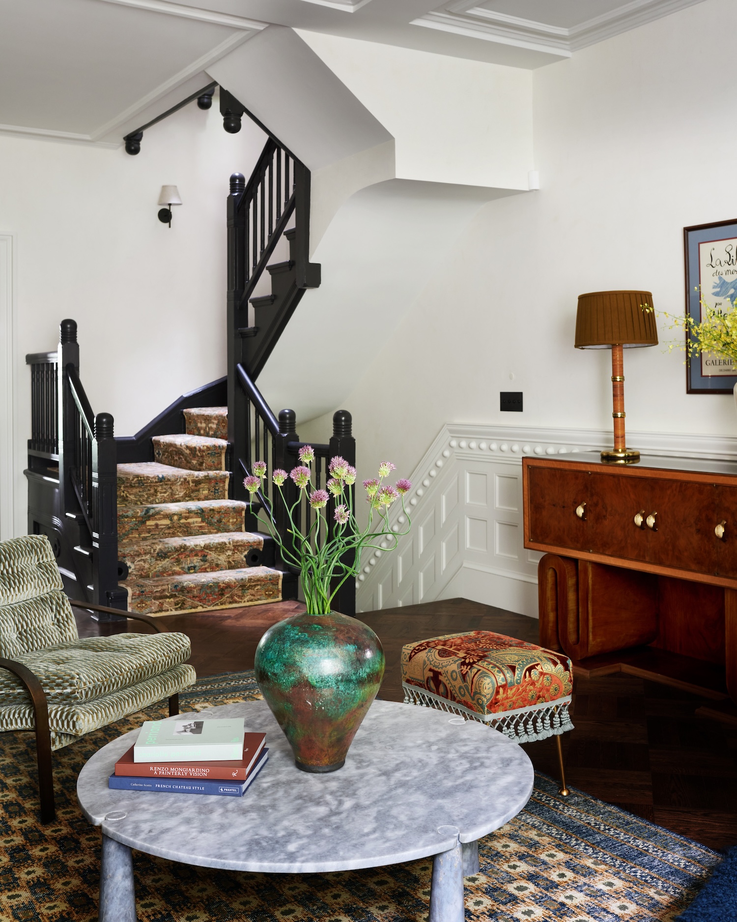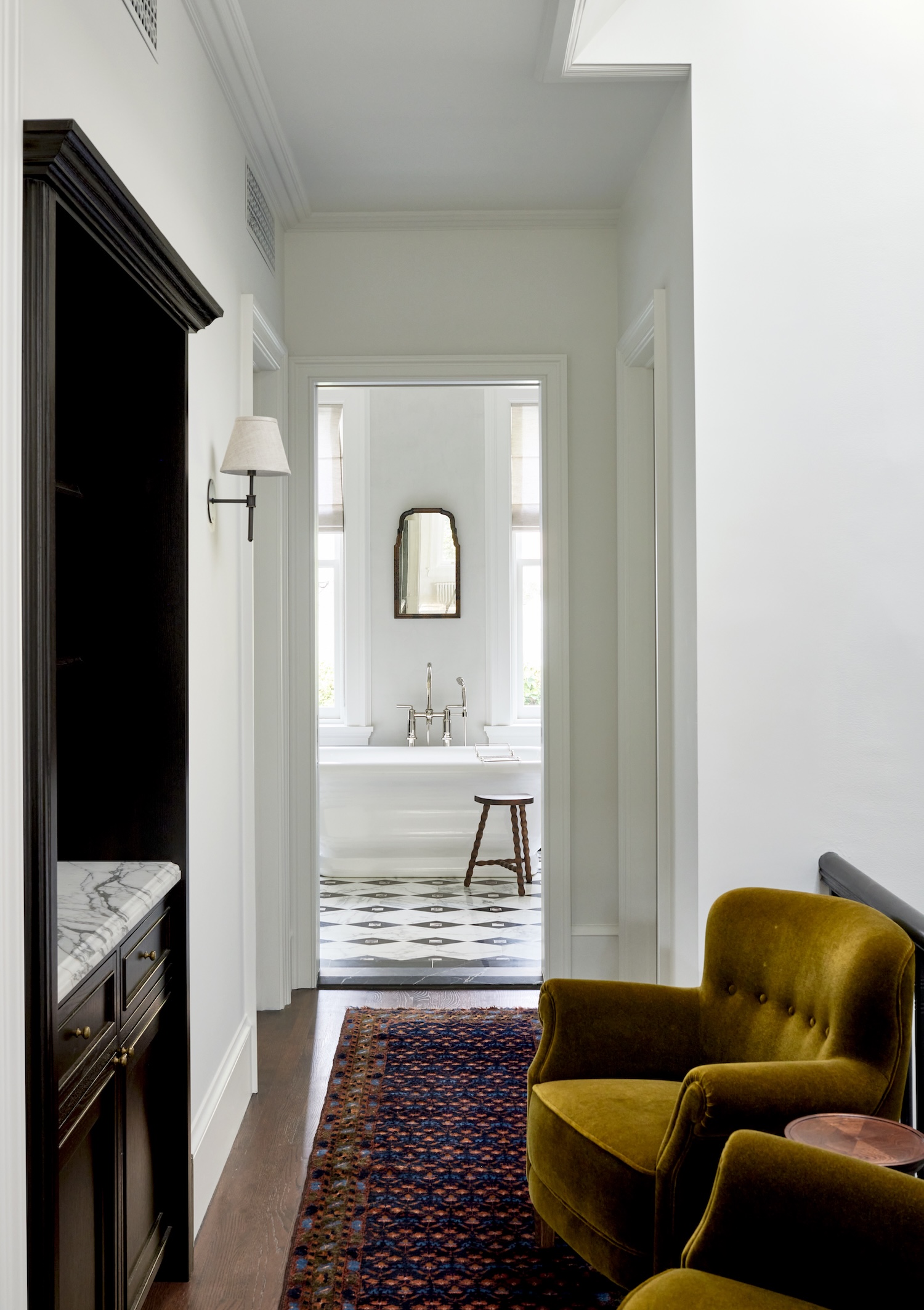 We also designed nearly all of the rugs in the house, with the exception of the antique runner leading into the primary bathroom. Given the narrow proportions typical of townhouses, custom sizing and patterning felt essential. We drew inspiration from period textiles and rugs, using them to bring warmth and life to each space, and selected wool colors that tie back to the furnishings and fabrics in each room.
