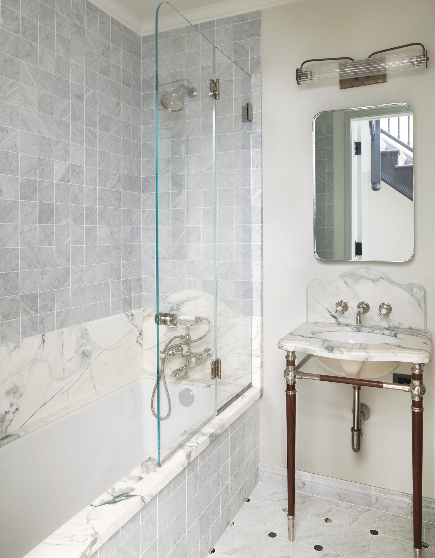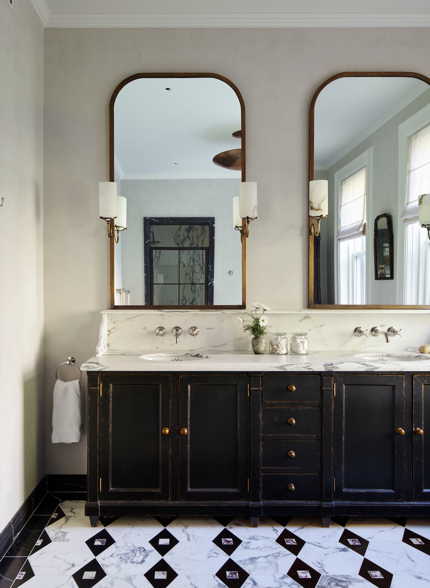 The primary bathroom vanity was designed with a worn, ebonized oak finish, paired with Arabescato Corchia marble used throughout the bathroom, from the countertop to the shower walls, to create cohesion.