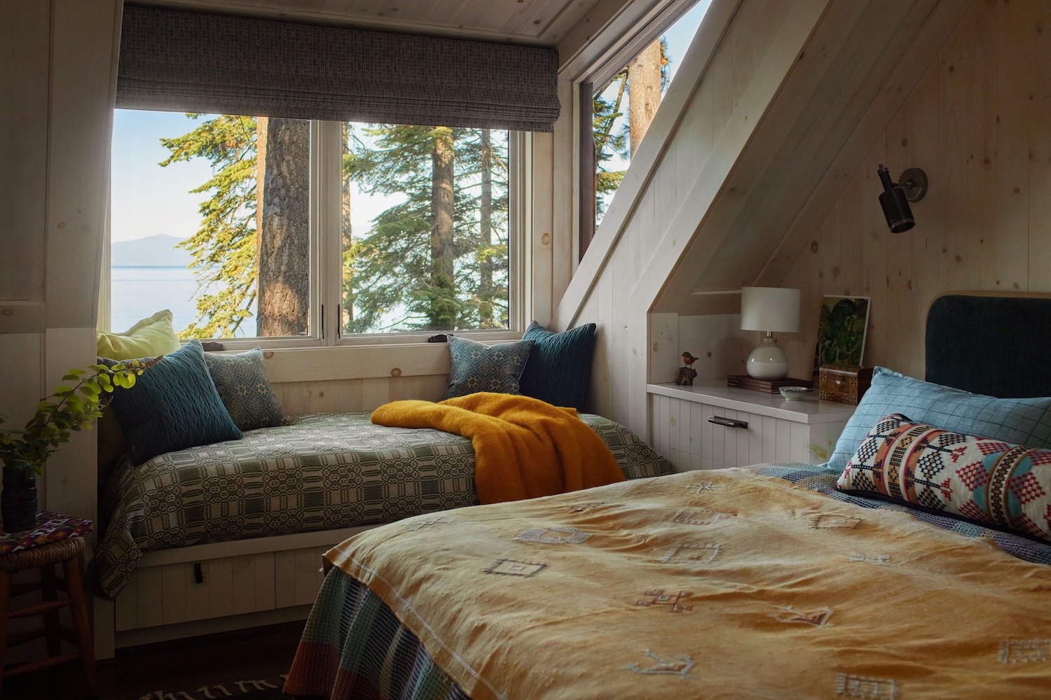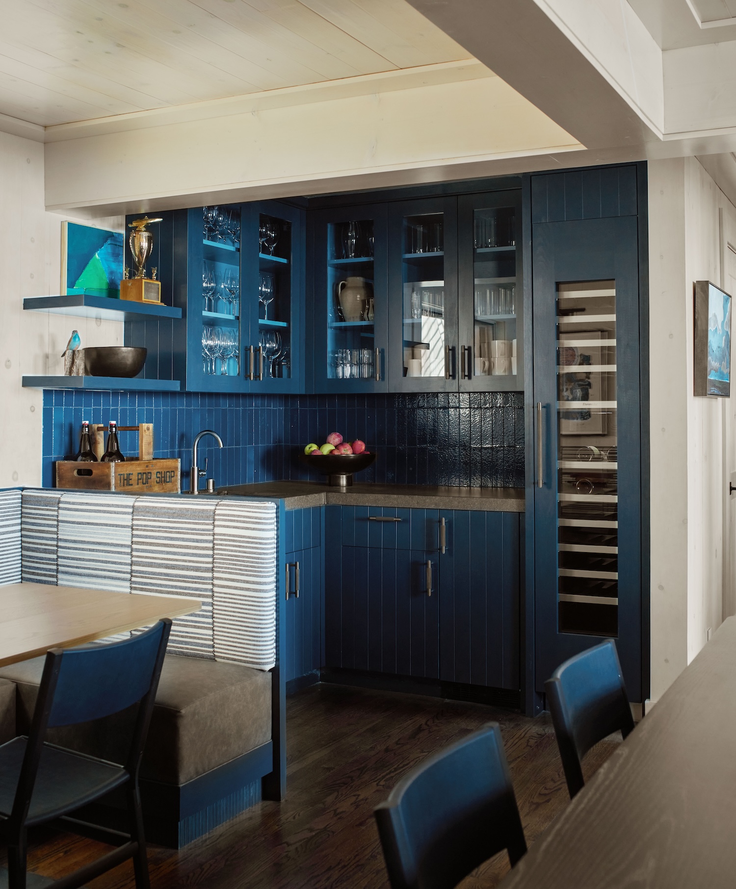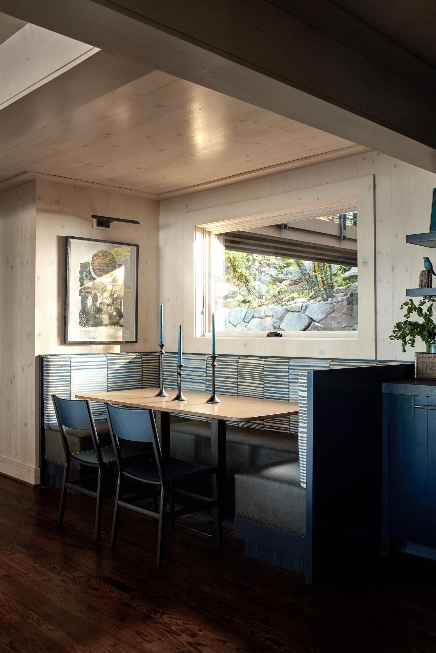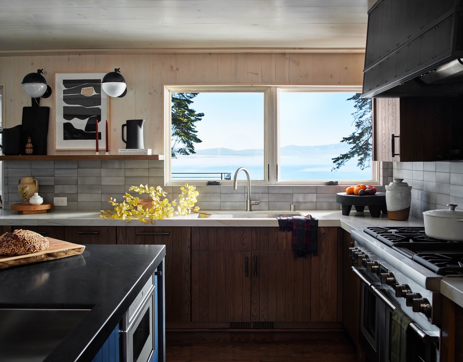 The interiors were carefully gutted and revitalized. Original whitewashed pine paneling was updated to a warm white lacquered finish, creating a brighter, airy nautical ambiance. This is complemented by rich oak and redwood accents, which add warmth, depth, and durability. Natural quartzite and granite stone surfaces and handmade tiles infuse the space with organic craftsmanship, blending rustic elements with clean architectural lines. Thoughtful pops of color, texture, and pattern celebrate the family’s Filipino heritage while tying back to the home’s mountain lakefront setting.
