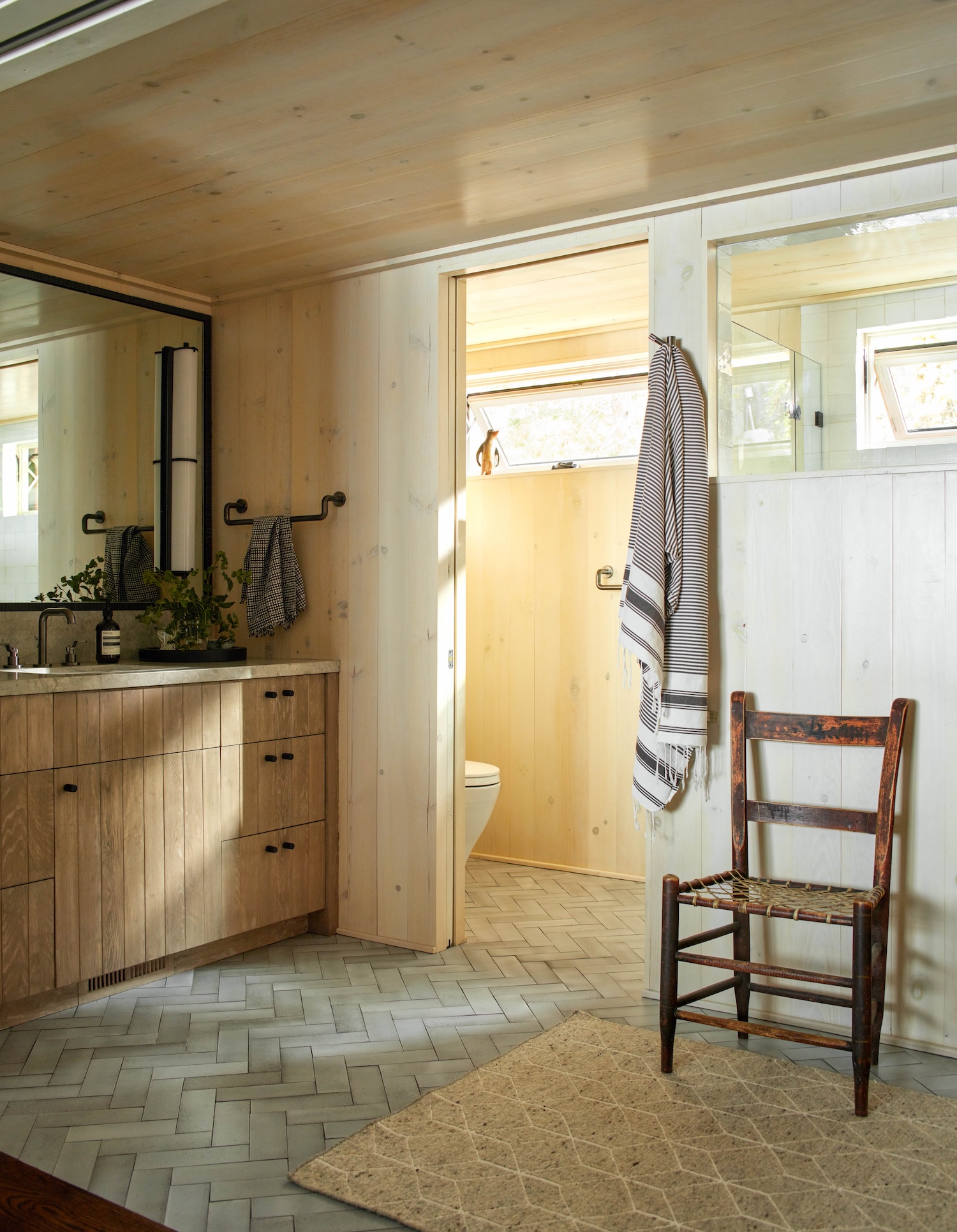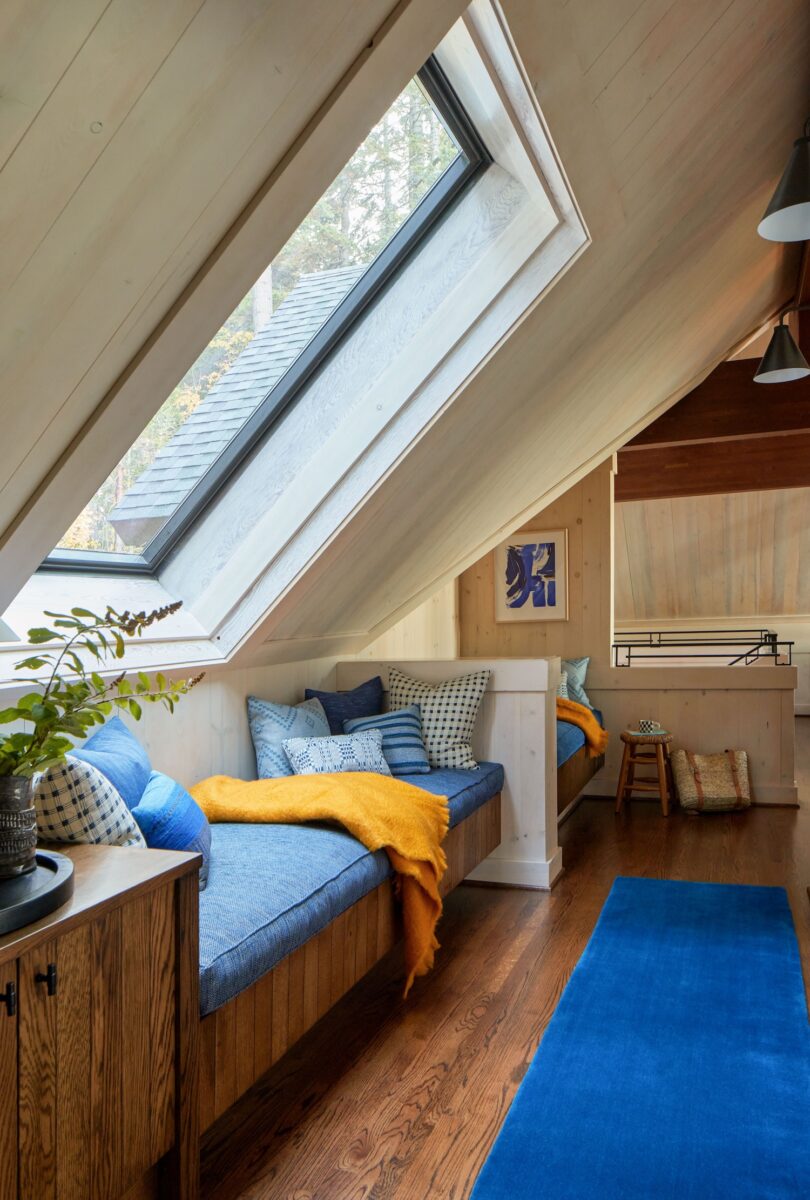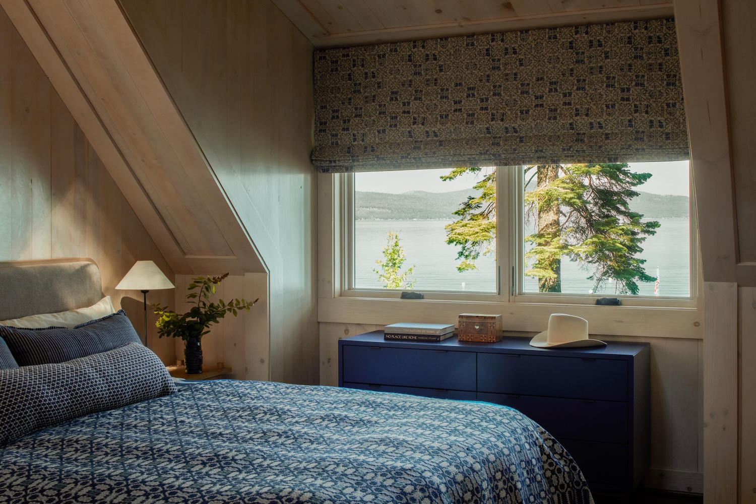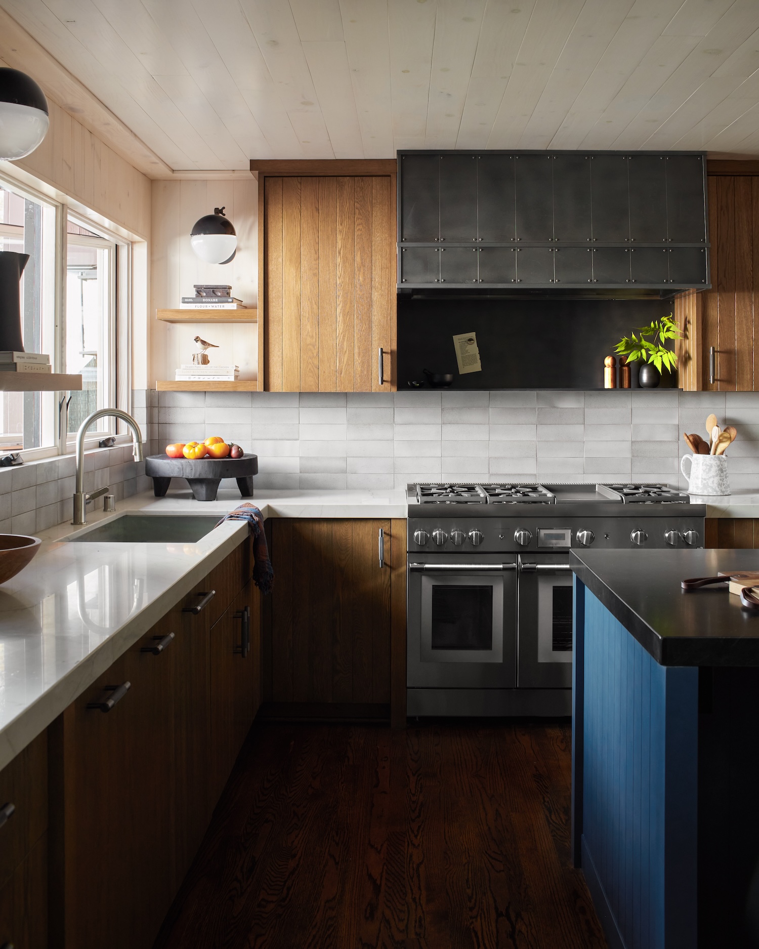 The interiors were carefully gutted and revitalized. Original whitewashed pine paneling was updated to a warm white lacquered finish, creating a brighter, airy nautical ambiance. This is complemented by rich oak and redwood accents, which add warmth, depth, and durability. Natural quartzite and granite stone surfaces and handmade tiles infuse the space with organic craftsmanship, blending rustic elements with clean architectural lines. Thoughtful pops of color, texture, and pattern celebrate the family’s Filipino heritage while tying back to the home’s mountain lakefront setting.