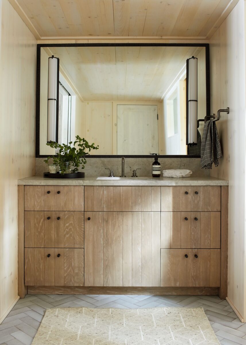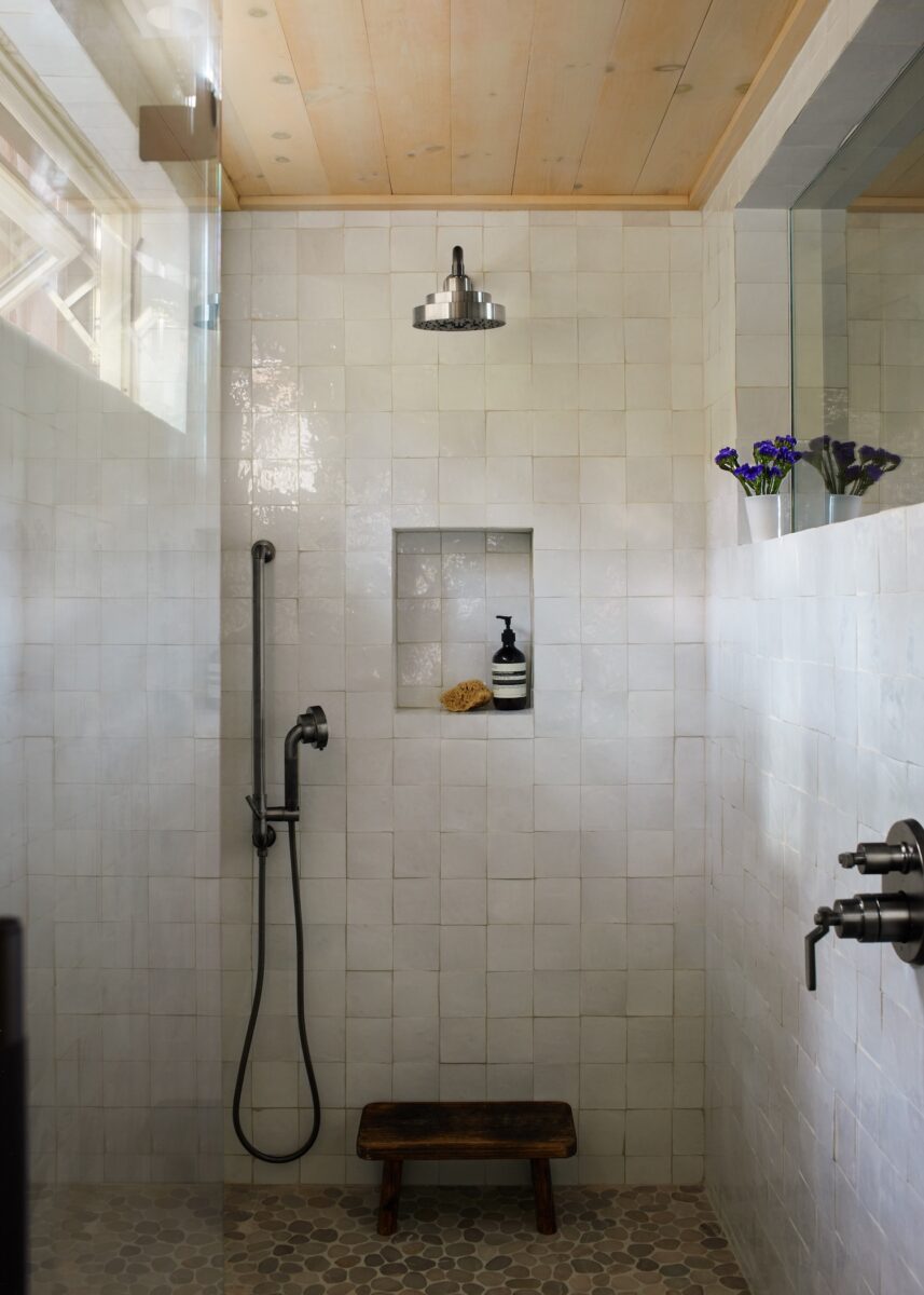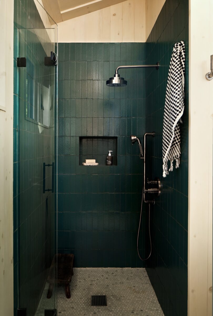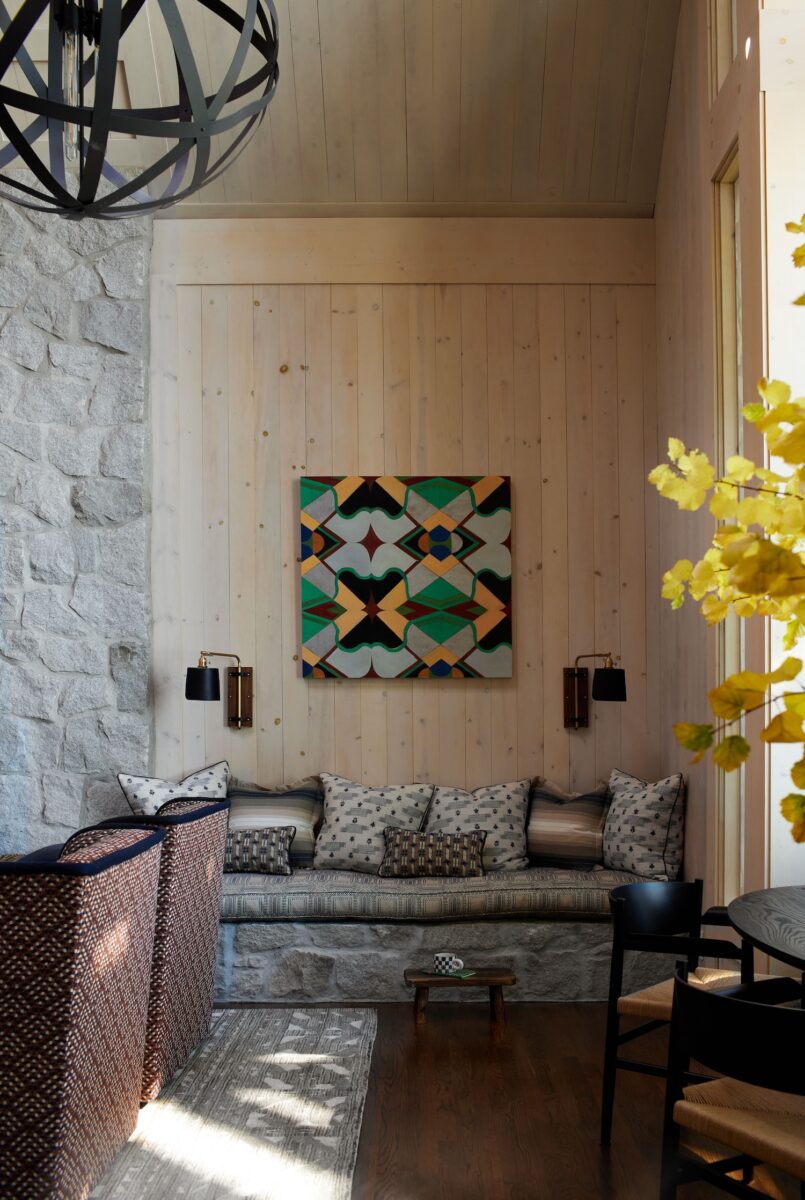 The interiors were carefully gutted and revitalized. Original whitewashed pine paneling was updated to a warm white lacquered finish, creating a brighter, airy nautical ambiance. This is complemented by rich oak and redwood accents, which add warmth, depth, and durability. Natural quartzite and granite stone surfaces and handmade tiles infuse the space with organic craftsmanship, blending rustic elements with clean architectural lines. Thoughtful pops of color, texture, and pattern celebrate the family’s Filipino heritage while tying back to the home’s mountain lakefront setting.