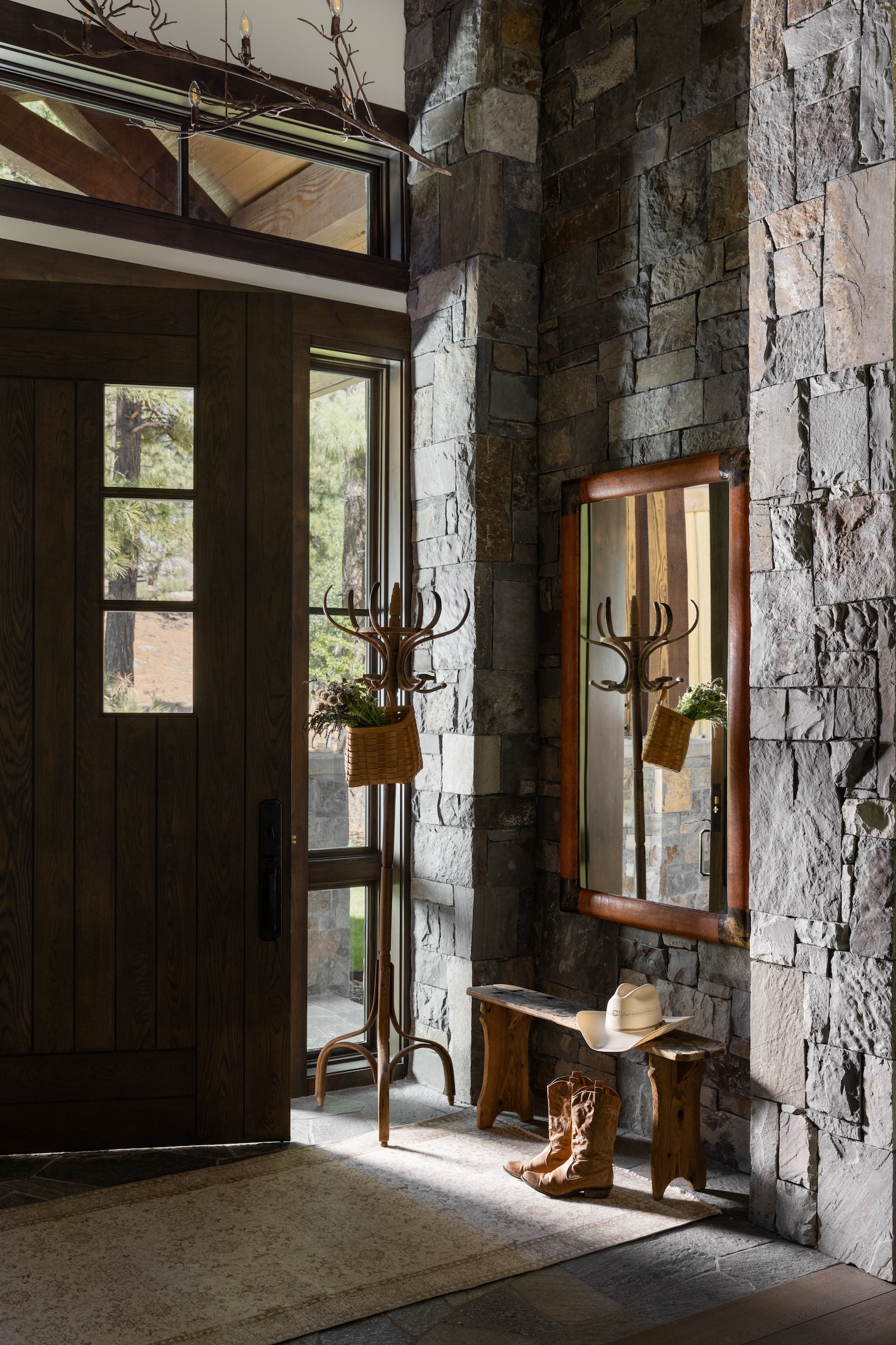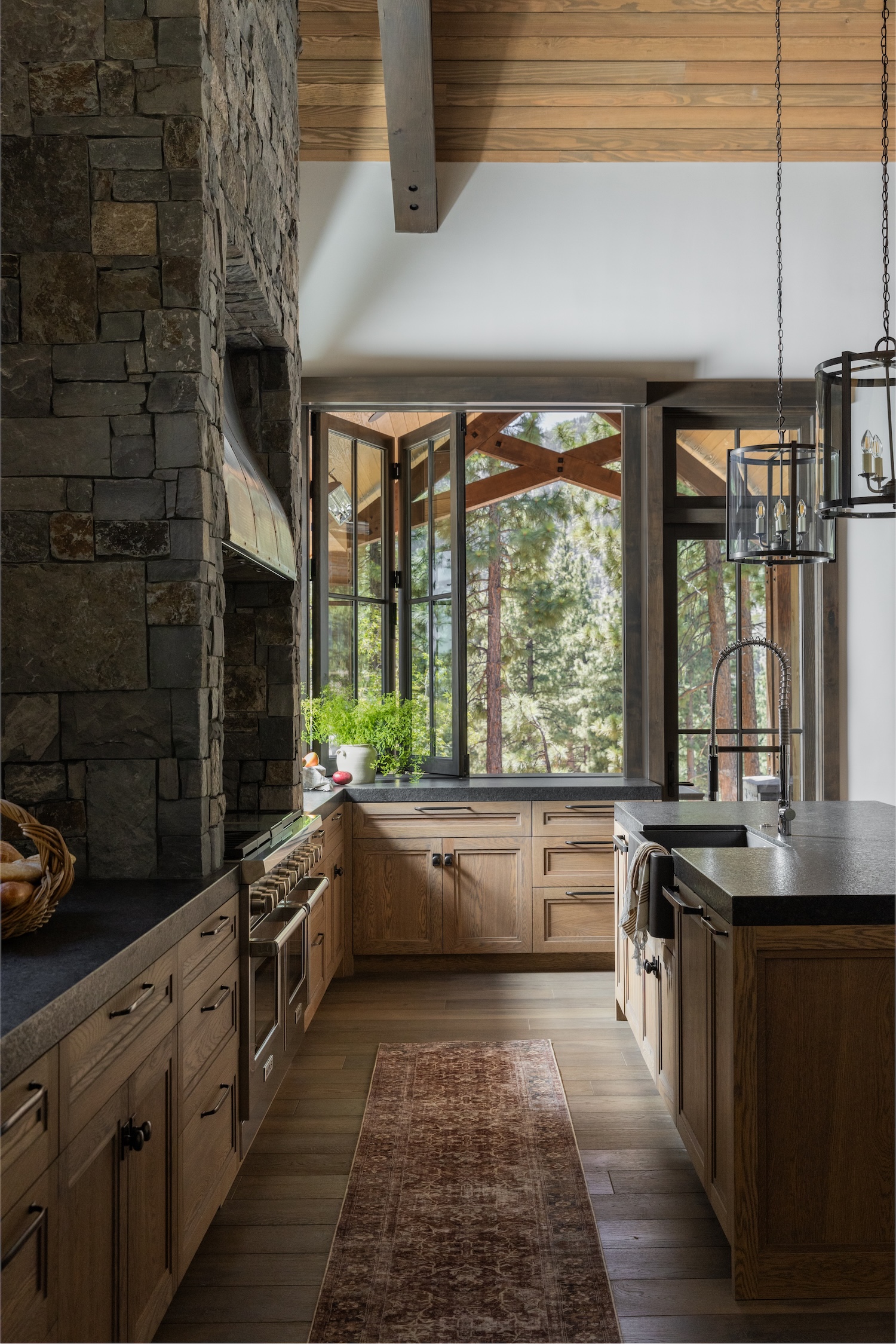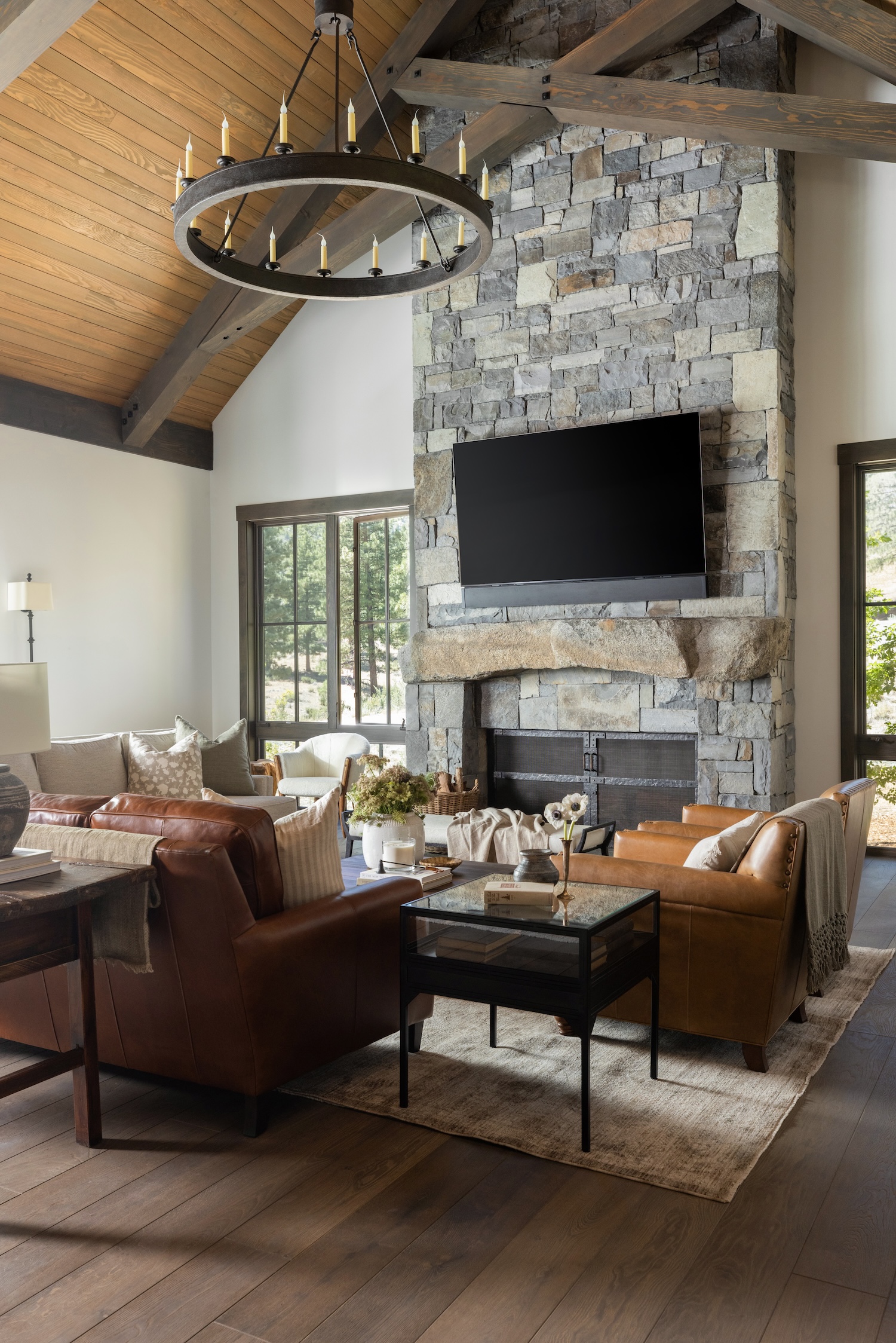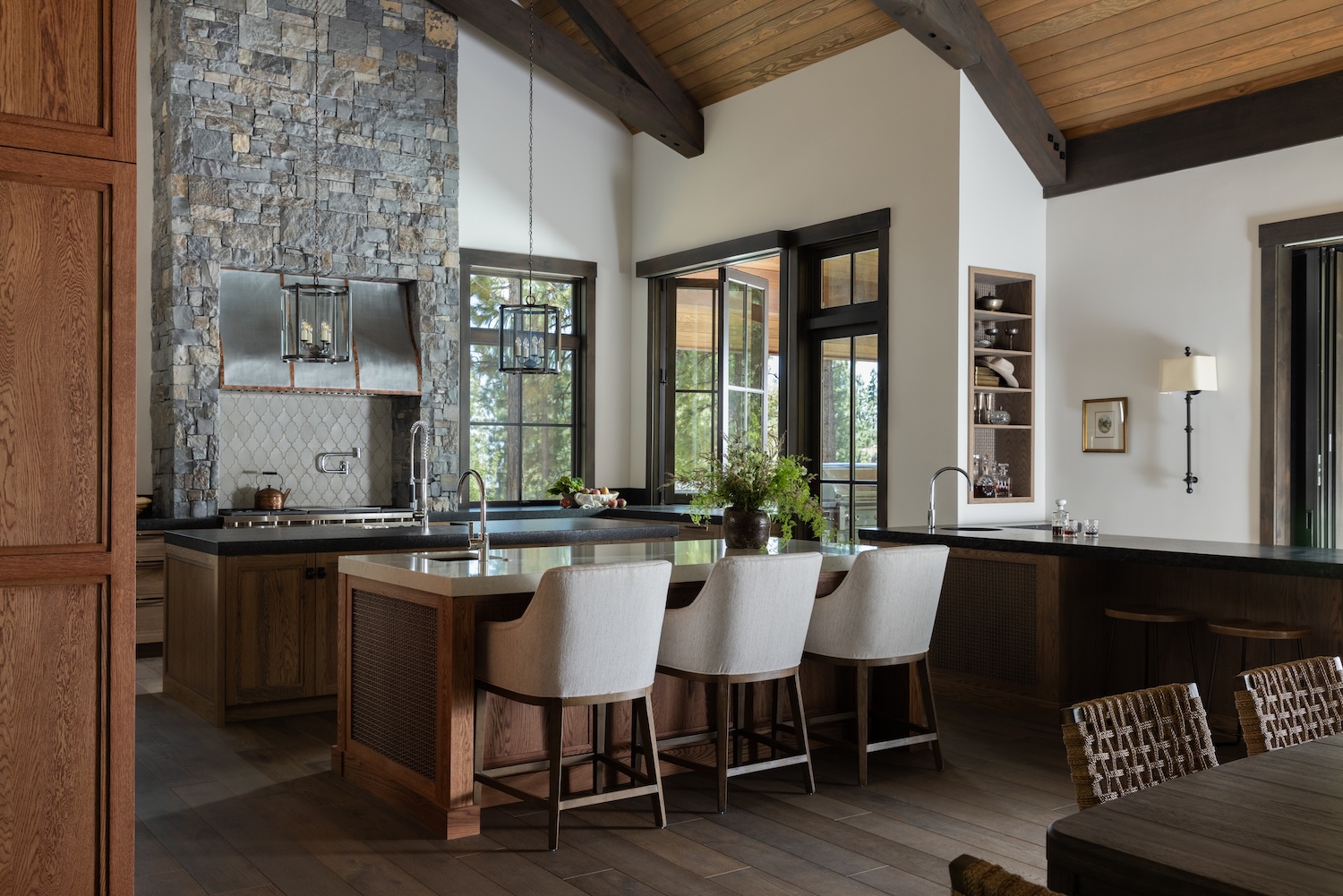 A few key must-haves included: spacious gathering areas for large family get-togethers; cozy, layered interiors to balance the home’s grand scale; natural materials such as stone and wood to evoke a timeless mountain retreat; functional spaces like a mudroom with ski lockers, a bunkroom for grandkids, and a well-appointed kitchen and bar for entertaining.