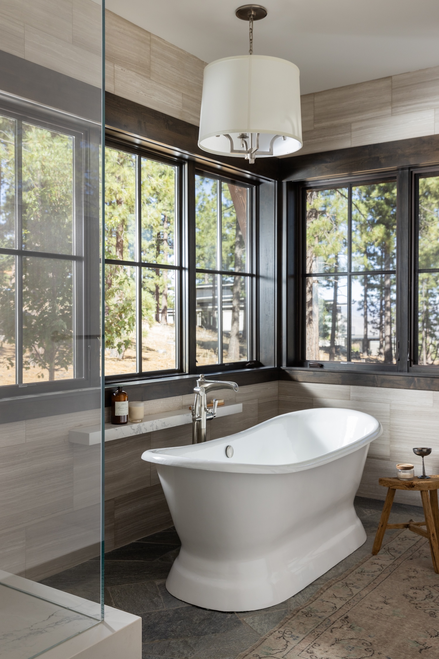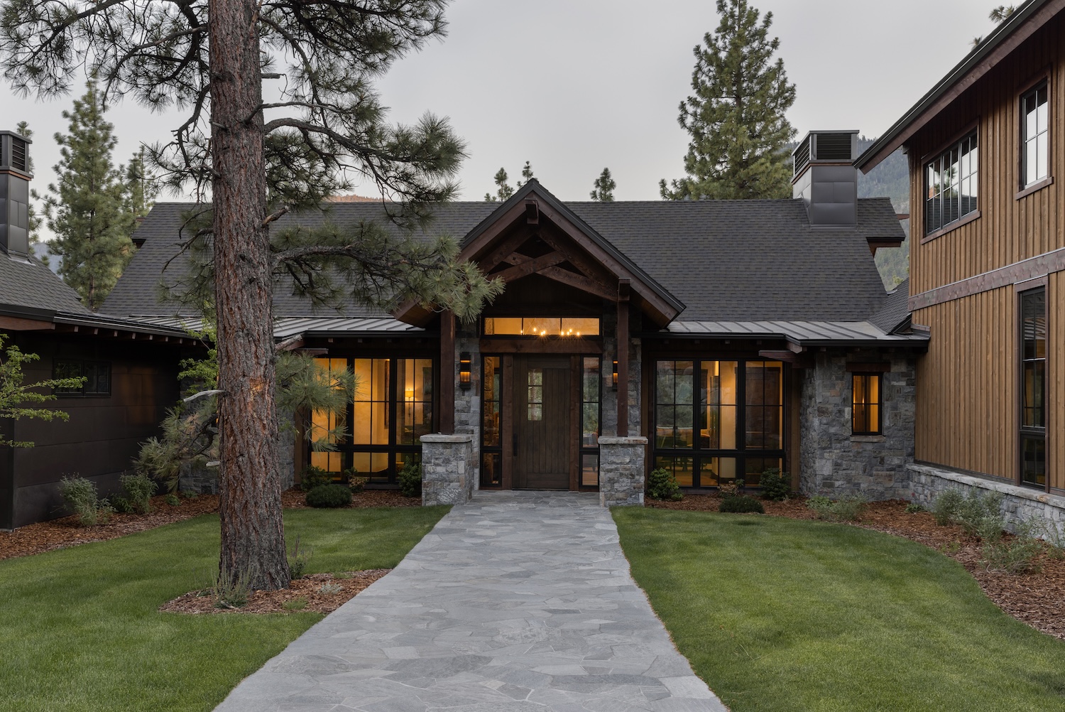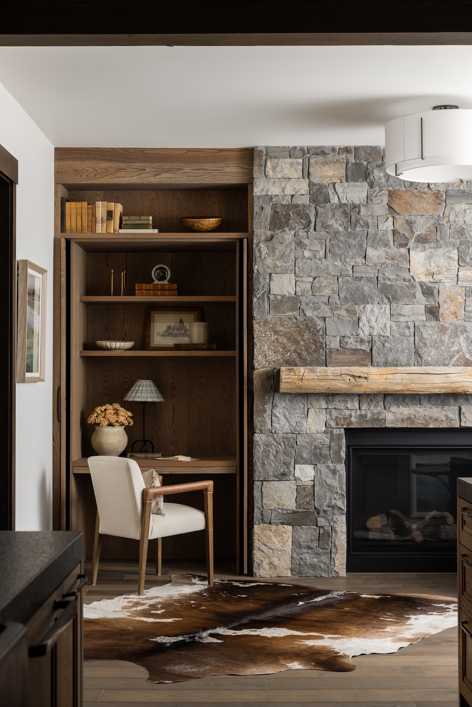 Architect Keith Kelly of Kelly & Stone Architects designed a stunning contemporary structure, and our role was to bring their vision to life through material selections, finishes, and interior detailing. The goal was to create a home that felt cozy and welcoming while maintaining a refined aesthetic. Once the architectural plans were finalized, we took over the design direction for all interior and exterior finishes, ensuring the home’s aesthetic felt cohesive and intentional. This included selecting all finish materials (flooring, cabinetry, countertops, stonework, wood stains, and more), choosing all lighting fixtures to complement the home’s scale and style, and designing special architectural elements, such as fireplaces, built-ins, and custom details that reinforce the home’s lodge-like character.