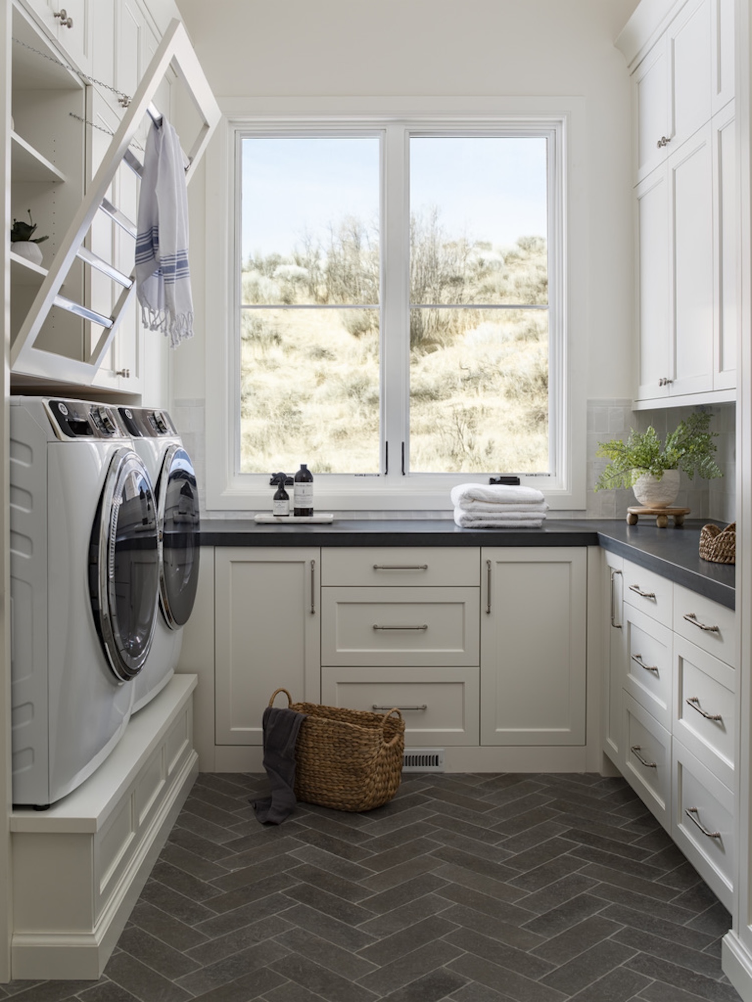 Function meets beauty in the laundry and mud rooms, where a shared herringbone floor, thoughtful storage, KPD’s signature pull-down drying rack above the washer and dryer, and durable finishes keep daily life beautifully organized.