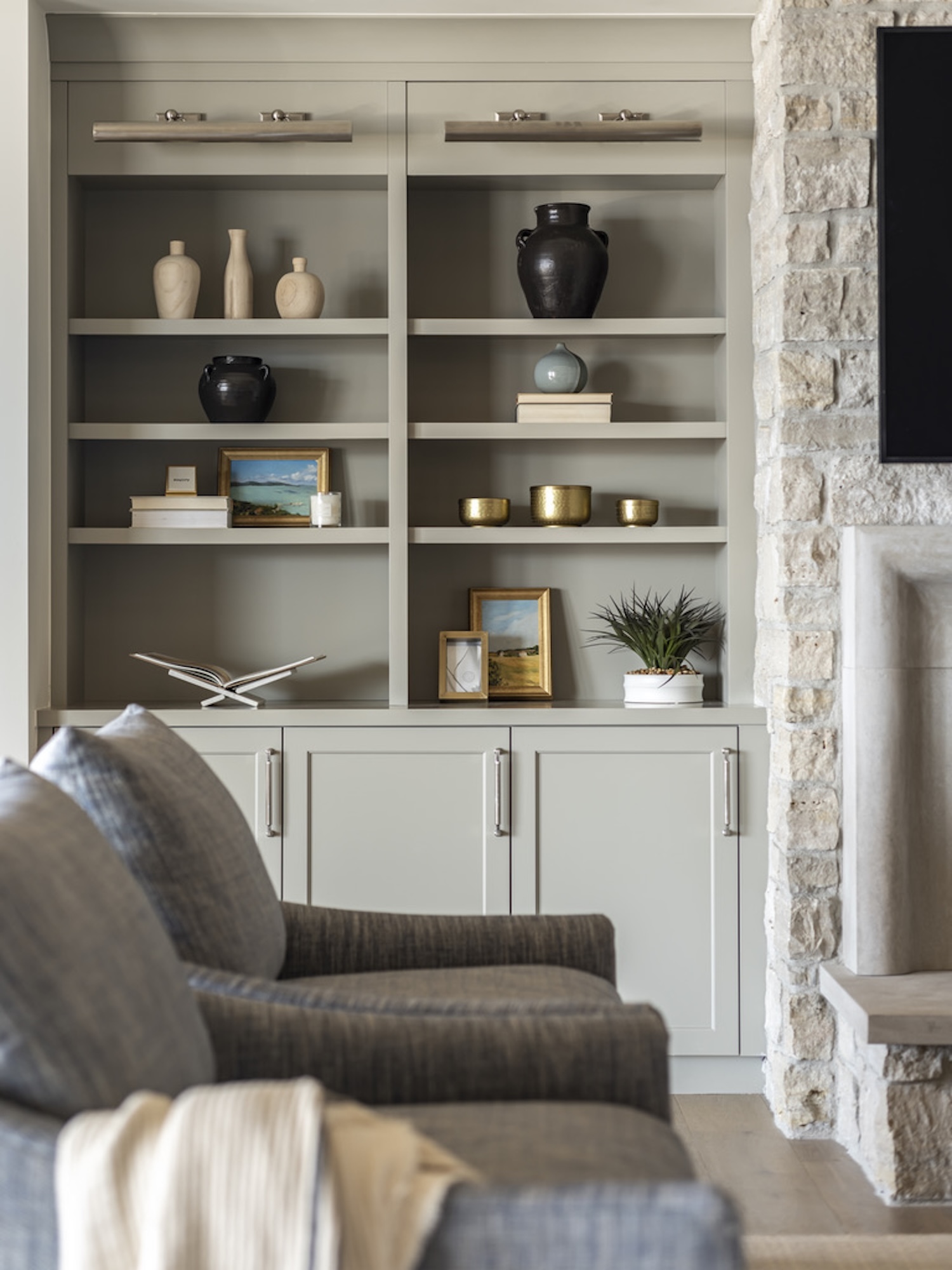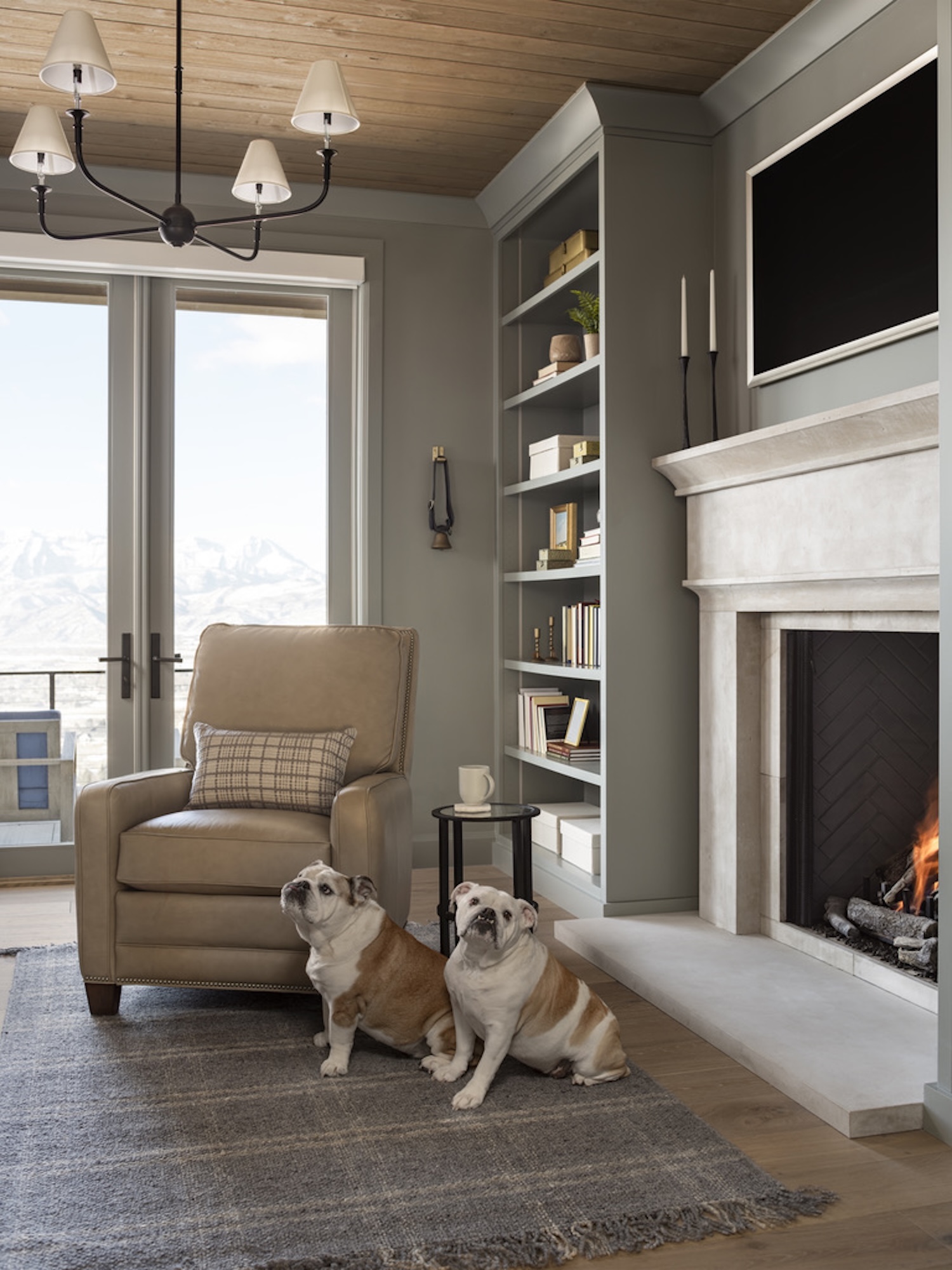 The office features subtle green cabinetry with dual workstations, ample book storage, and a fireplace framed by two recliners—creating a space that balances productivity with a cozy escape.