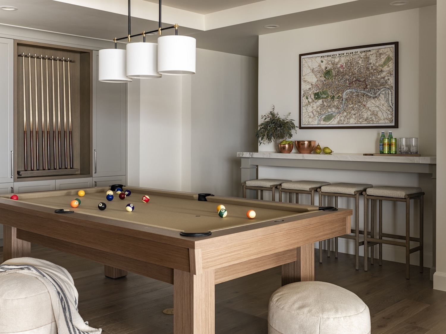 Five private bedroom suites and a spacious bunk room ensure everyone has their own retreat, while the lower-level recreation room, with its billiard table, snack bar, and children’s corner, anchors the home’s playful spirit. Extending off the recreation space, the indoor gym offers basketball and pickleball, keeping the whole family active year-round. Every detail, from the warm finishes to the layered textures, reflects a modern yet heritage-inspired design, crafted for both relaxation and connection.
