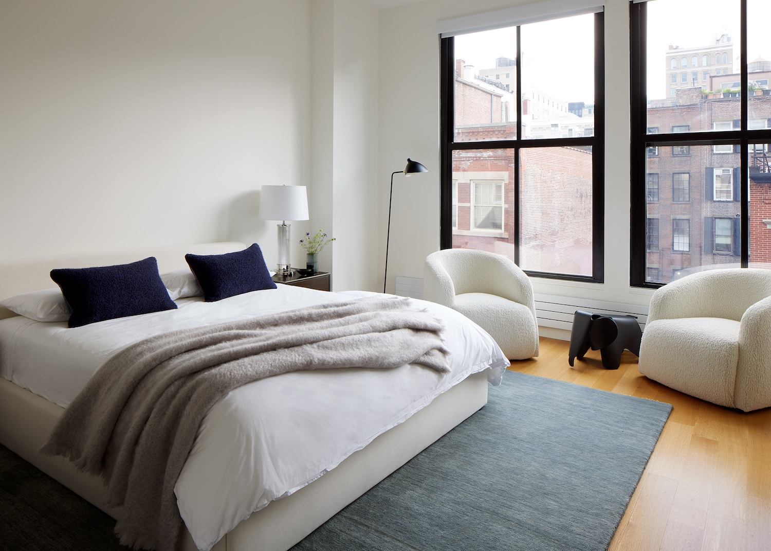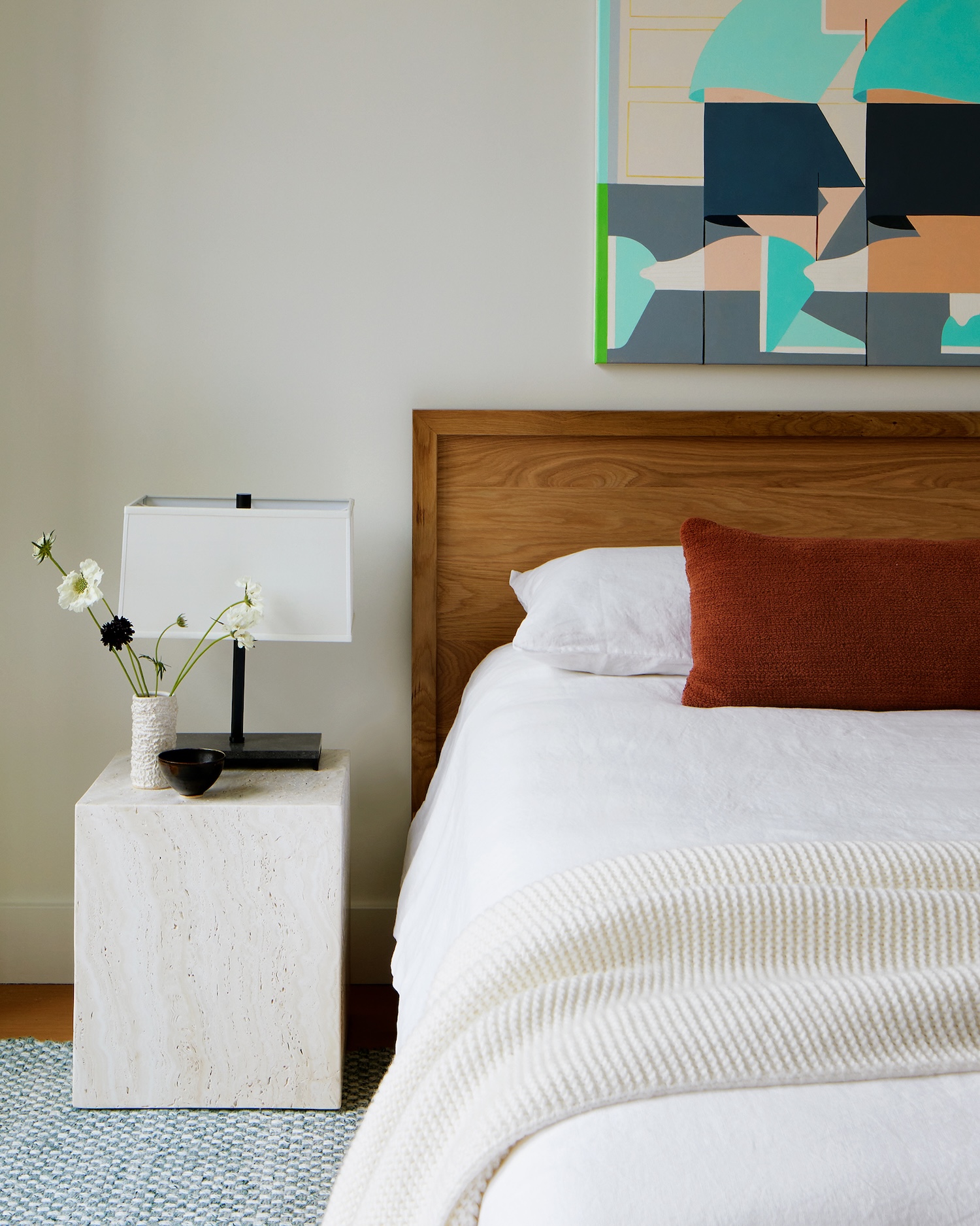 The challenge here was creating the feeling of warmth in a modern interior — we kept the walls white, and opted for shades instead of drapes — the warmth came from layering furniture styles, art and lamps for soft lighting.