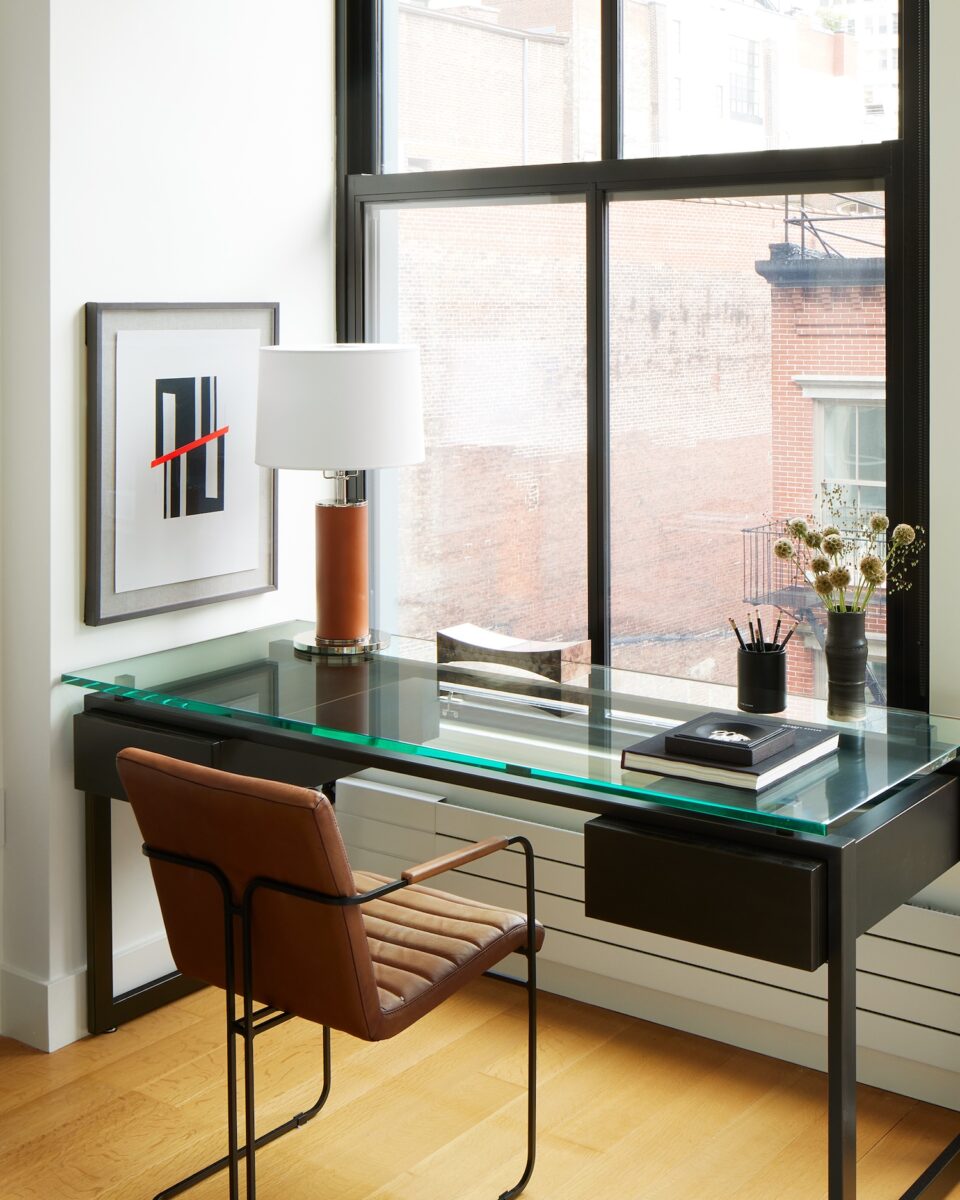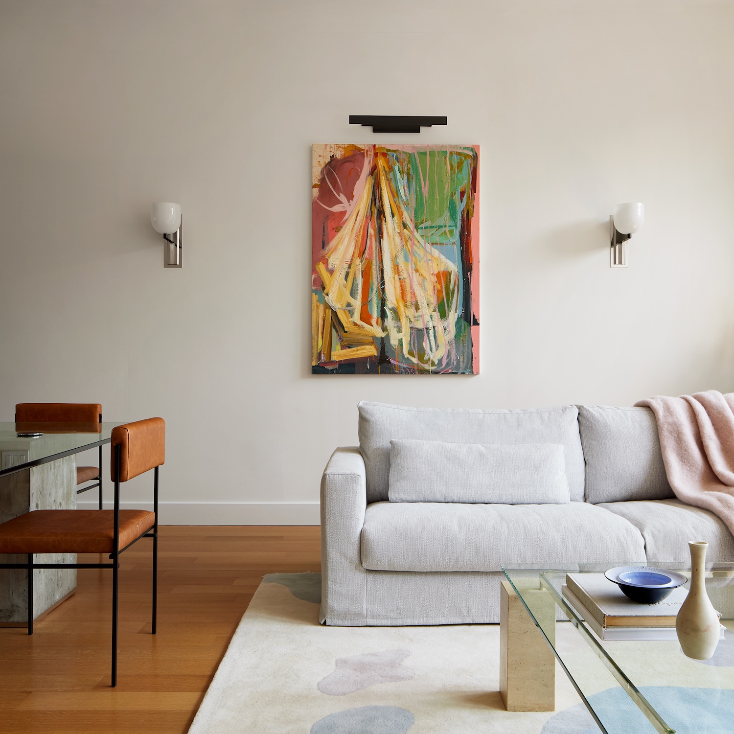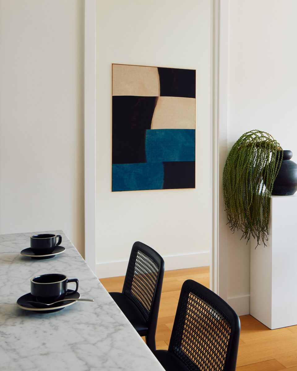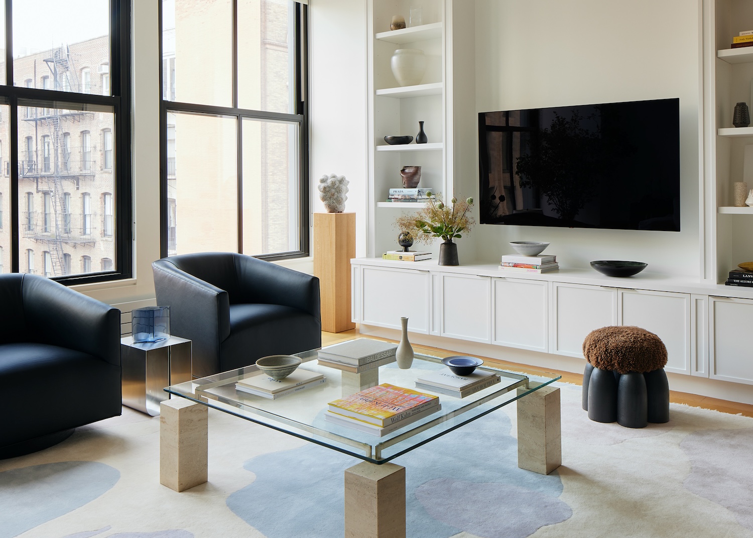 From Libarikian Interiors…This apartment is located in the heart of Soho and the tall windows and high ceilings give it a classic downtown vibes. Our client loved vintage mid-century furniture and wanted us to source one-of-a-kind pieces. For this project, my favorite part is the juxtaposition of the raw concrete and glass dining table, paired with an organic pastel-colored rug that we custom designed.