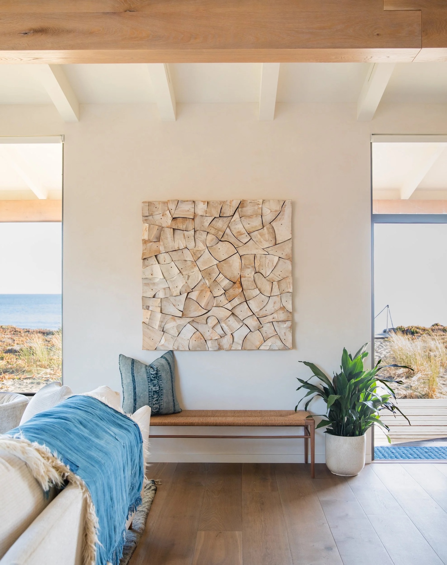 This was a deeply collaborative process. The homeowners, avid art lovers, enjoy exploring new artists and approaches. Many of the artworks displayed throughout the home are by friends and local discoveries, adding personal meaning to each space. A carved Alaskan wood sculpture, White Moon II by Joe Brubaker, anchors the living room, its forms echoing the movement of waves. Additional pieces by Plamen Tanev, Jeff Rutchik, and Carole Pierce complement the serene, coastal atmosphere.