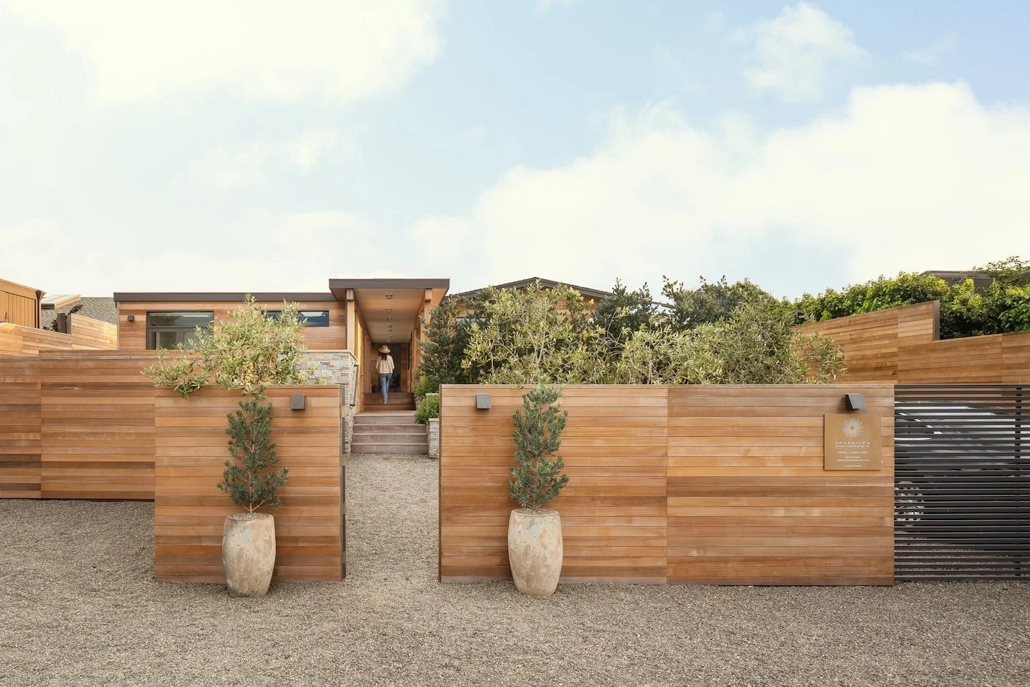 Outdoors, every space was designed with purpose. From relaxed lounging areas to intimate gathering spots, each corner invites connection with nature. The limestone patios and planter box caps from Eco Outdoor were chosen to mirror the hue of the beach sand. Native and low-water plants thrive effortlessly, supporting pollinators like hummingbirds, butterflies, and bees. The materials palette—clear Western red cedar cladding, ledgestone walls, and locally sourced furnishings—ties the design back to its Northern California roots.