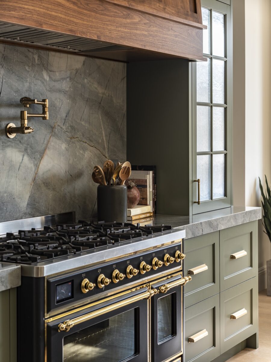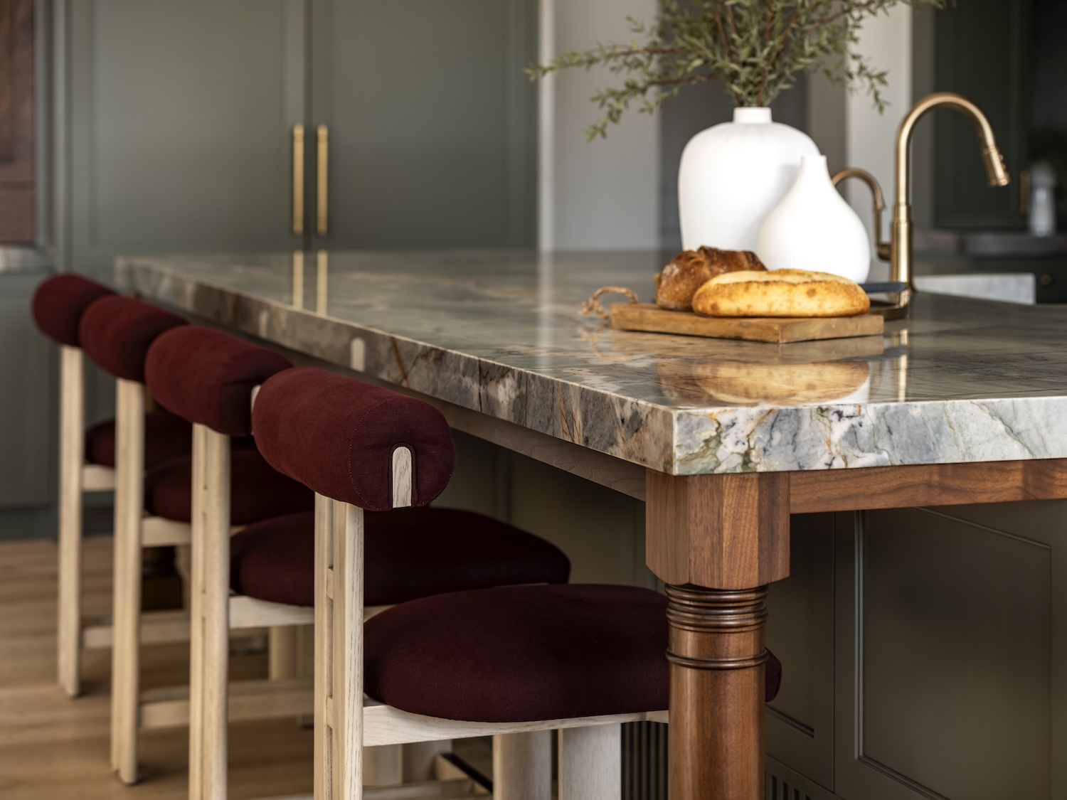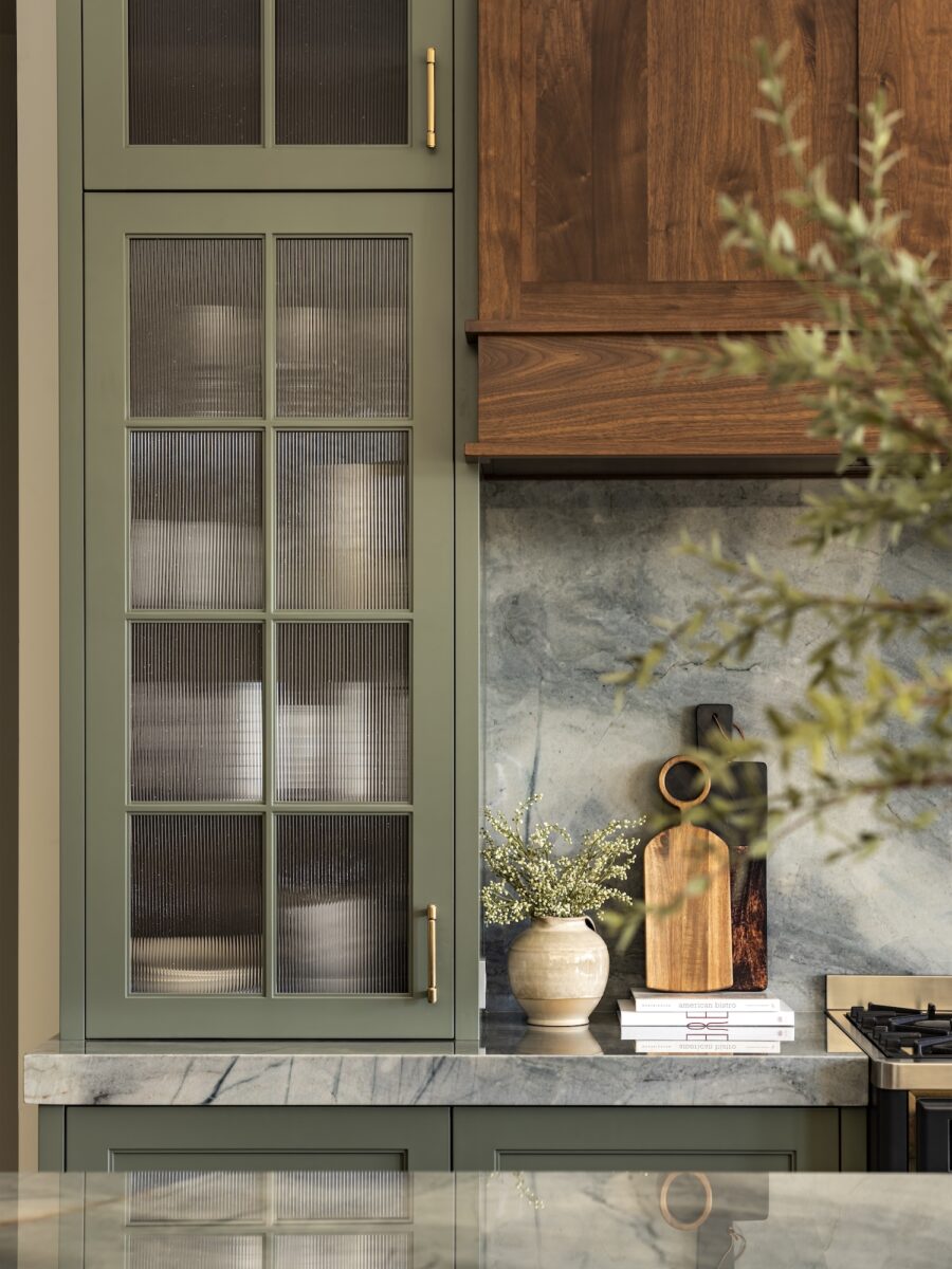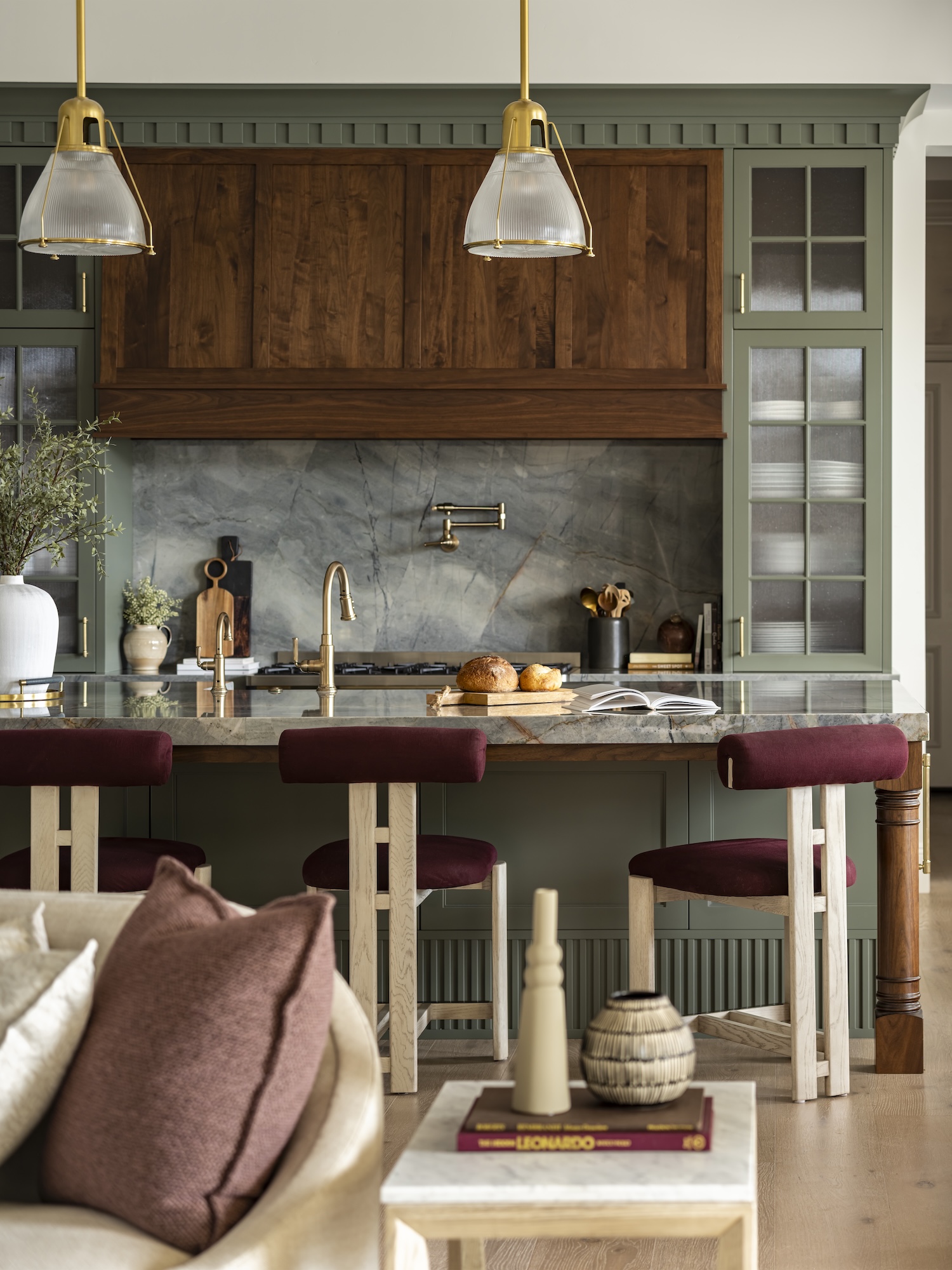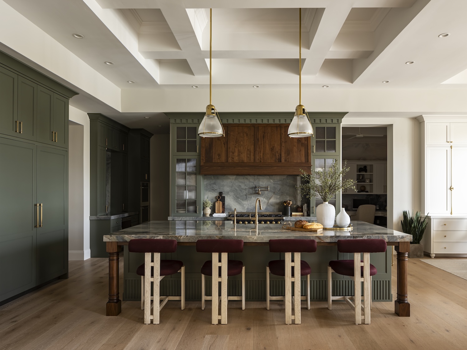 The kitchen became the heart of the transformation. We kept the gorgeous bones, including the coffered ceilings, tall cabinetry, and large island, but elevated them with richer, more personal details. Two-tone cabinetry in warm wood and moody green added depth, while a dramatic blue-grey marble slab backsplash created a clean, high-impact focal point. Reeded glass, dentil molding, and warm brass accents were introduced to soften the space and add dimension.