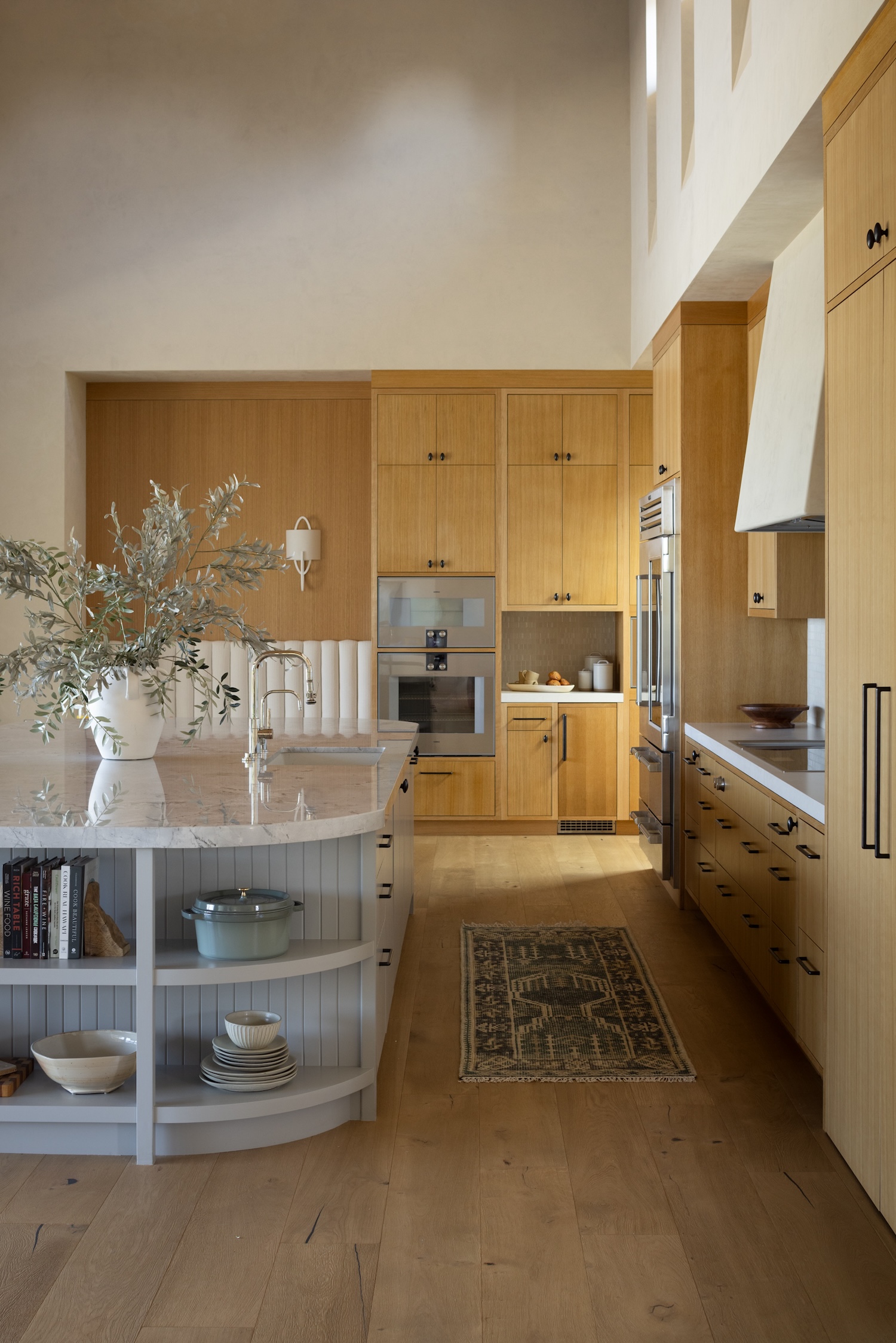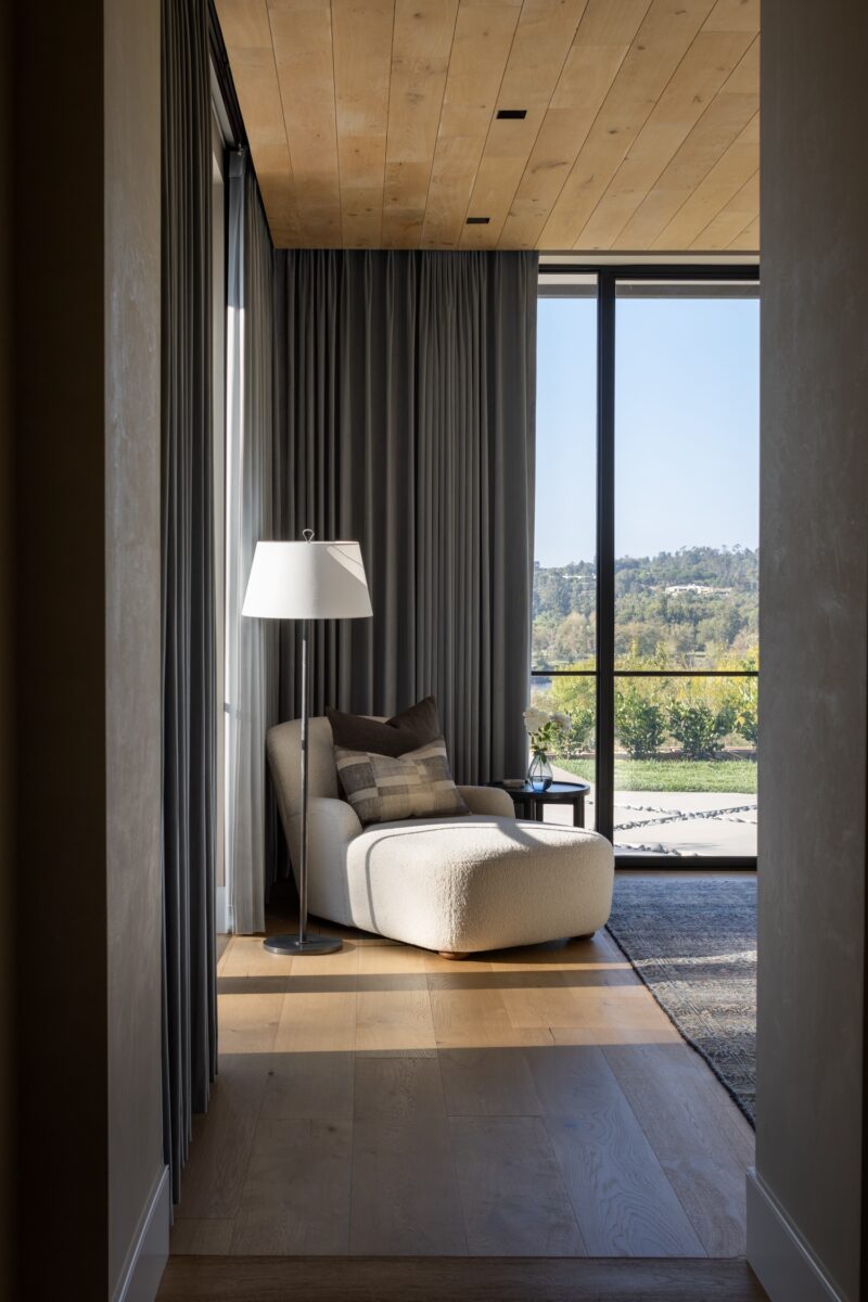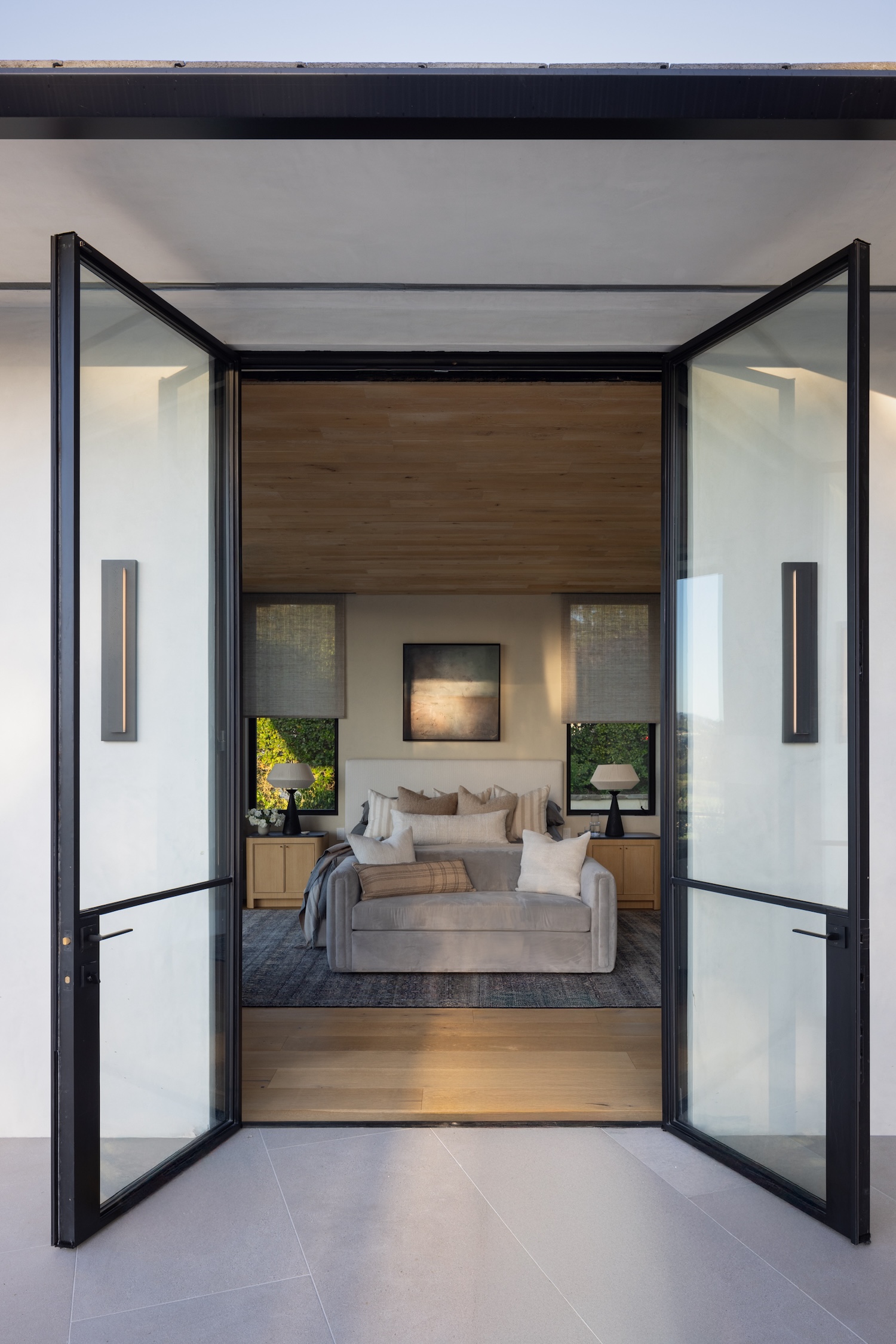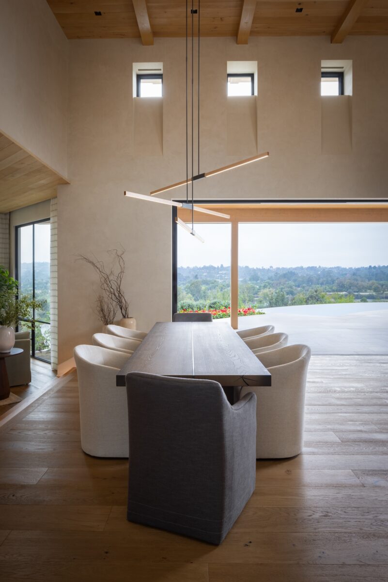 Our favorite space in this project is the great room, an expansive layout that combines the living, dining, and kitchen areas. As you enter through a beautifully crafted pivot door, finished with Shou Sugi Ban—a traditional Japanese technique that preserves wood by artfully charring its surface, creating a rich, dark, and textured finish, you’re welcomed into an inviting, cohesive environment. The custom linen-colored plaster walls and warm flooring create a tranquil, understated backdrop, enhanced by mood lighting that brings a soft glow to the space. The sunken living room, framed by tall custom iron windows and draped with sheer Otis curtains, draws you in with its cozy elegance. In the dining and kitchen areas, breathtaking views overlook the zero edge pool and nearby stables with grazing horses, grounding the space in natural beauty. It’s a room that blends style and functionality effortlessly, making it both a central gathering spot and an idyllic retreat.