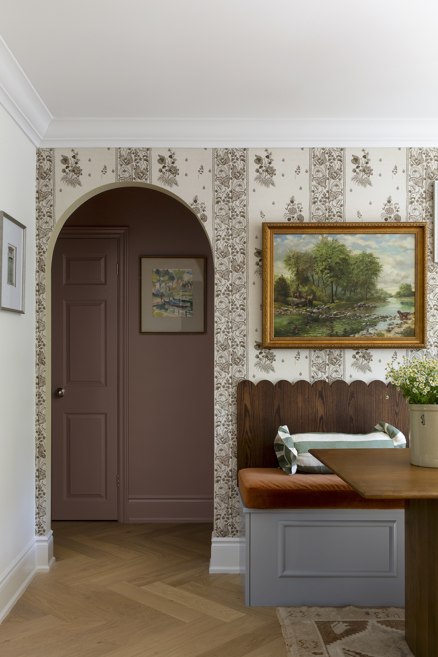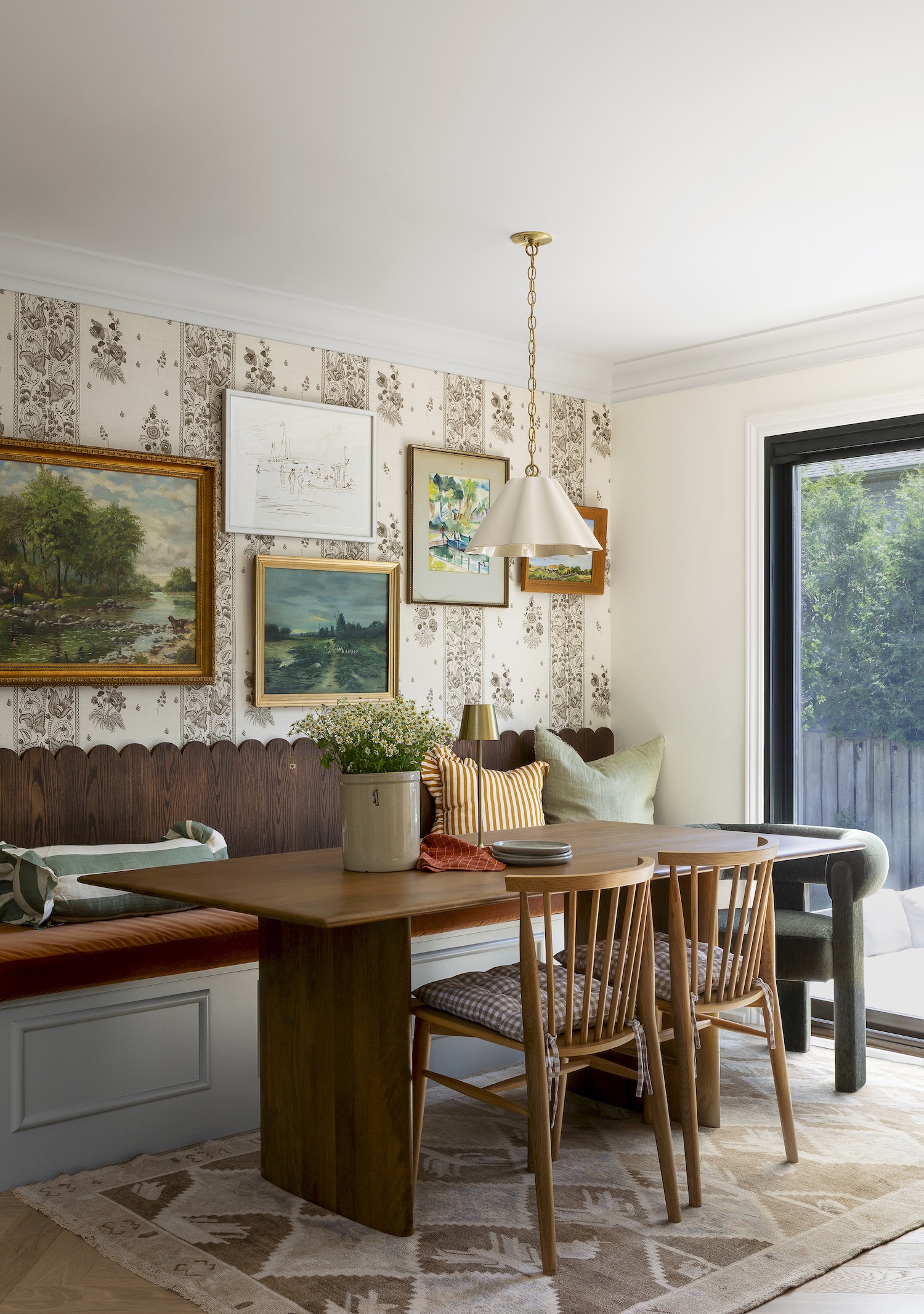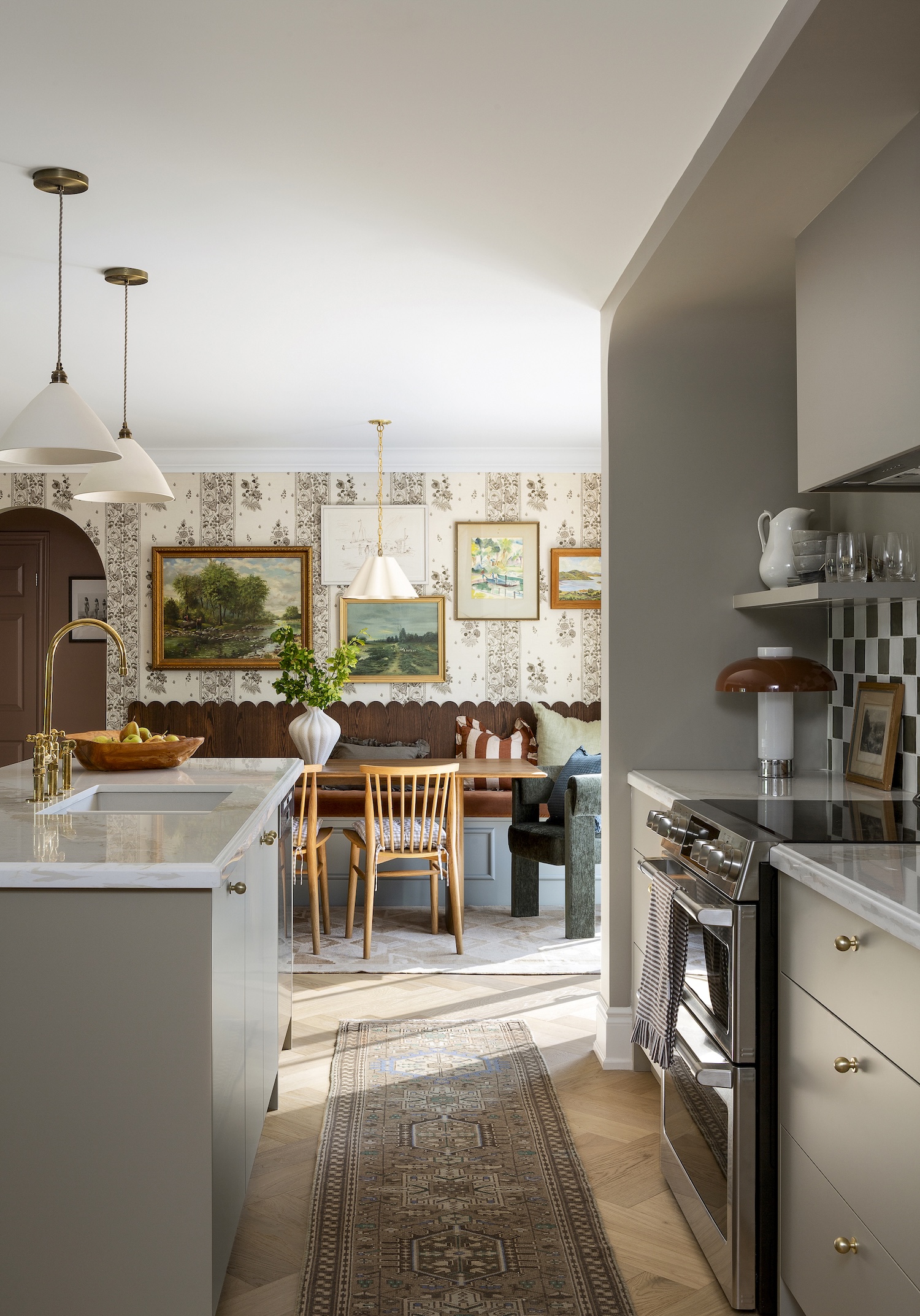 To bring in the clients’ love of eclectic style, we layered the space with thoughtful details: wallpaper, a backbench, and a curated gallery wall. The result is a warm, personalized home that feels lived-in and loved — full of charm, character, and function.