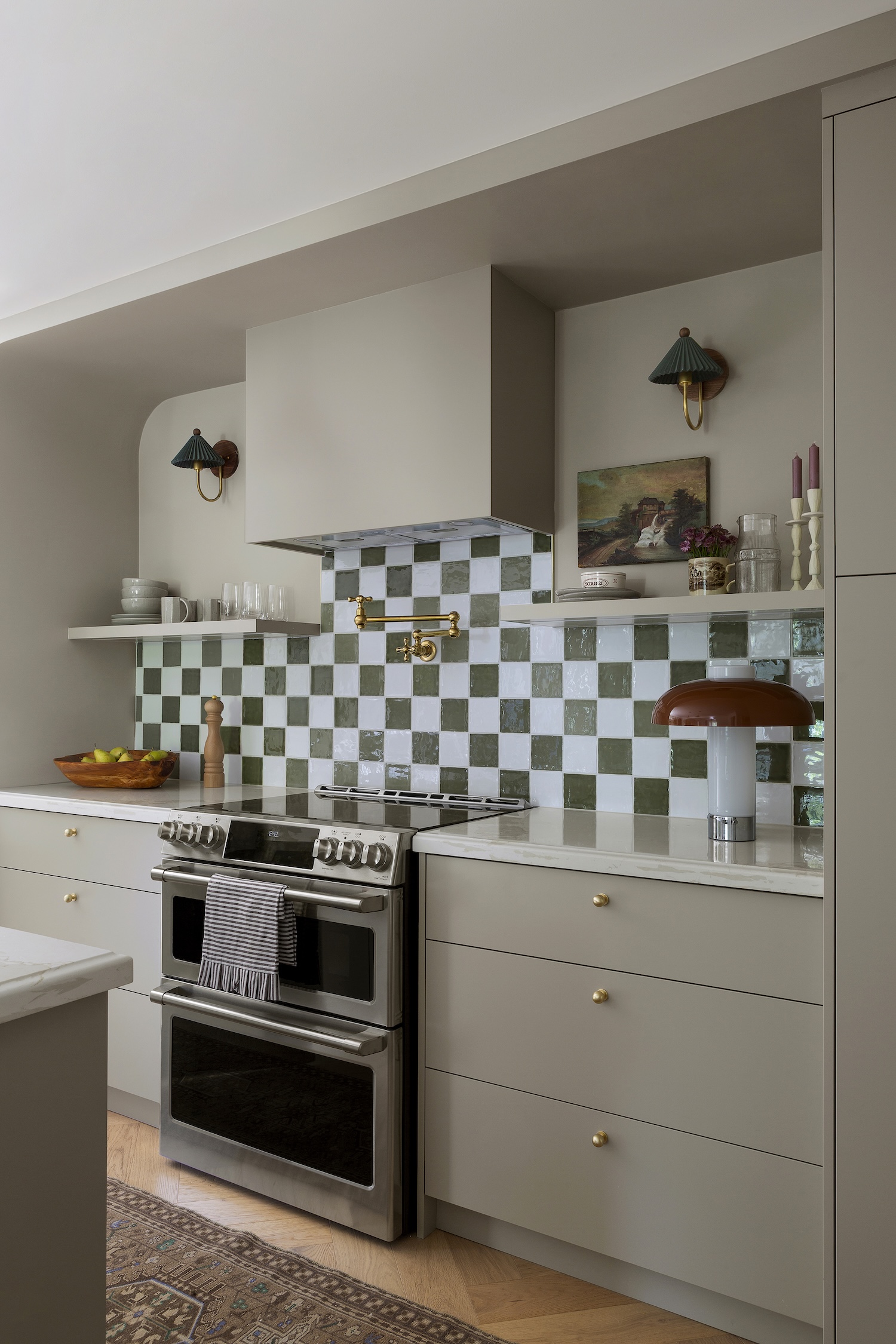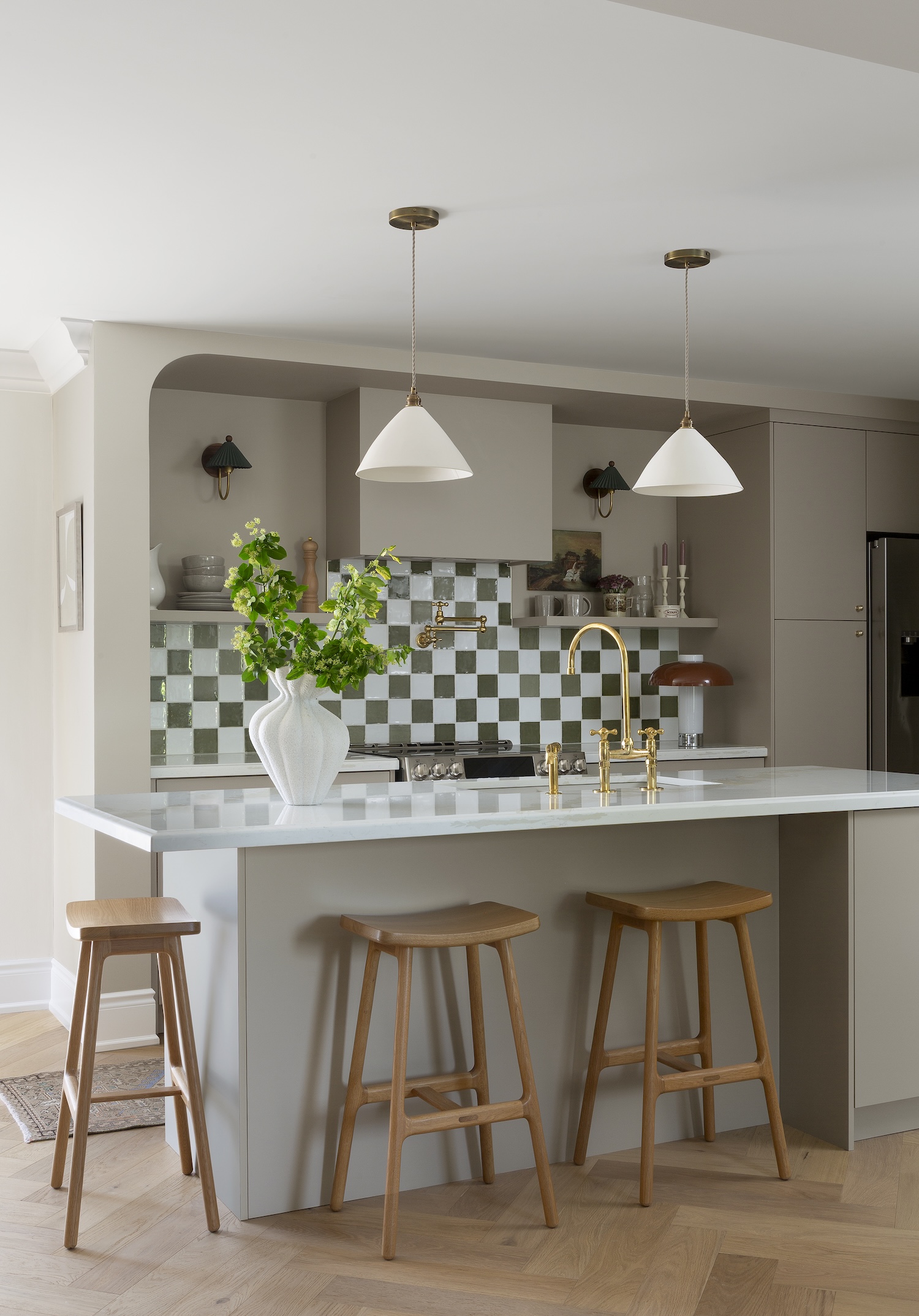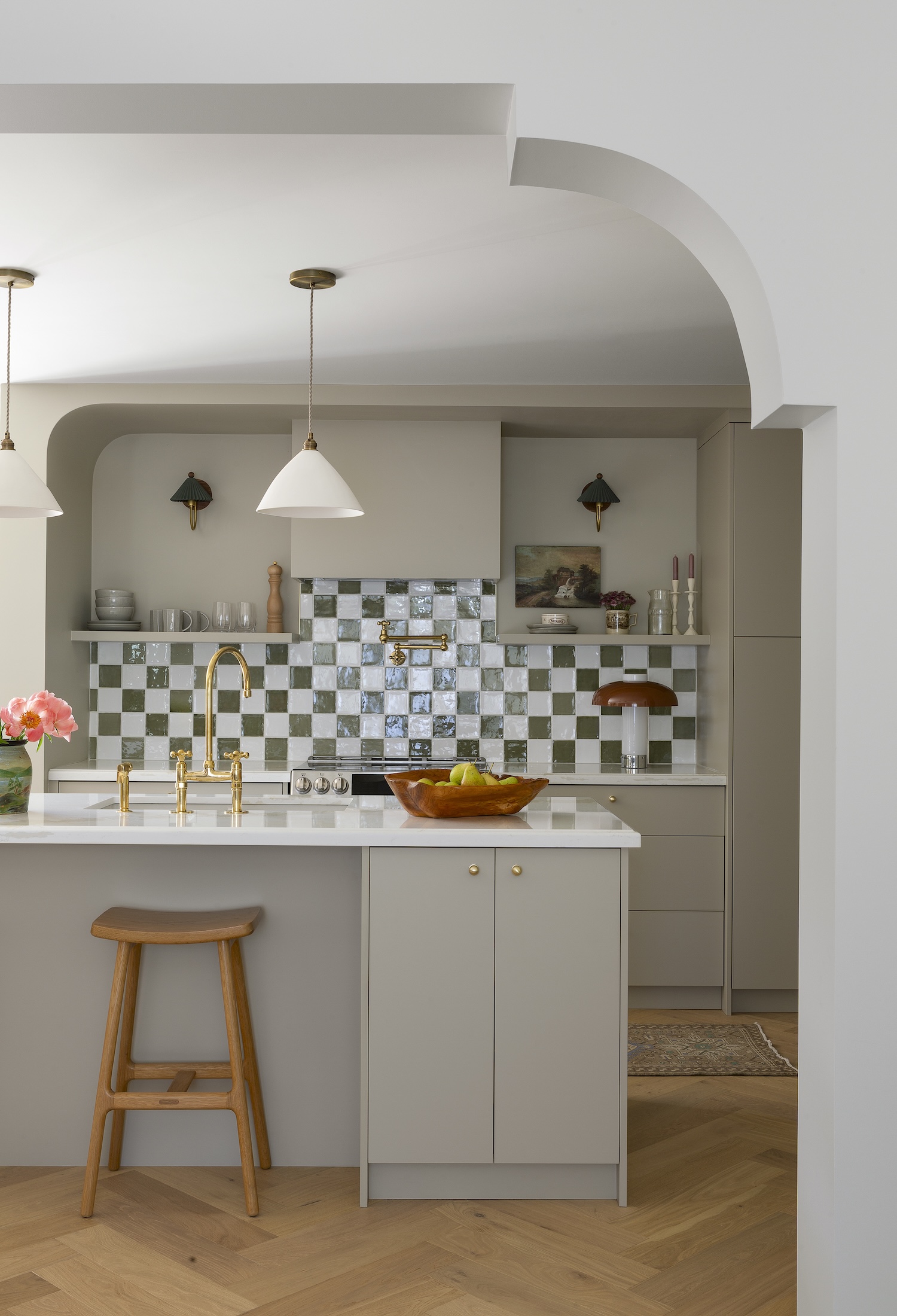 This new layout allowed us to center the range, creating a natural focal point with visual symmetry. We also flanked the new fridge with pantry cabinets to maximize storage. One of my favorite design moments was disguising the HVAC wall with a curved architectural detail. We echoed that same curve on the opposite side of the room, giving the space balance and intentionality — what once felt like an obstacle became a defining design element.
