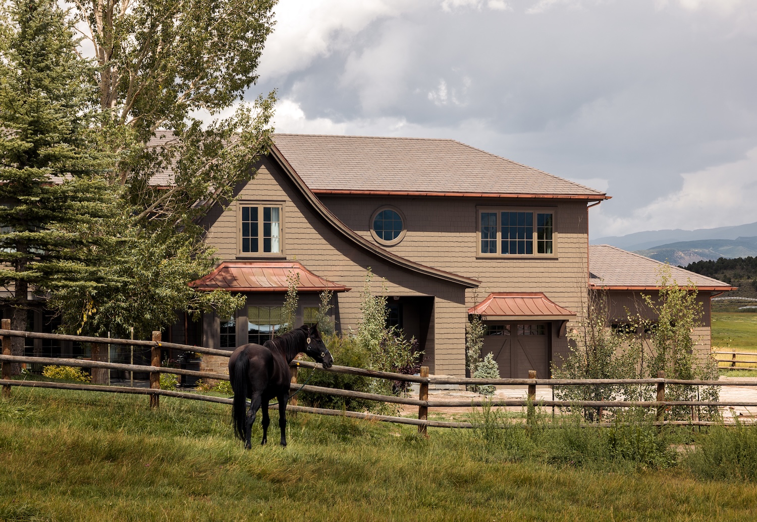 Given the home is surrounded by grasslands and pastures, the architecture team bucked the current trends for rustic mountain homes and leaned into a design that felt more pastoral. The living spaces feature large windows and doors that are oriented toward the view of the San Juan Mountains, opening onto the flagstone patio space. Two established Cottonwood trees anchor the home in the landscape. The clients identified this place under the trees as their favorite spot on the site. Now an outdoor fireplace, built-in BBQ and retractable sunshade make this space usable all year long.