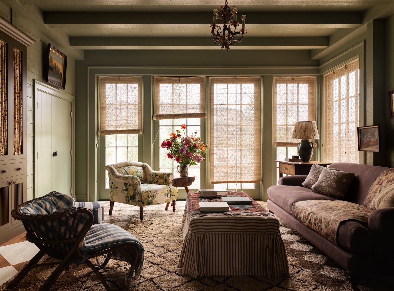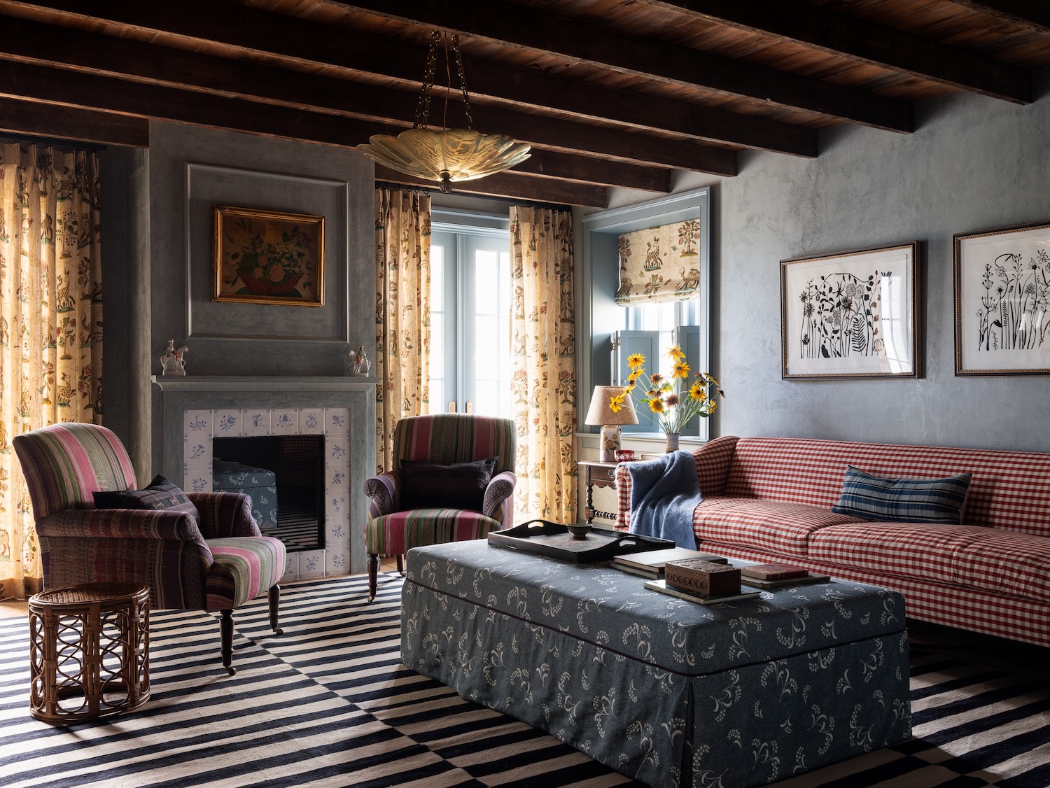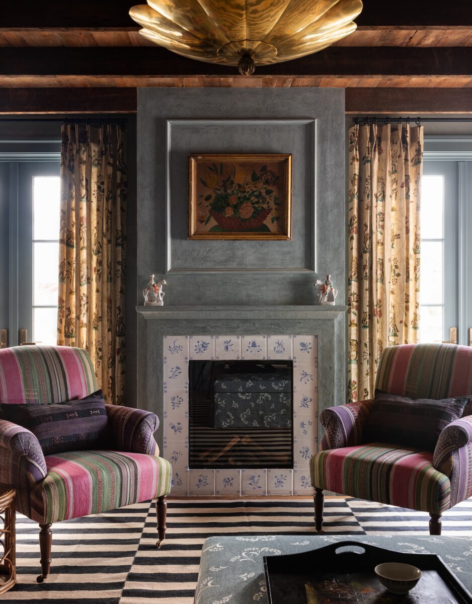 The blue limewashed family room is a family favorite with a cozy fireplace and wonderfully playful patterns and reclaimed beams. The perfect place to gather for a movie night.