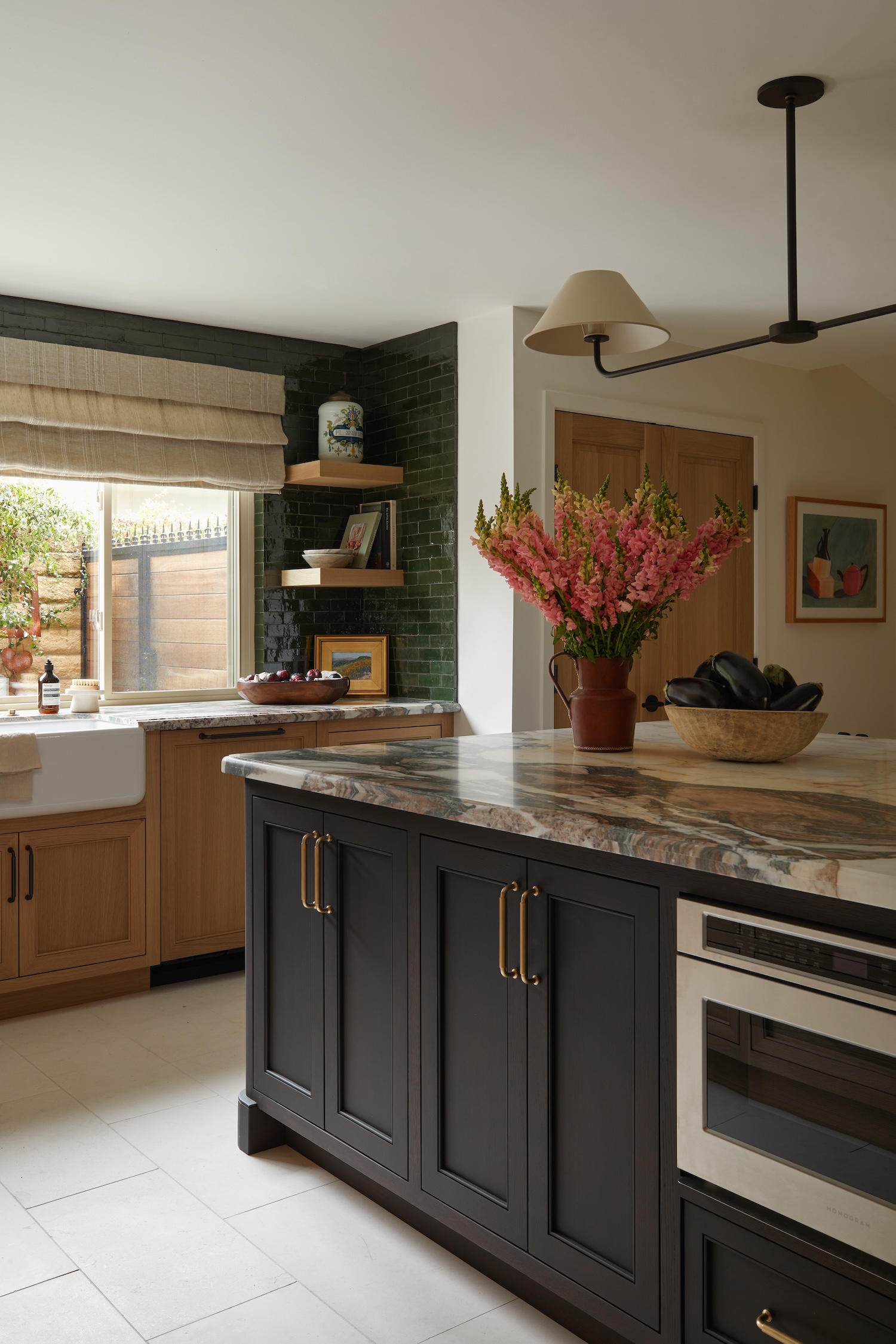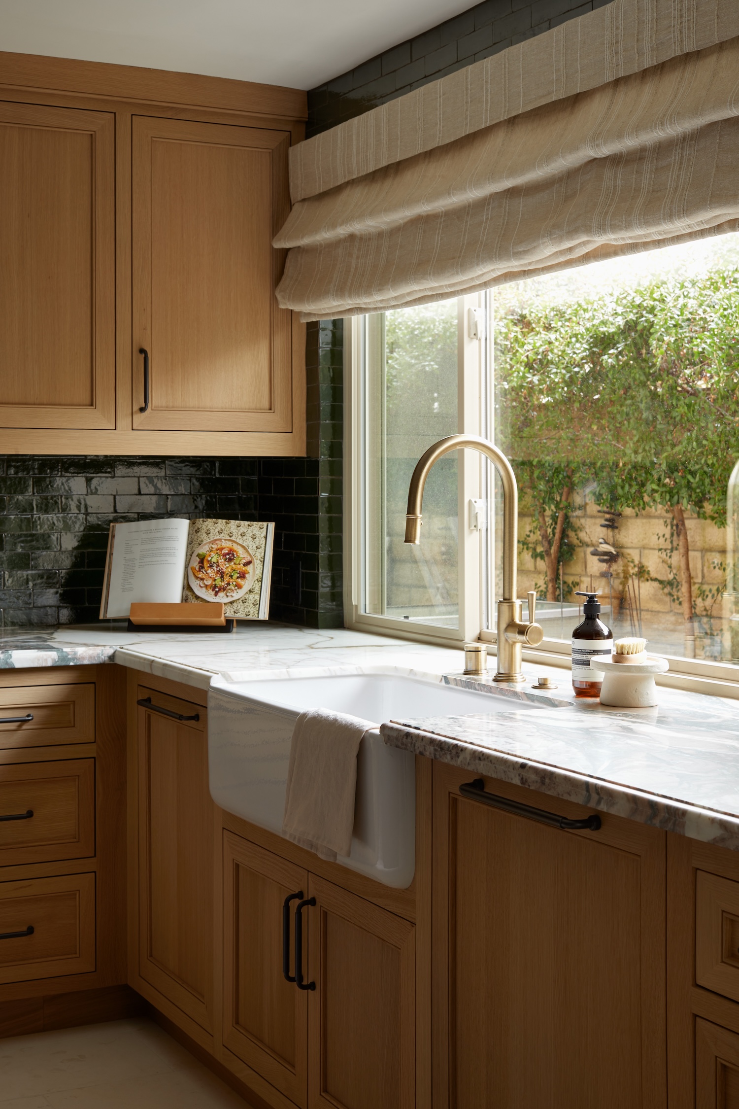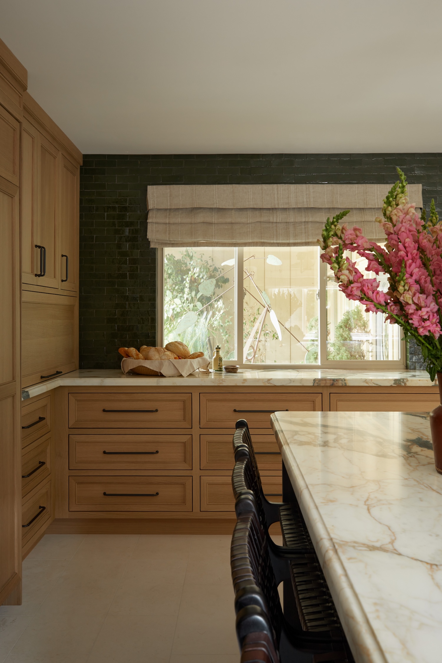 From a design standpoint, we really leaned into all natural and non-toxic materials. We sourced limestone that we had cut into tiles for the flooring, marble counters, white oak cabinets, Italian linen shades, Zellige tile, and all solid brass plumbing and hardware.