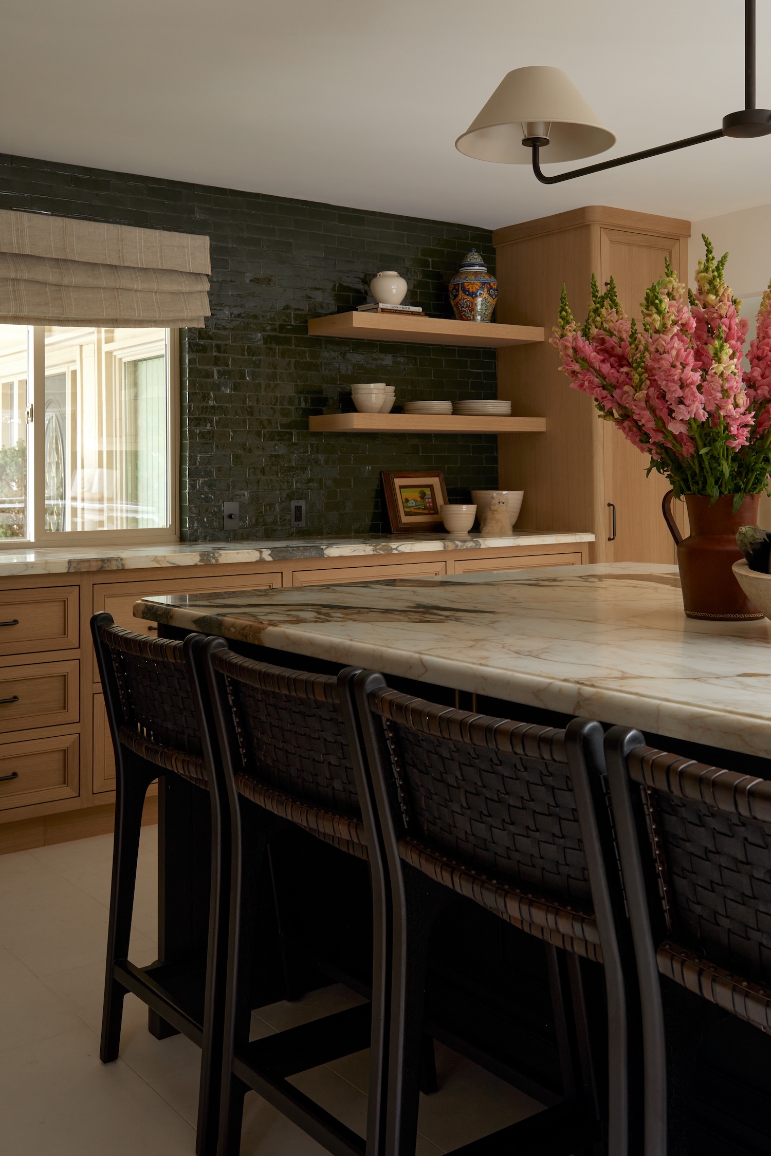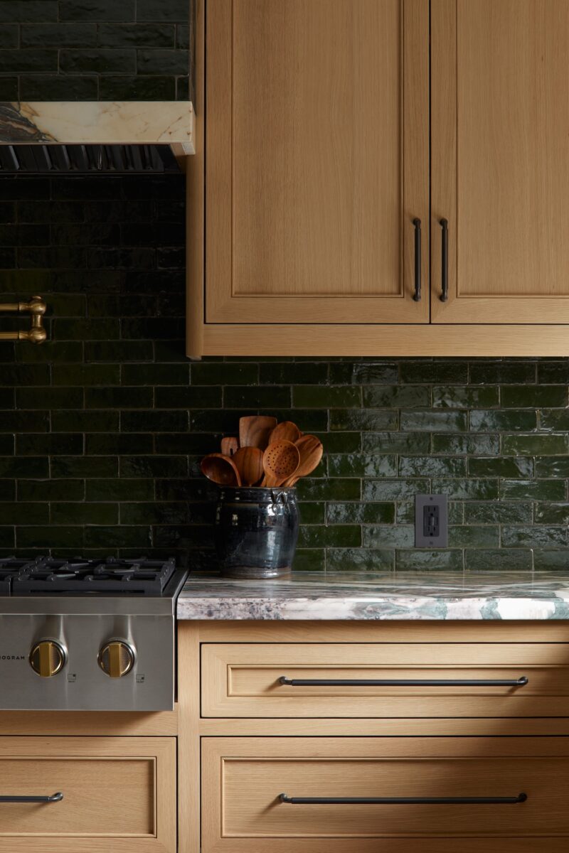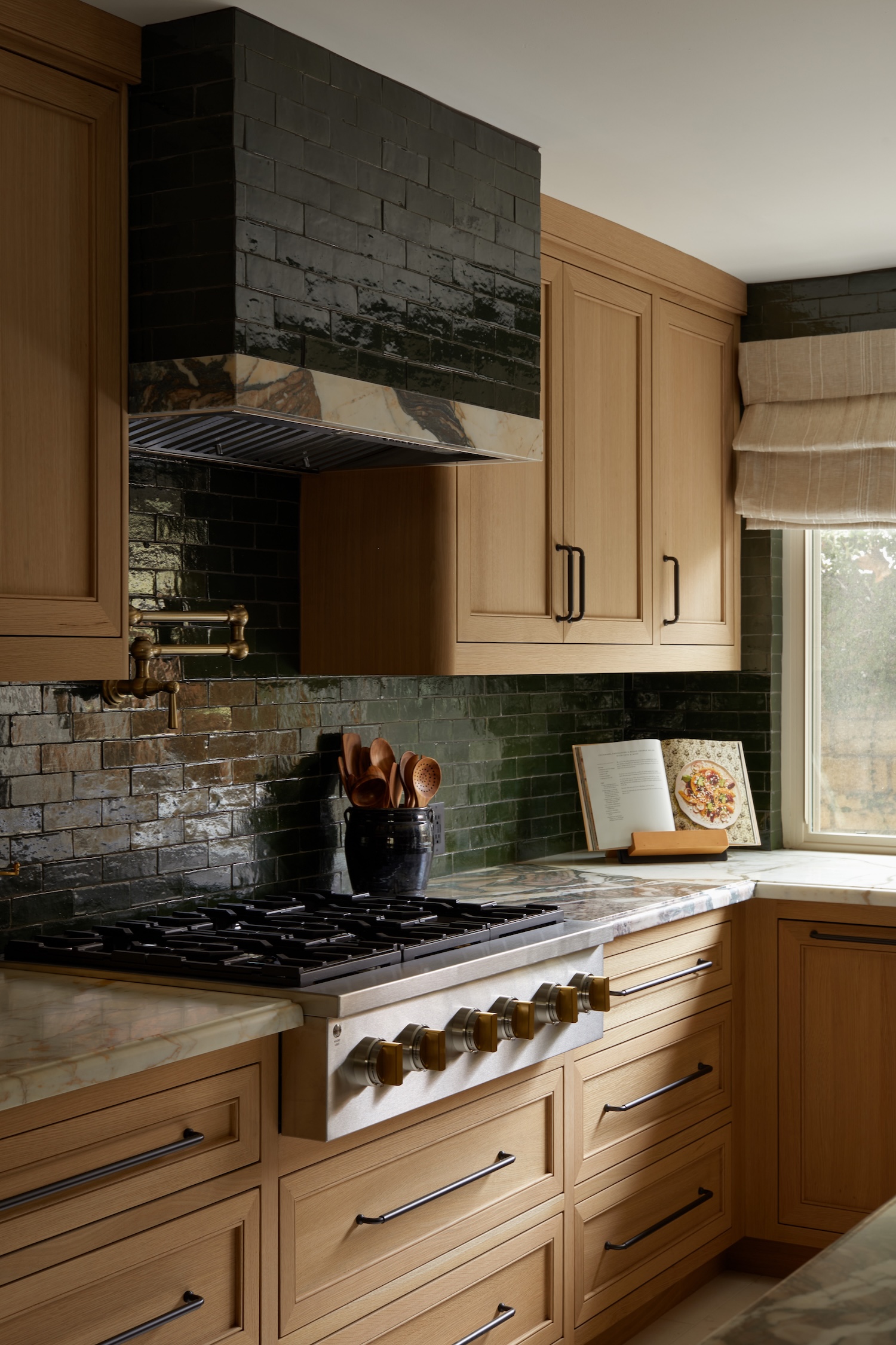 From a design standpoint, we really leaned into all natural and non-toxic materials. We sourced limestone that we had cut into tiles for the flooring, marble counters, white oak cabinets, Italian linen shades, Zellige tile, and all solid brass plumbing and hardware.