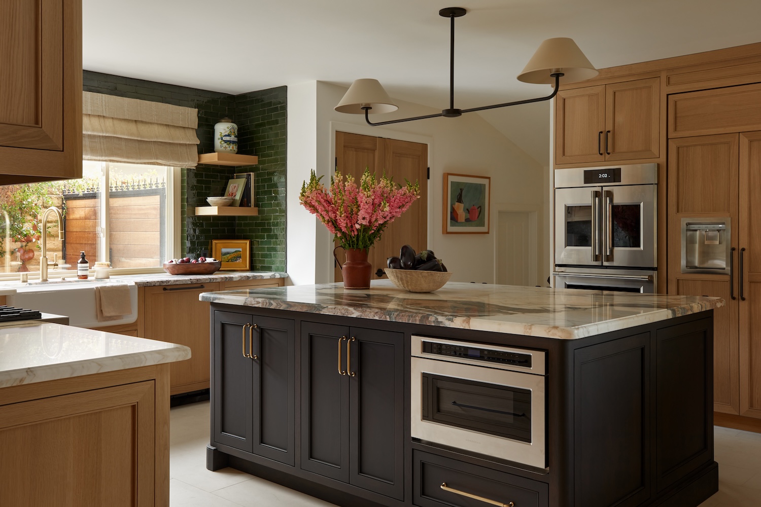 Blending timeless charm with a touch of contemporary flair, this Westlake Village renovation by Ethan Charles Design transformed a dated space into his clients’ forever home. Photographed by Public311 , the kitchen showcases the designer’s creative freedom, with warm, traditional details, curved edges, and natural materials that make the space both beautiful and livable.