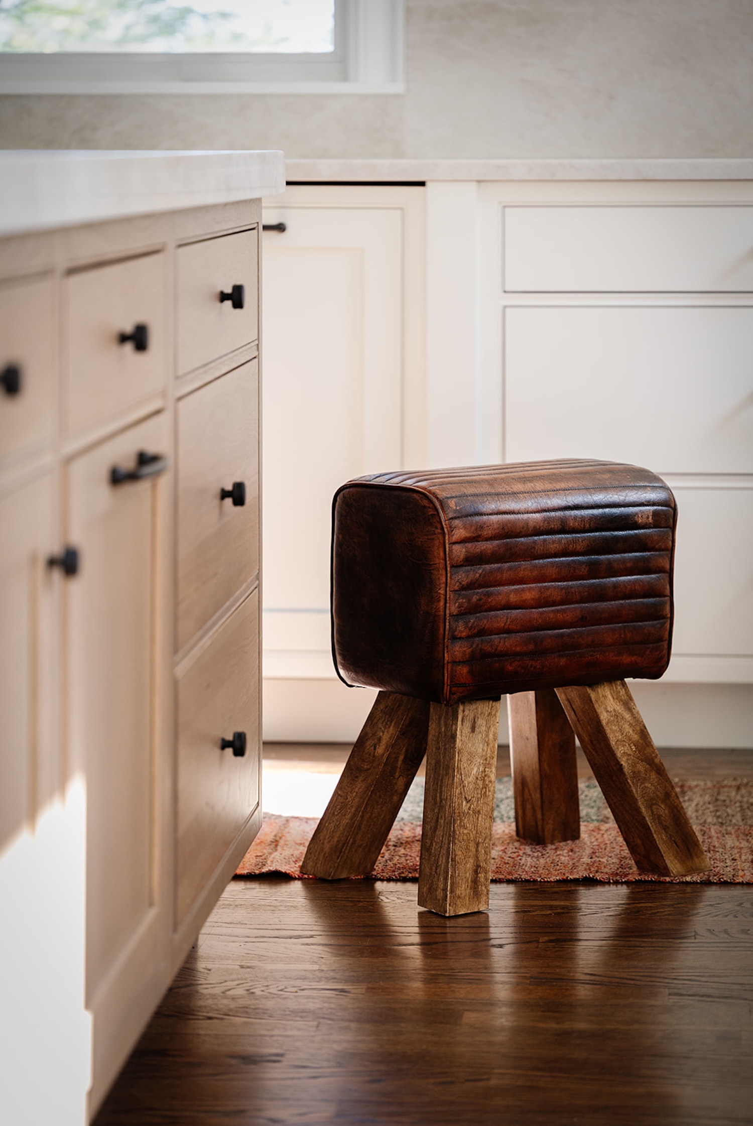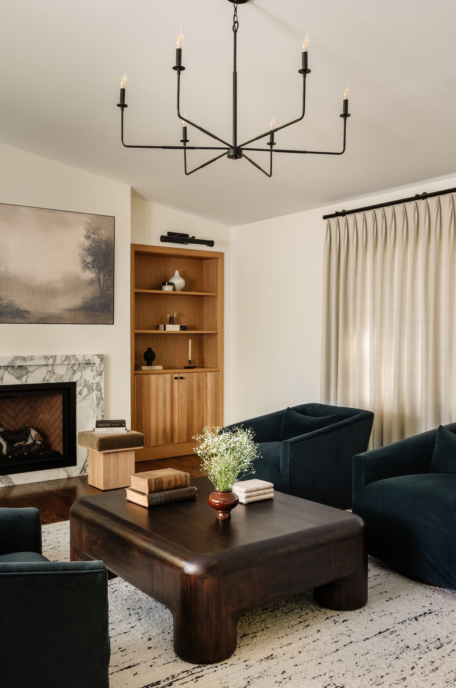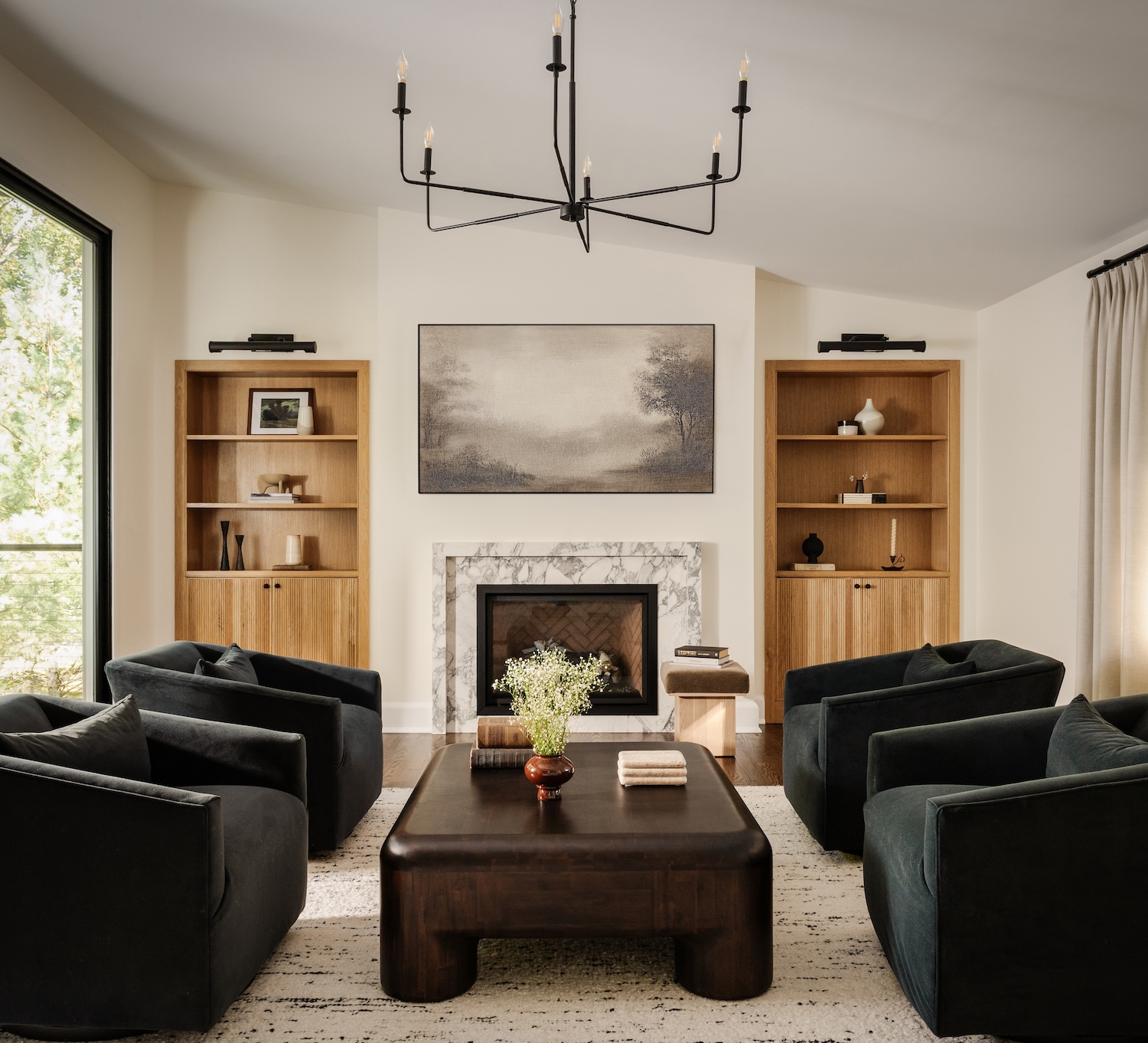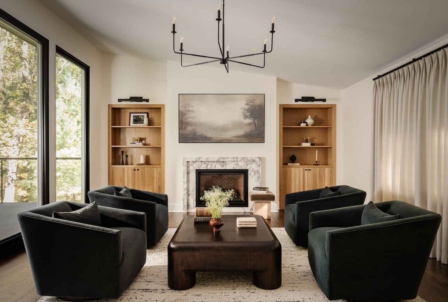 One of the primary challenges was the architecture itself. Angled walls and awkward transitions interrupted sightlines and made furniture placement feel forced. We reworked the layout to create clearer geometry and stronger focal points, bringing balance and intention to the main living areas. Custom built-ins now frame the fireplace with symmetry, while the kitchen was redesigned for both efficiency and gathering.