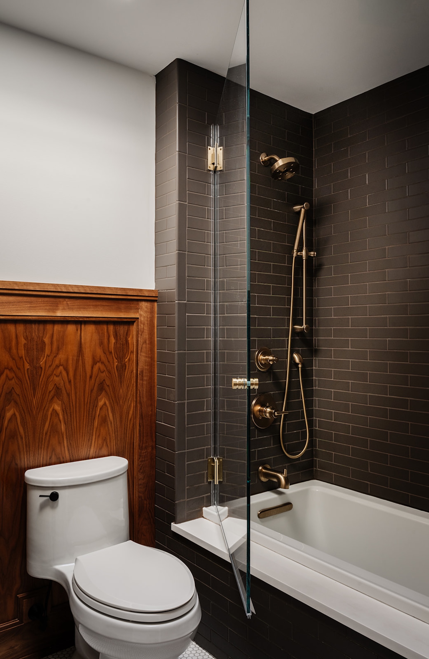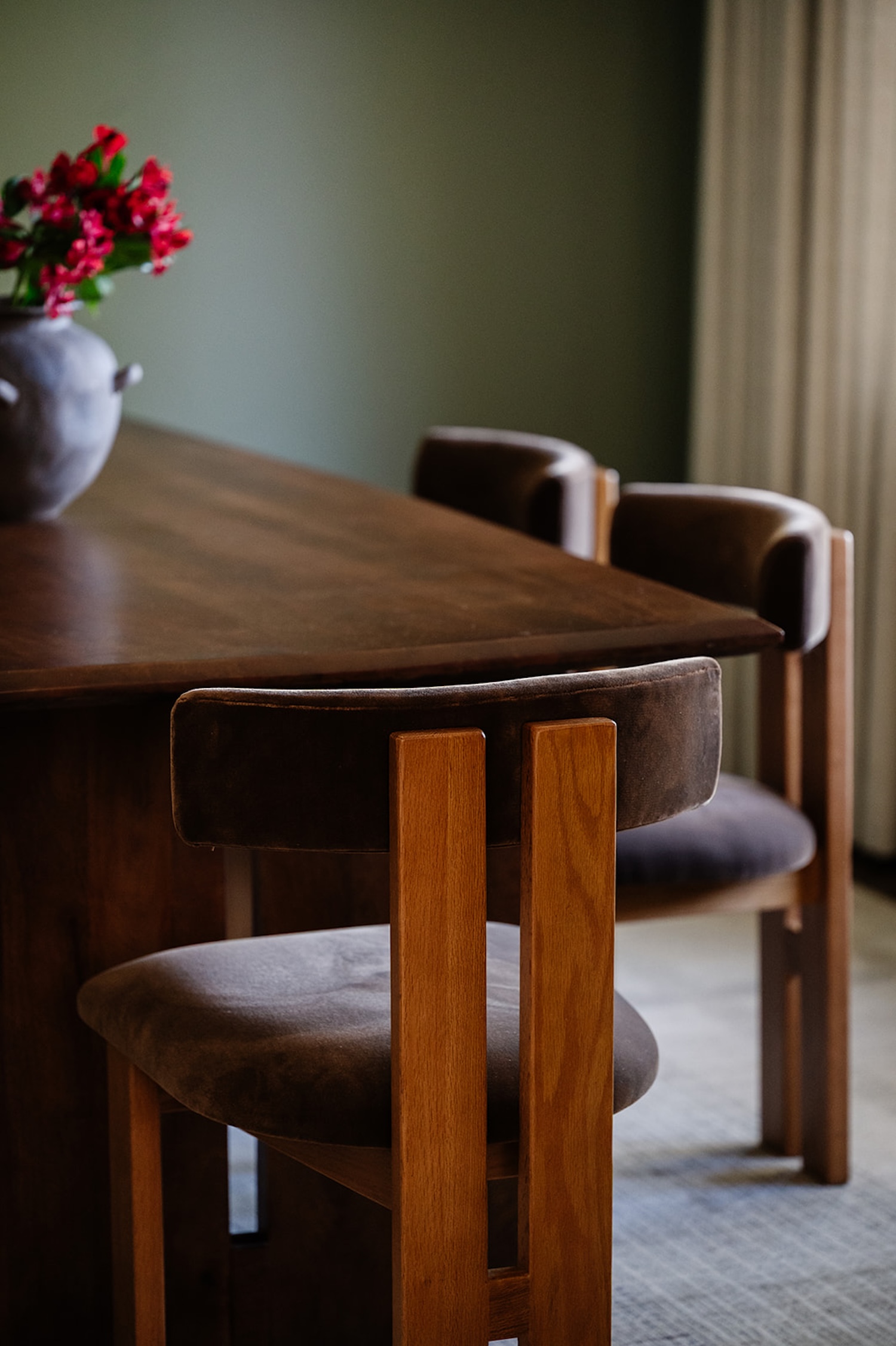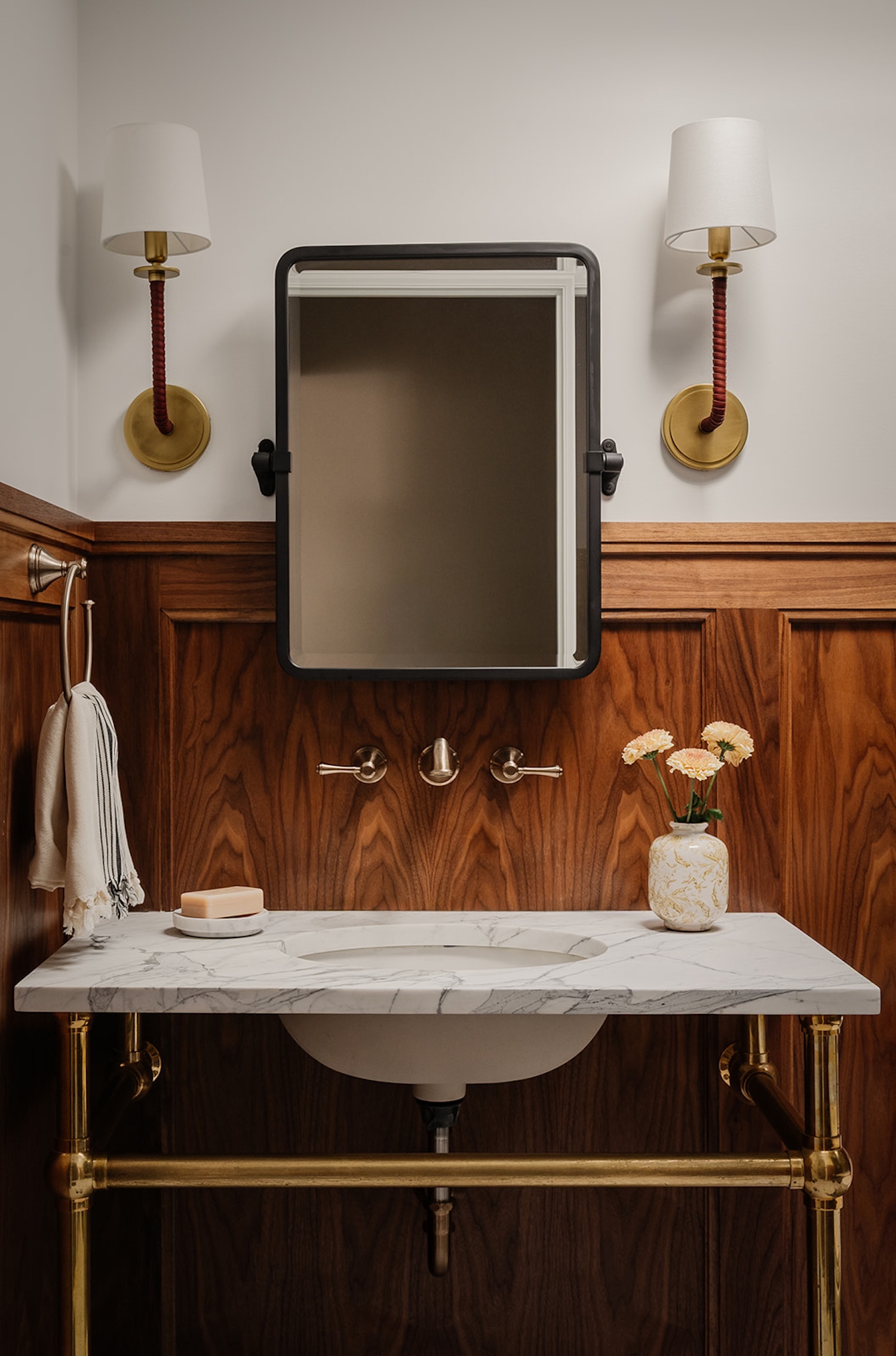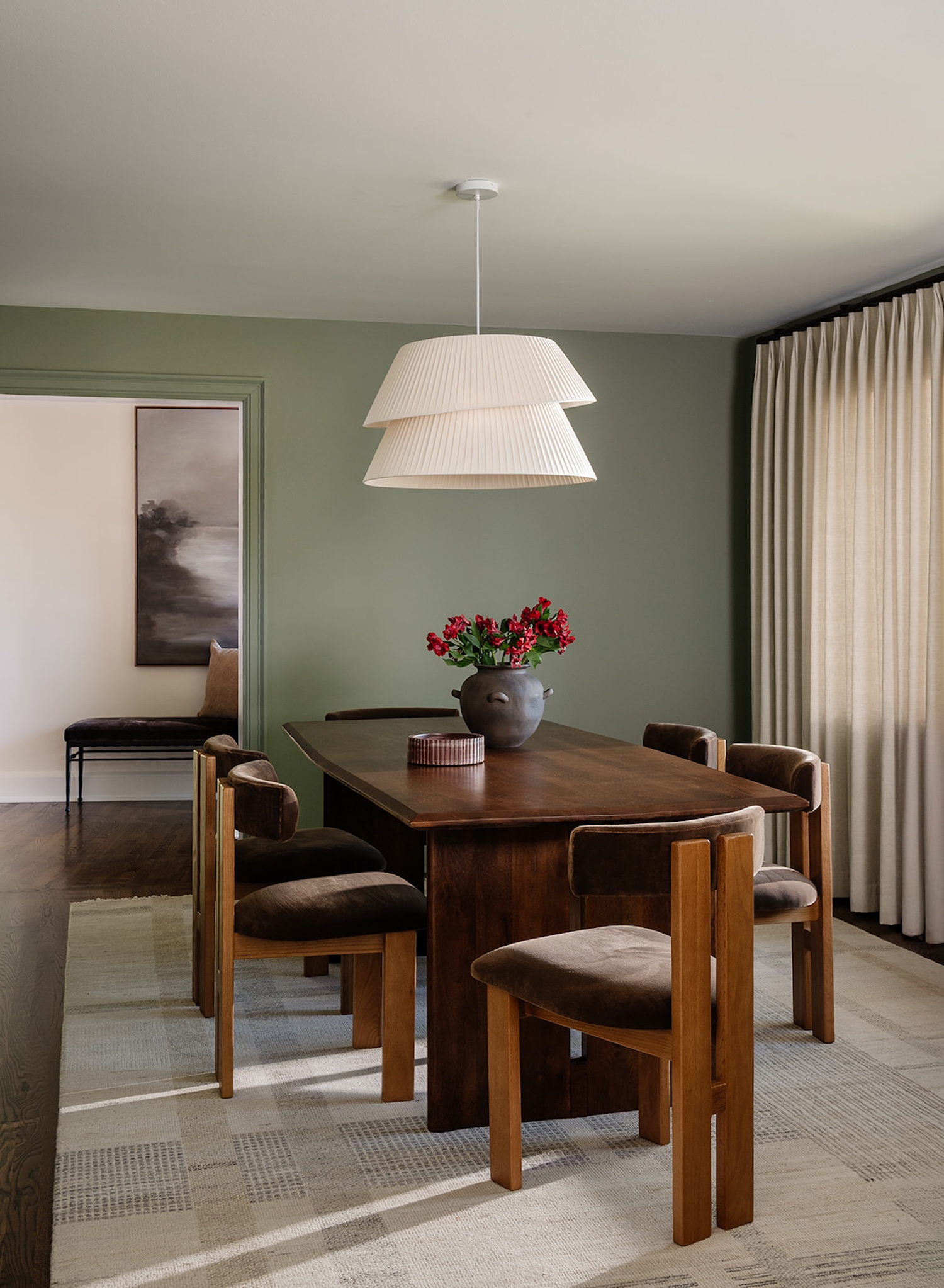 Materiality guided the design from start to finish. Walnut millwork adds warmth and architectural depth throughout, most notably in the hall bathroom, where it wraps the space in a rich, tailored envelope. Aged brass hardware and honed marble surfaces introduce quiet refinement, while layered textiles soften the more structured elements. The moody olive dining room brings contrast and intimacy to the lighter surrounding spaces.