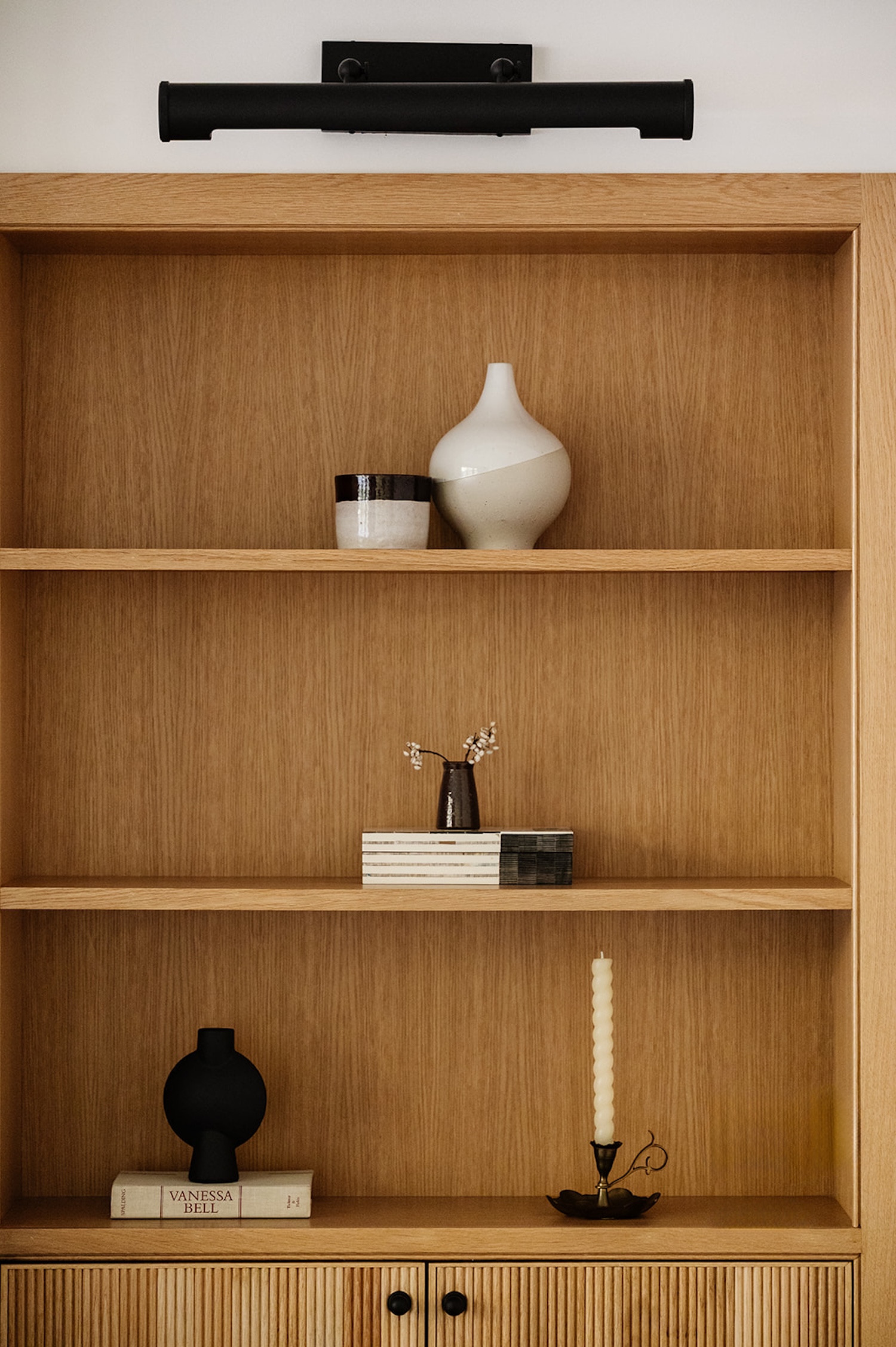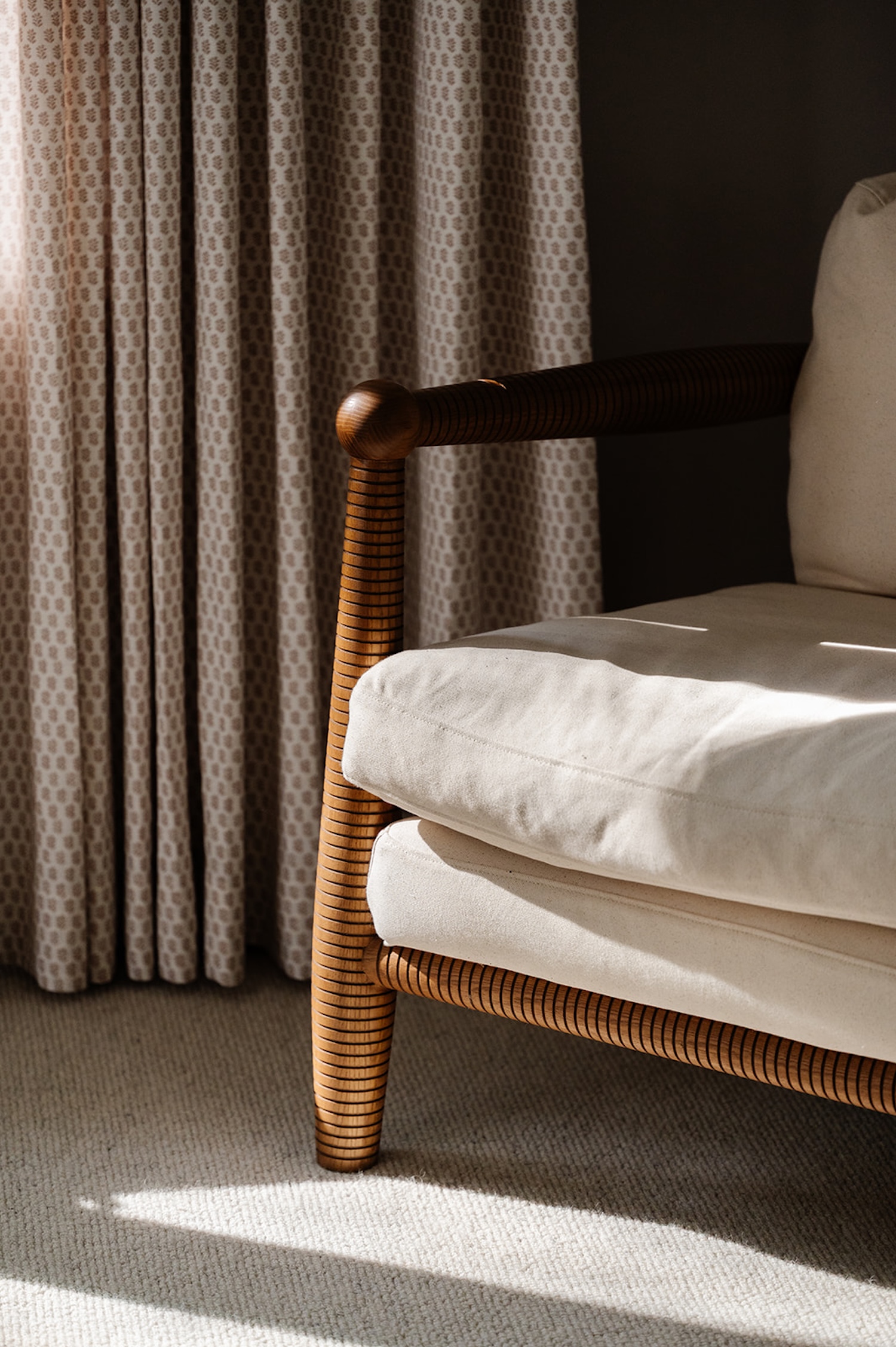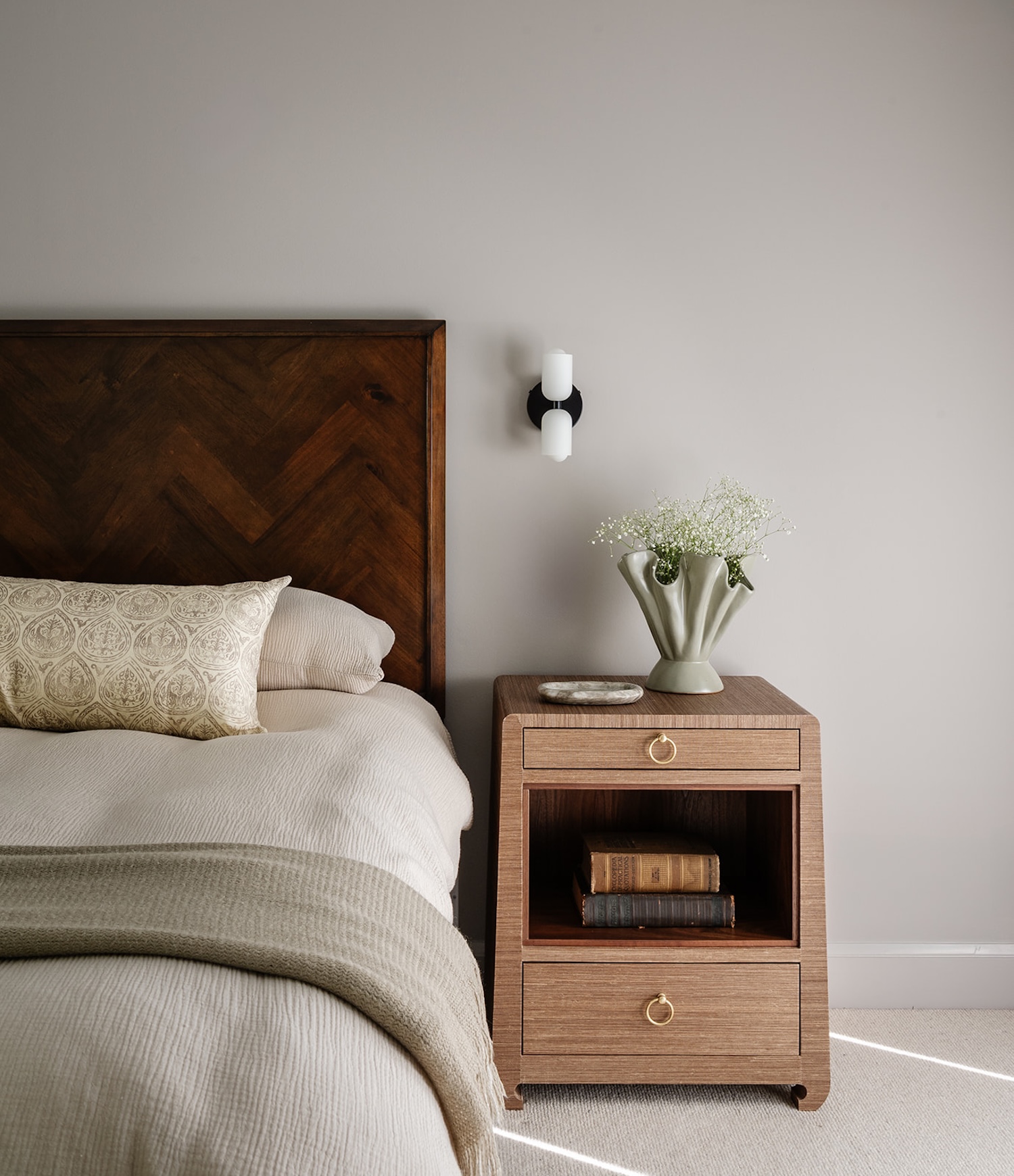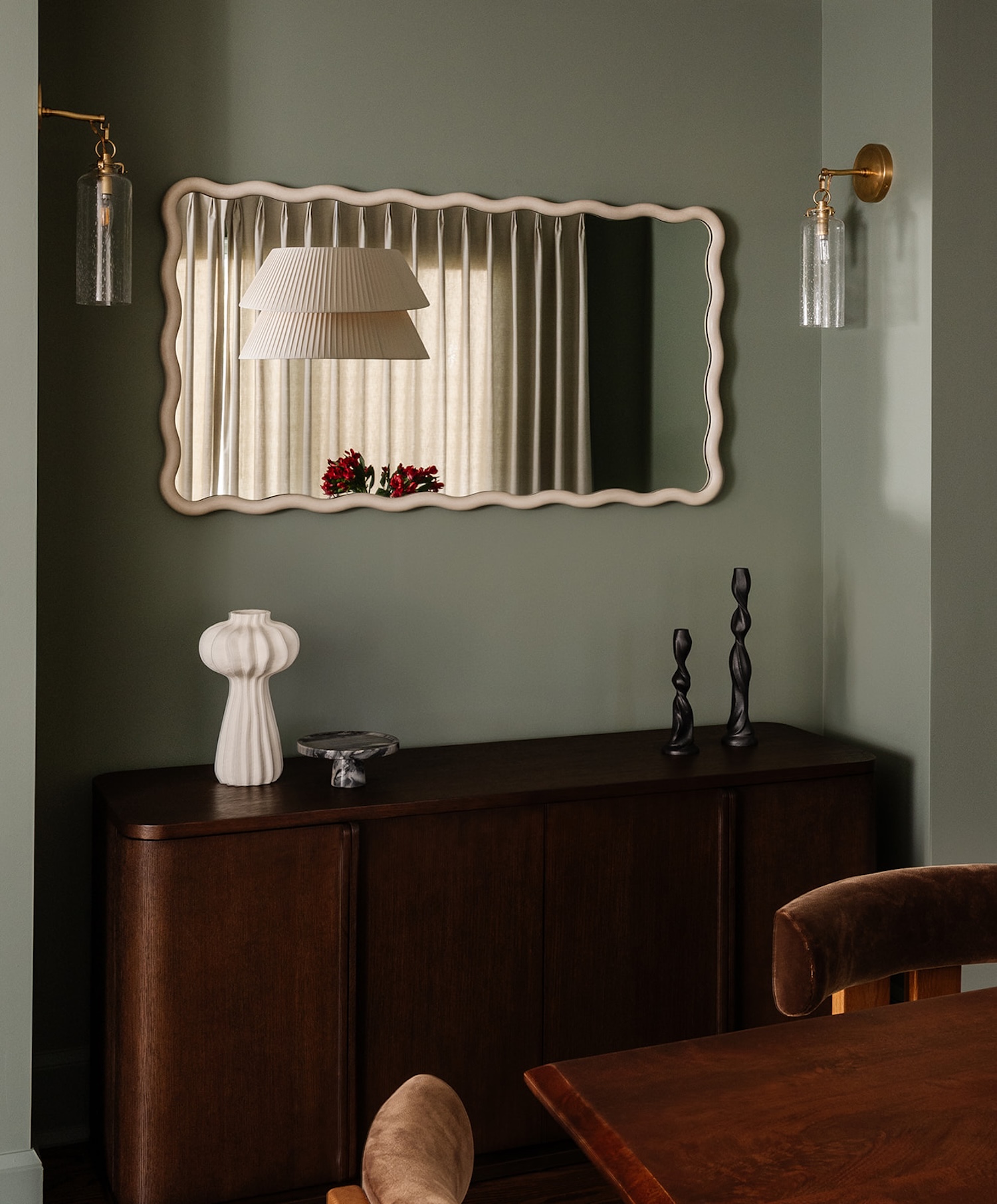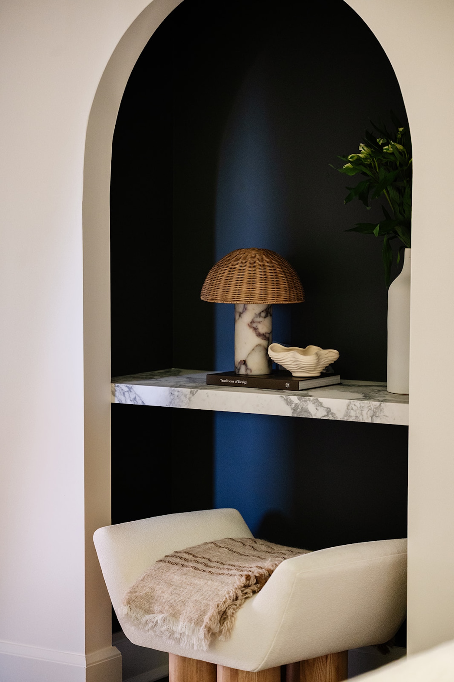 Materiality guided the design from start to finish. Walnut millwork adds warmth and architectural depth throughout, most notably in the hall bathroom, where it wraps the space in a rich, tailored envelope. Aged brass hardware and honed marble surfaces introduce quiet refinement, while layered textiles soften the more structured elements. The moody olive dining room brings contrast and intimacy to the lighter surrounding spaces.
