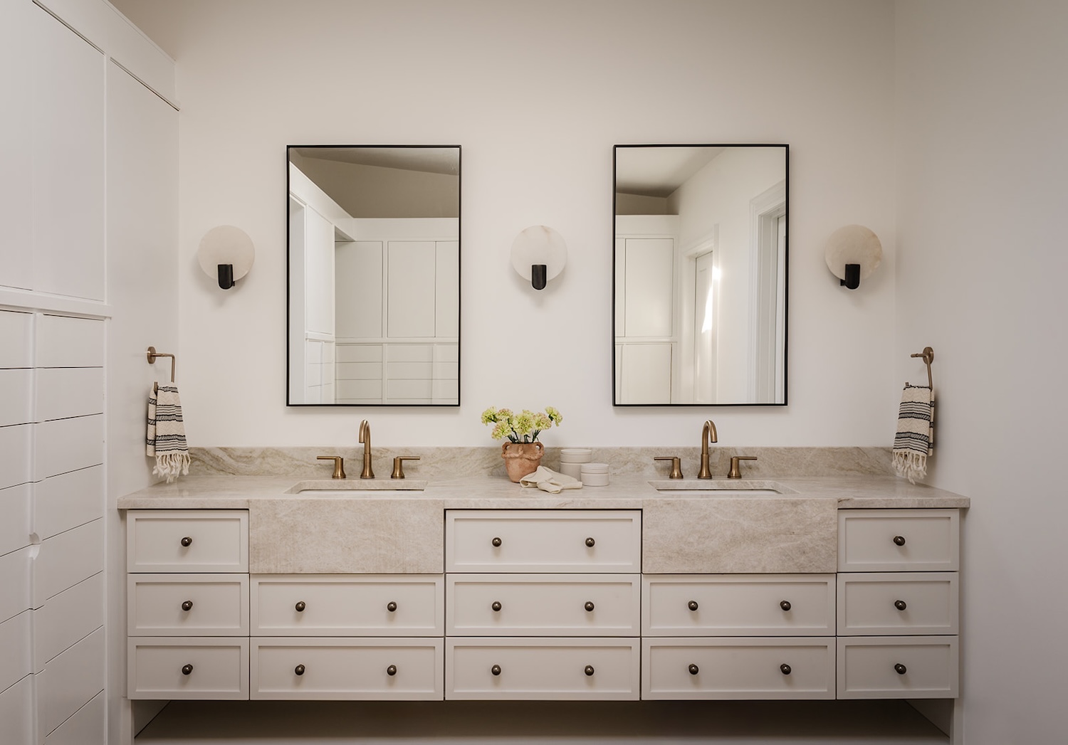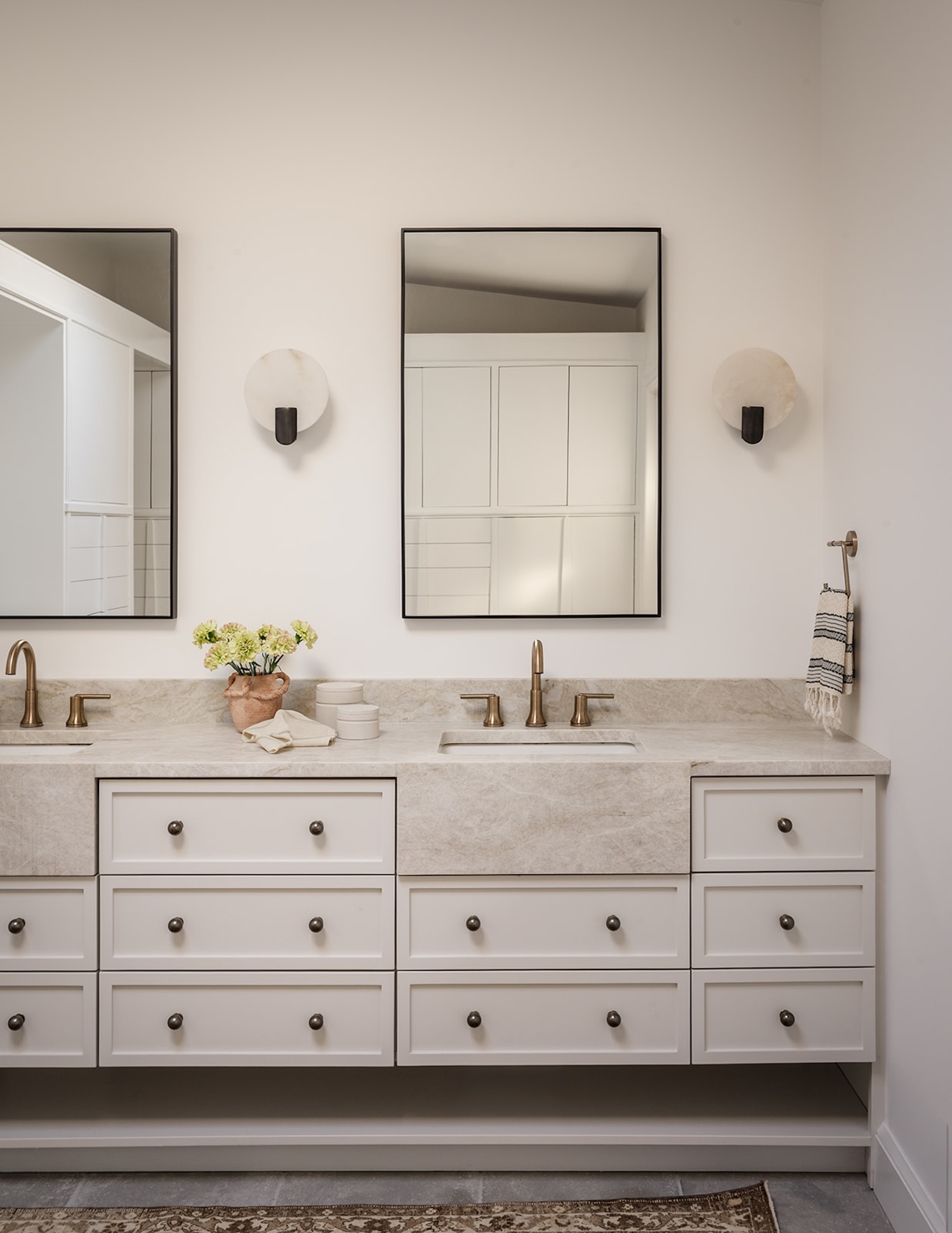 In the primary bathroom, the tone shifts to calm and restorative. Painted greige cabinetry introduces a softer, more tonal warmth, pairing beautifully with honed stone and understated brass fixtures. The restrained palette keeps the space feeling light yet grounded, while clean lines and balanced symmetry reinforce the architectural clarity established throughout the home. It’s a serene retreat, elevated, functional, and intentionally quiet in contrast to the more dynamic shared spaces.