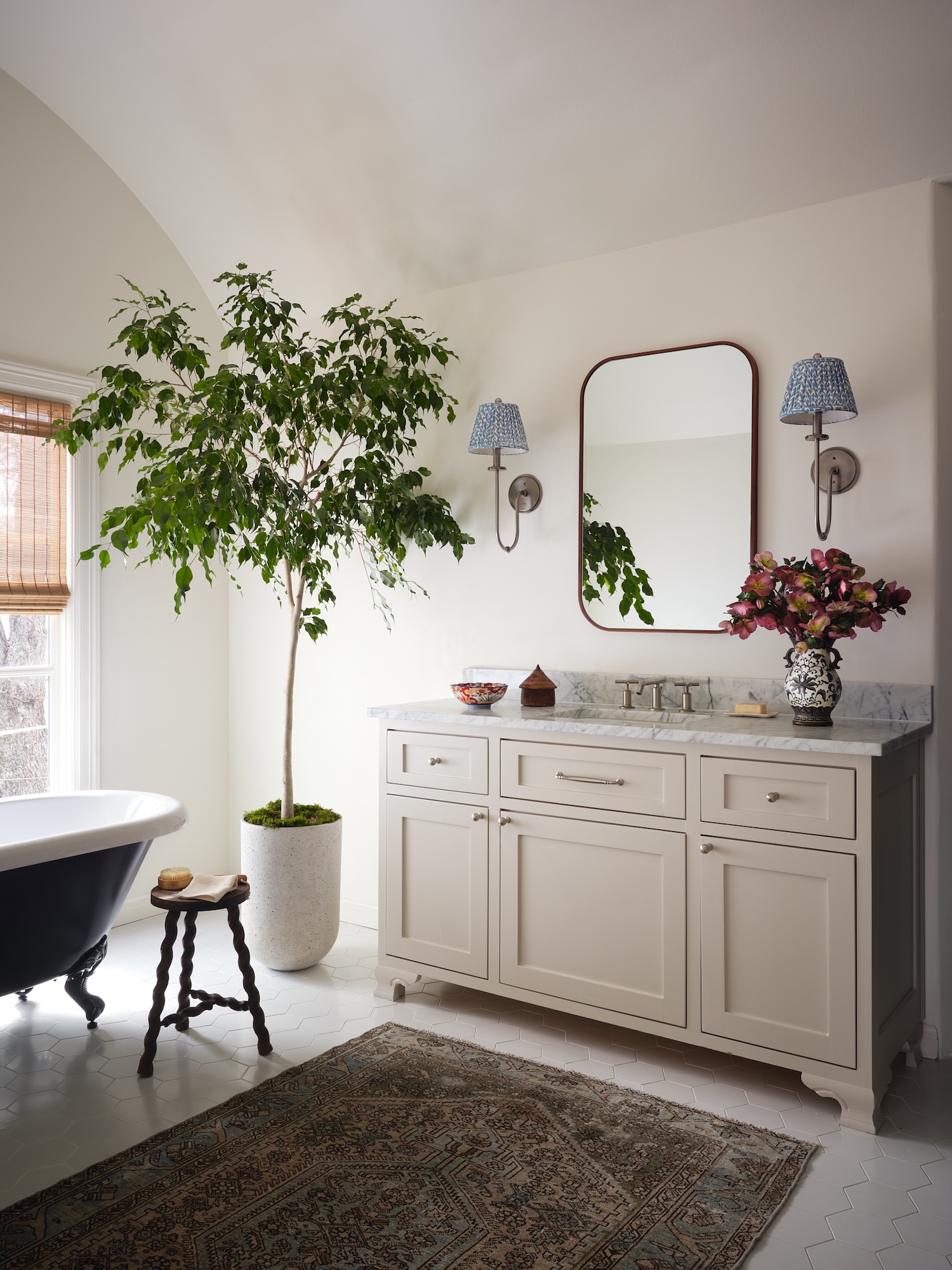 Before we moved in, we restained all the floors, switching them from light to dark, and painted every surface. The walls were a drab blue-grey, and we lightened them with a warm white. It made a lot more sense to have the floors be dark and the walls be light, so we reversed that. We had to add 8” in height to the stair railing for safety. We did this by adding the top swirl to what was already there. I added the Saltillo tile in the entry, converted a coat closet into a mudroom, but the most work was in the primary bath. We changed out everything while keeping the location of the plumbing the same.