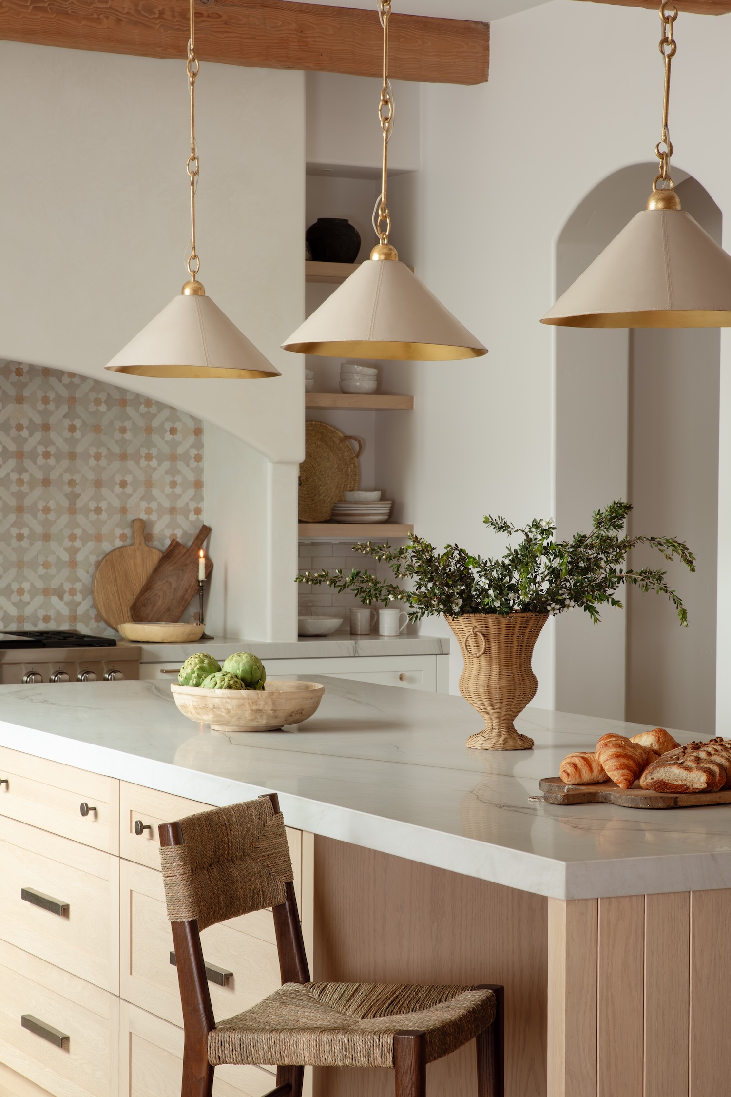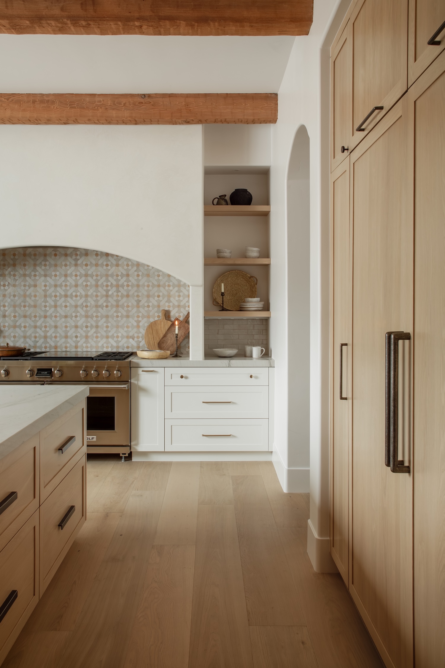 Our design sought to balance sophistication and functionality, integrating durable, family-friendly materials with thoughtful nods to Spanish architecture through arched details, natural textures, and a soft, sun-washed palette. The reimagined layout, featuring double islands, creates an open and inviting flow with designated space for the kids to play or do homework while meals are prepared. This thoughtful arrangement encourages connection and ease. The result is a soulful, serene kitchen that celebrates heritage while supporting the pace and joy of modern family life.