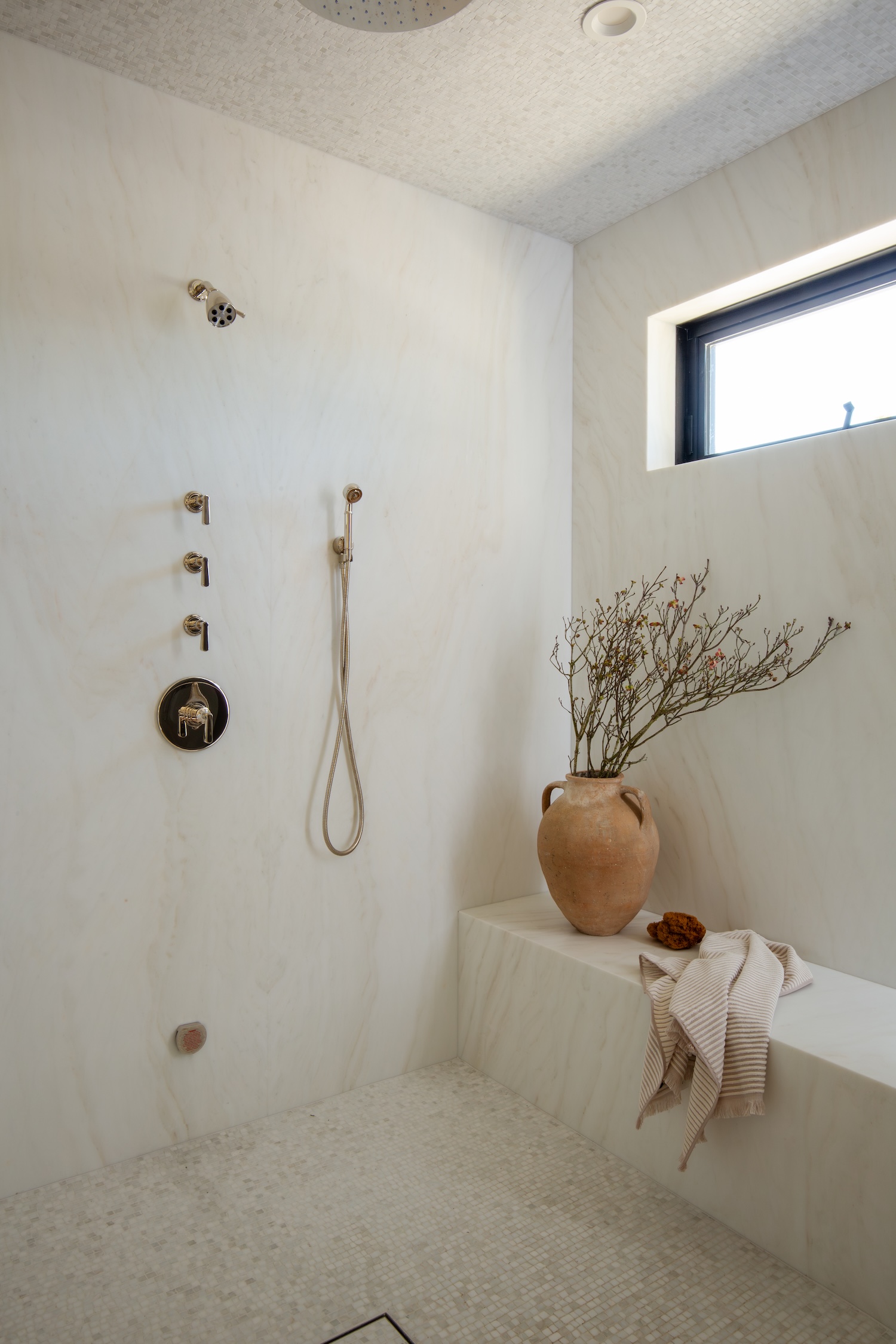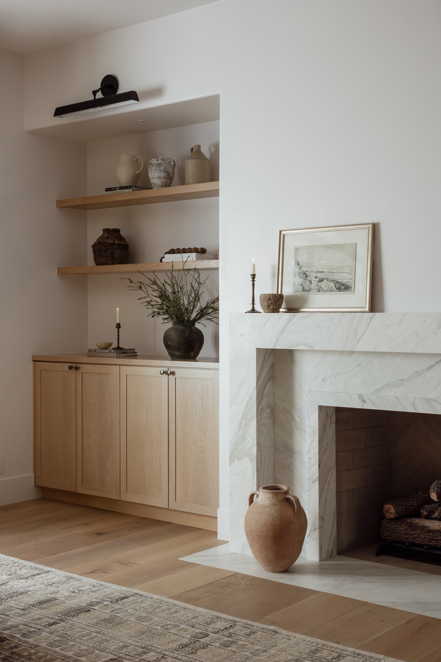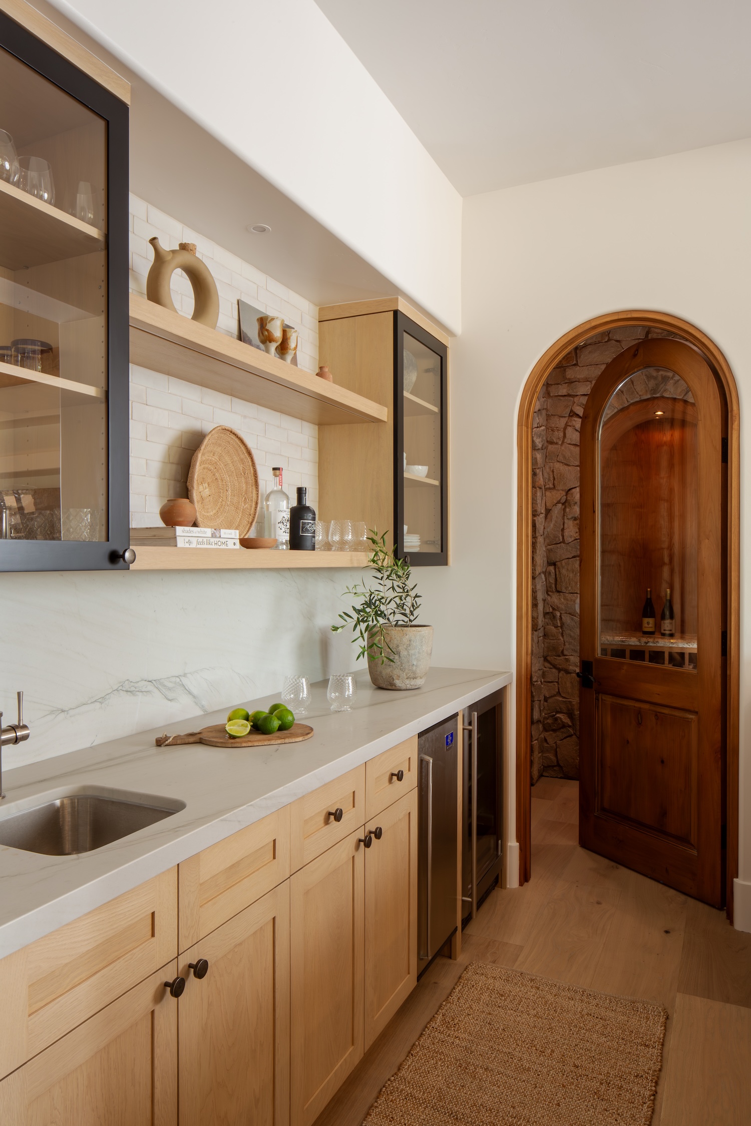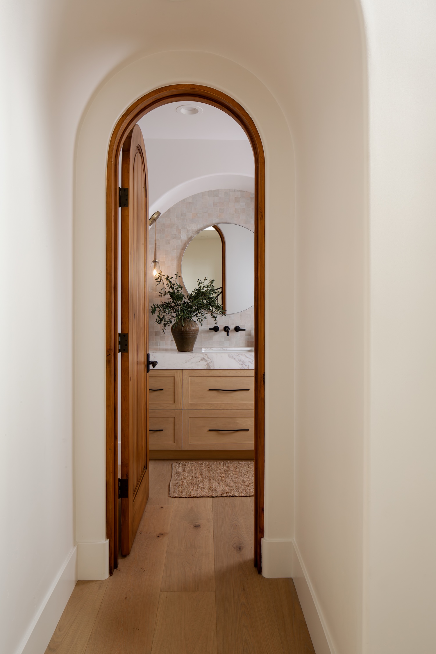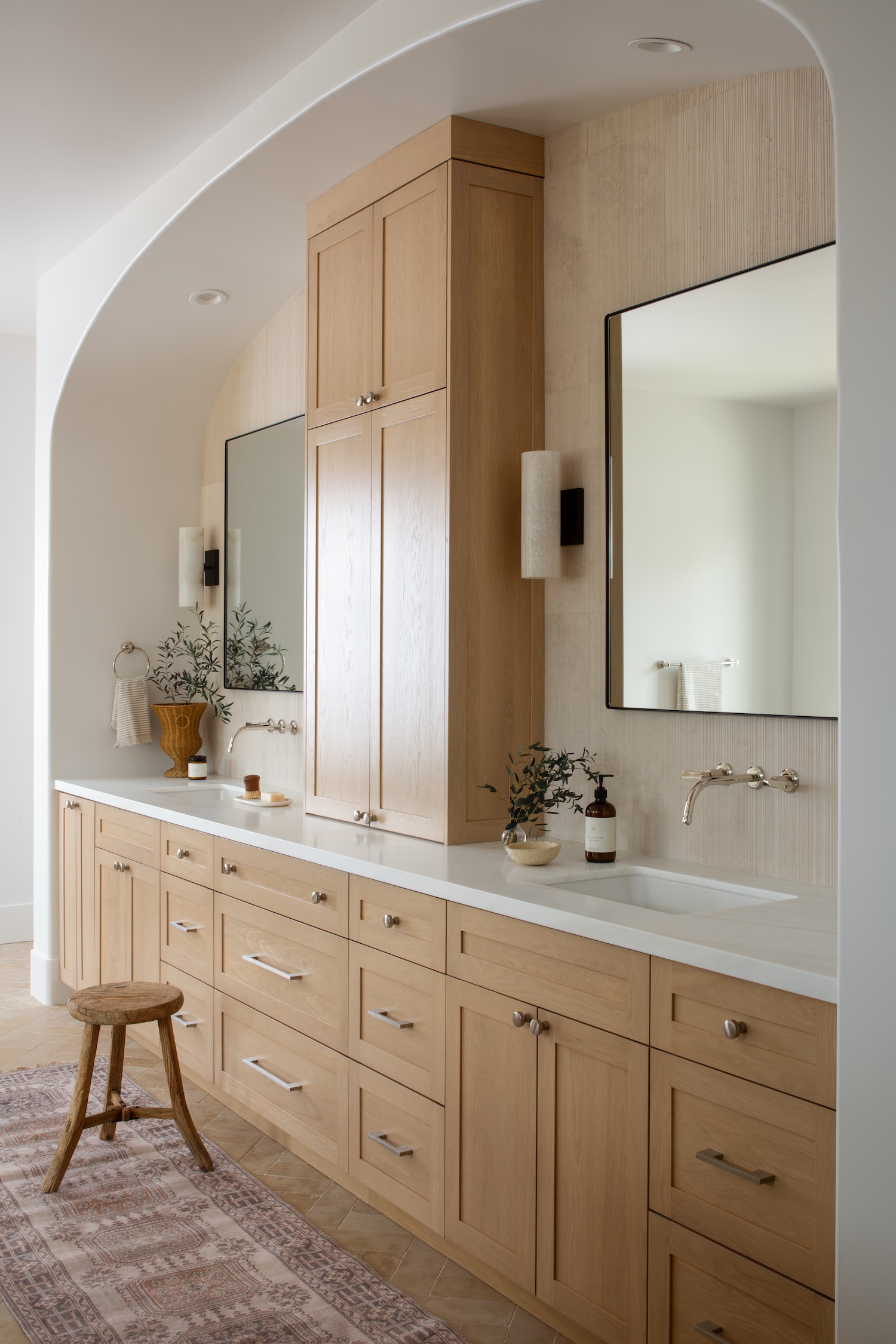 Hand-finished materials, from natural stone quartzite and artisan-made tiles to warm limestone floors, layer texture and quiet sophistication throughout. Plain-sliced white oak, soft sculptural plumbing fixtures, and warm, earthy paint tones add depth and richness, creating spaces that feel both grounded and elevated.