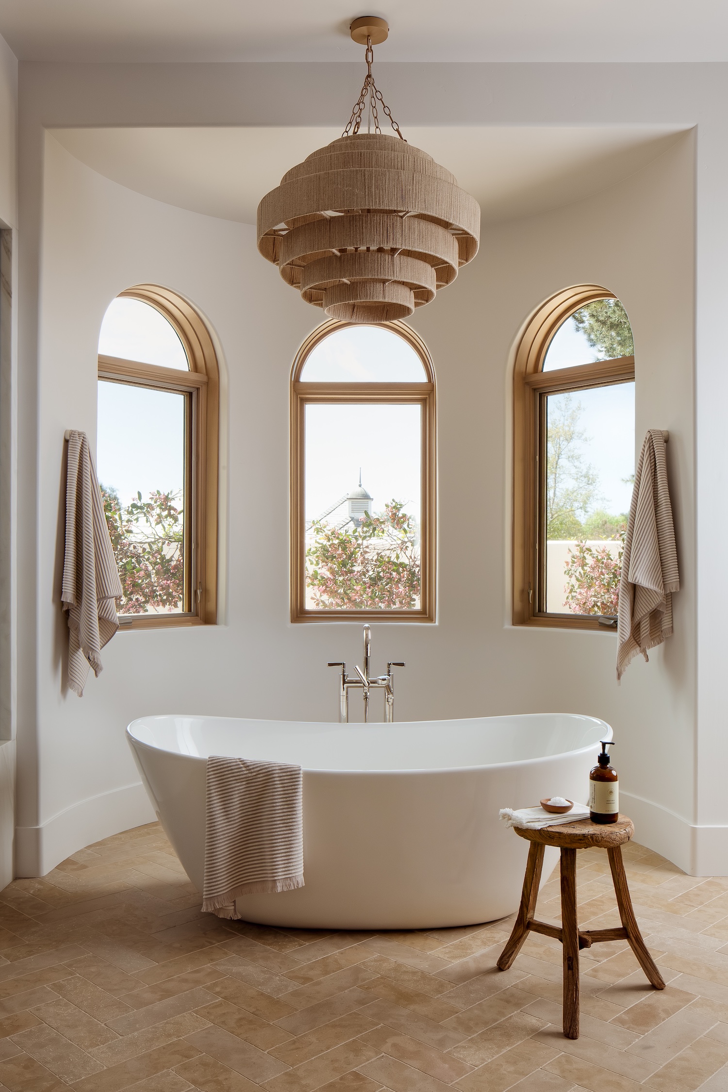 Our goal was to create a bathroom that balances calm with character. A sculptural soaking tub anchors the space, framed by arched windows and a textural chandelier, then softened by layers of natural light. Hand-finished tilework, warm limestone floors, and veined natural stone surfaces bring texture and quiet elegance, while unlacquered brass fixtures add a subtle, lived-in patina over time.