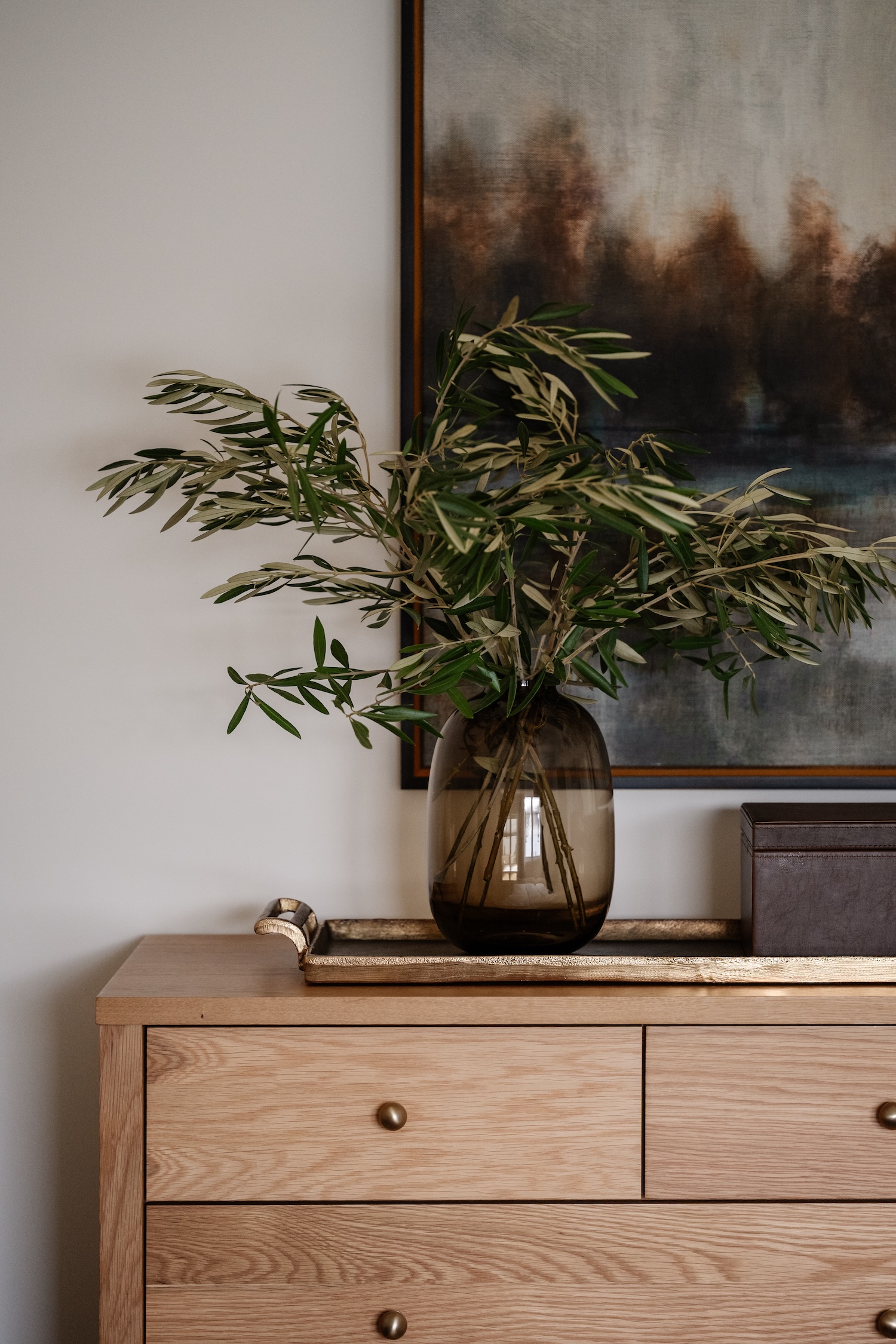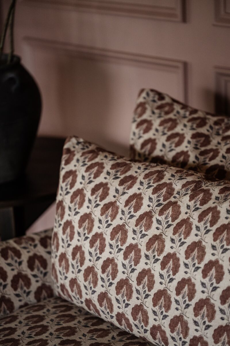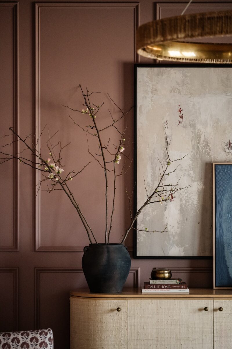 The vision for the pink room started as a way to reintegrate the client’s pair of vibrant floral print chairs; however, it quickly took a life of its own when we were given the OK to use the chairs elsewhere in the home. We still wanted to lean into something bolder for this lounge space, so we opted for a slipcovered sofa in a more subdued floral print. The room quickly became one of our favorite spaces in the home. The dramatic color drenching packs a punch but transitions beautifully with the rest of the first floor.