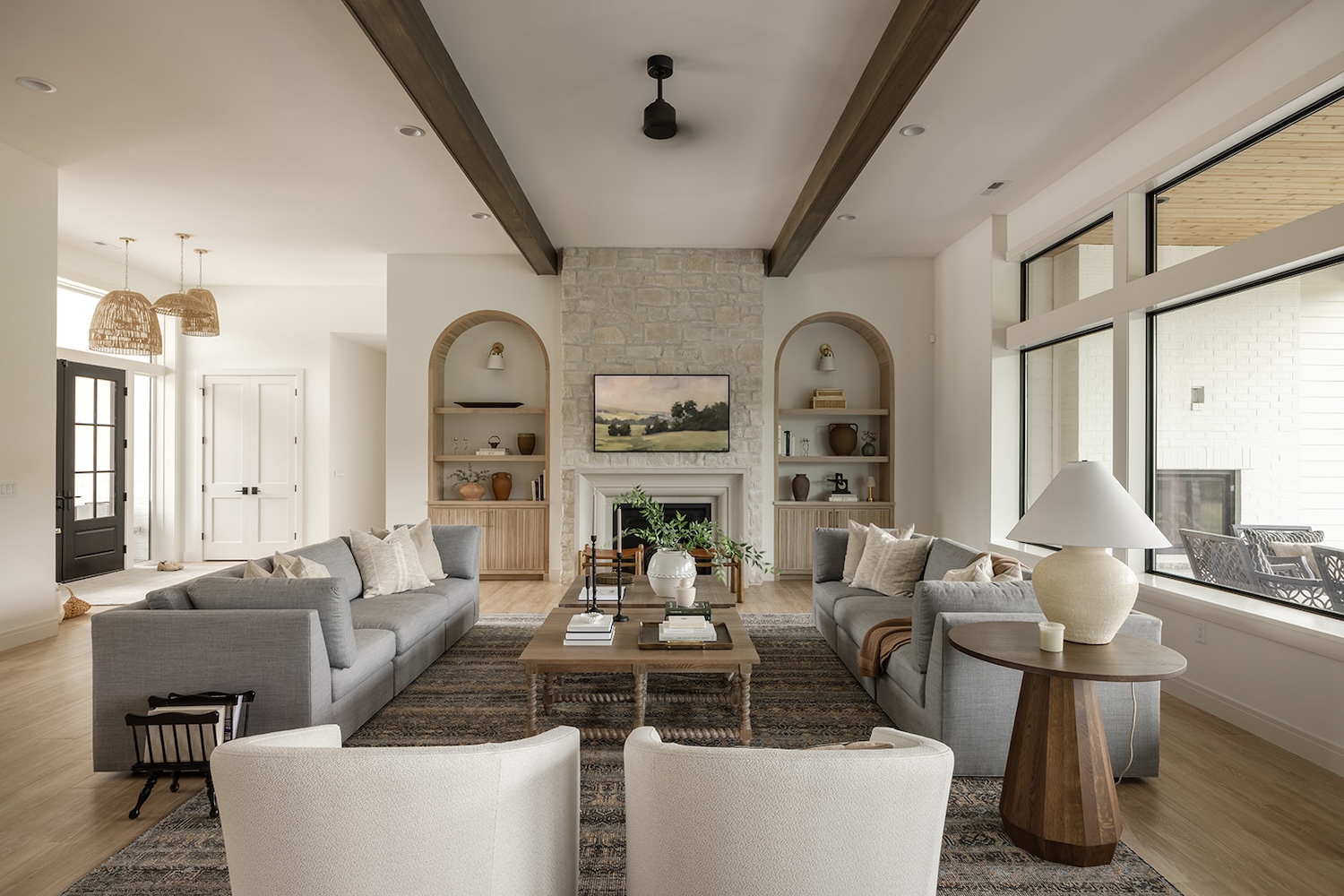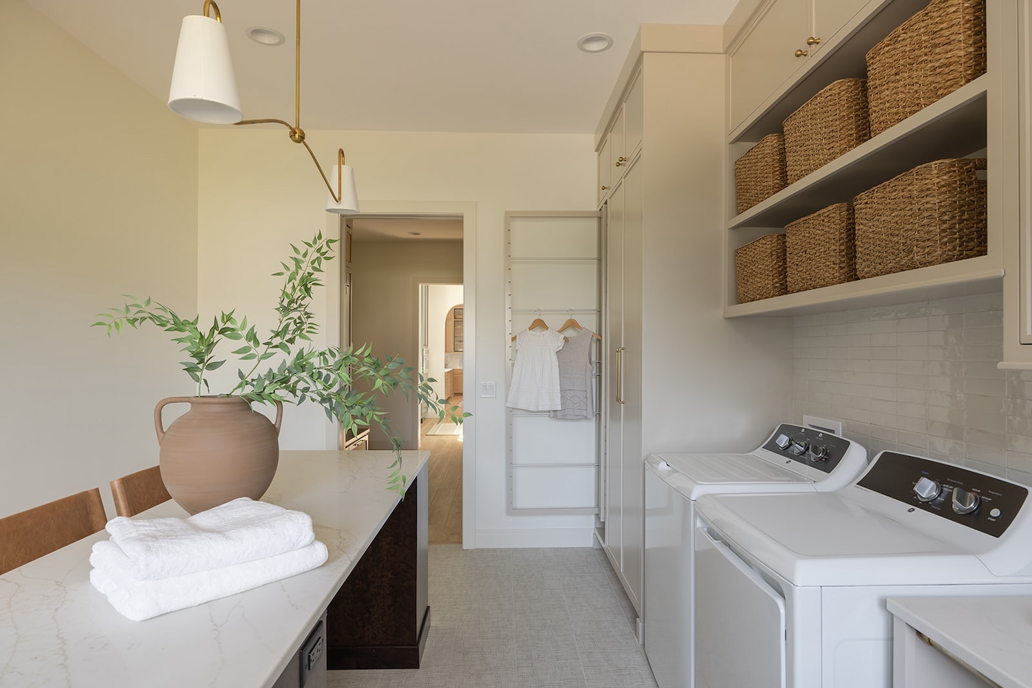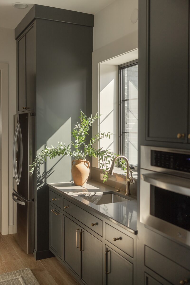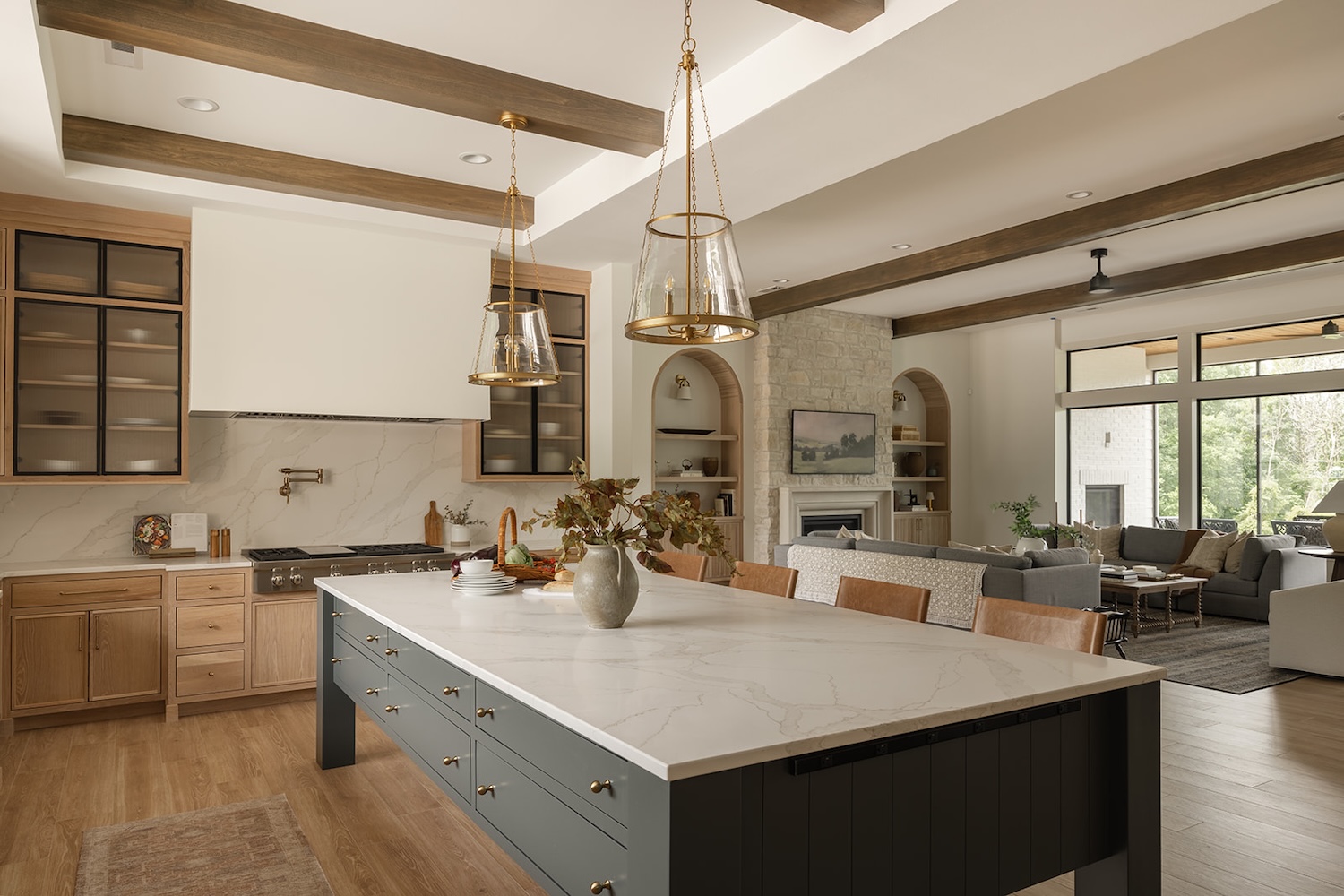 The interior reflects a vision of timeless livability, prioritizing ease of cleaning, practicality, and health-focused materials. A soothing palette of blues and greens, white oak accents, warm stone details, and soaring ceiling heights create a space that feels both grounded and elevated—perfectly tailored to the family’s everyday lifestyle.
