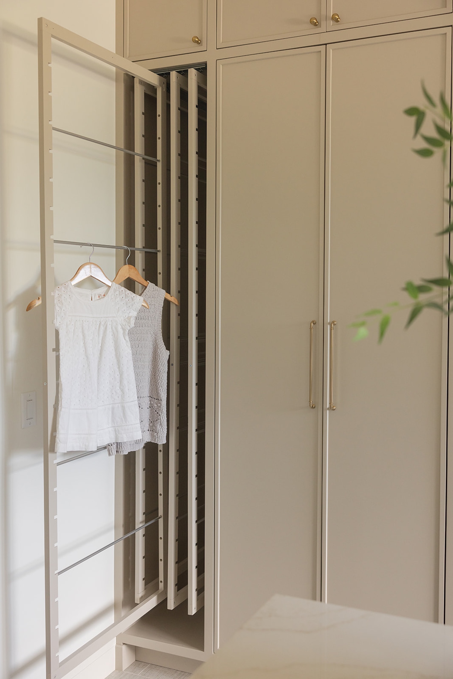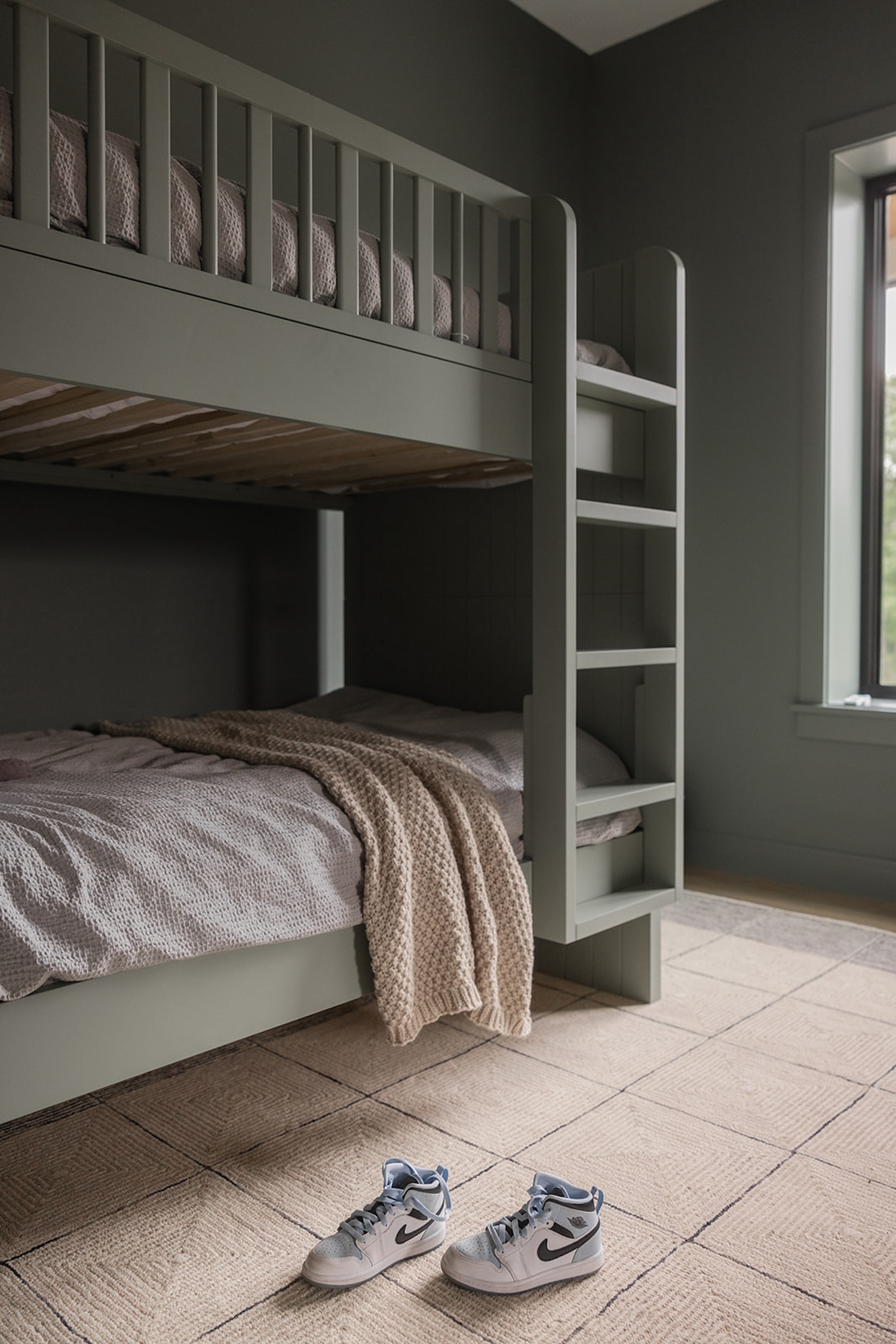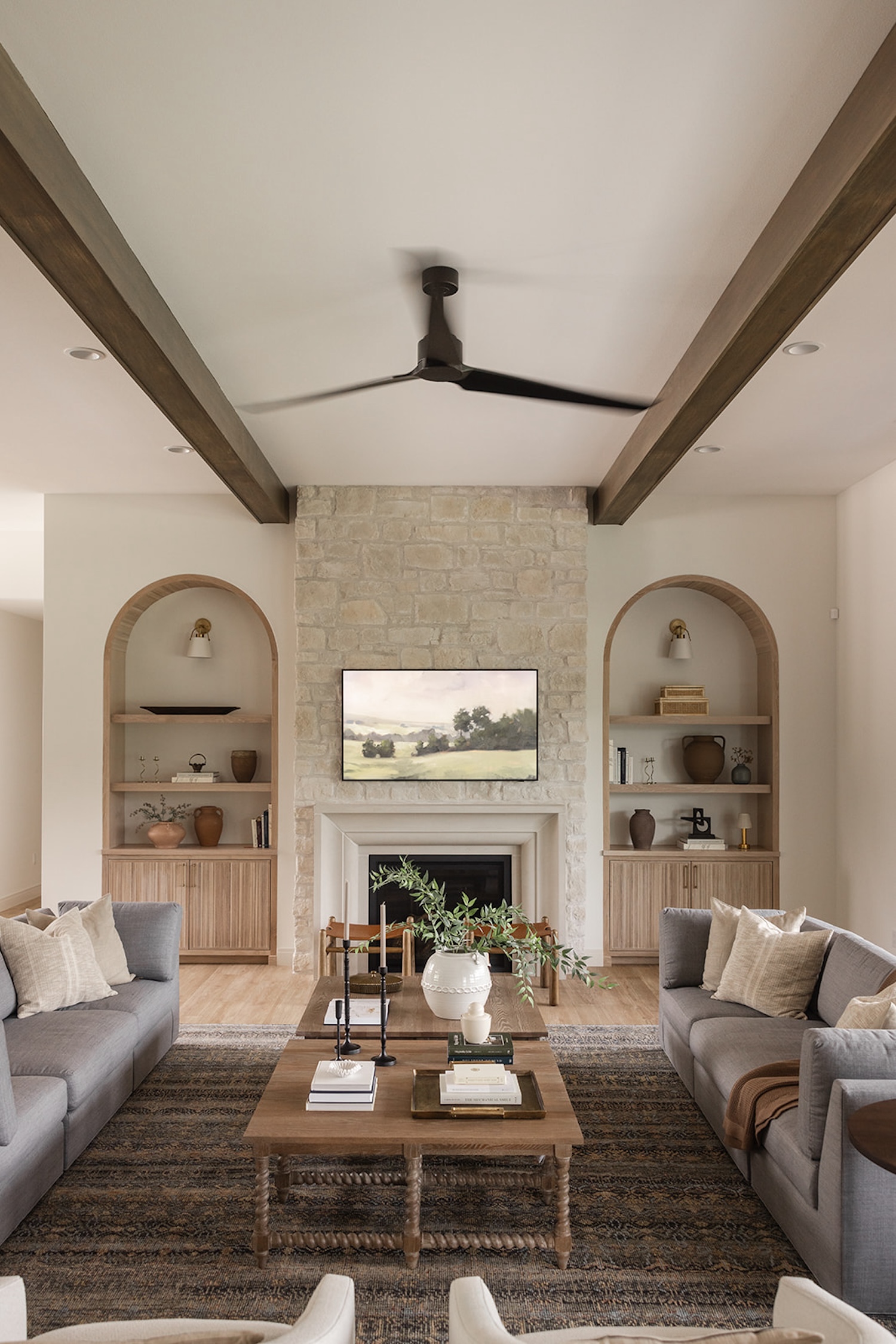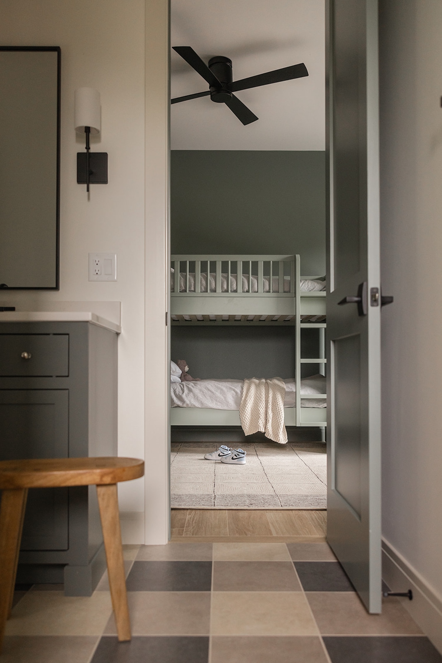 The interior reflects a vision of timeless livability, prioritizing ease of cleaning, practicality, and health-focused materials. A soothing palette of blues and greens, white oak accents, warm stone details, and soaring ceiling heights create a space that feels both grounded and elevated—perfectly tailored to the family’s everyday lifestyle.