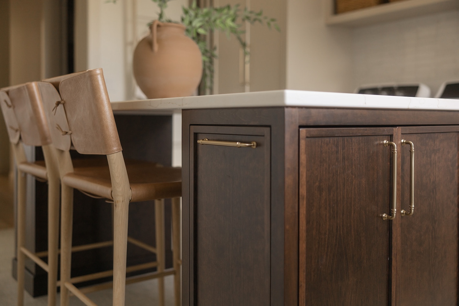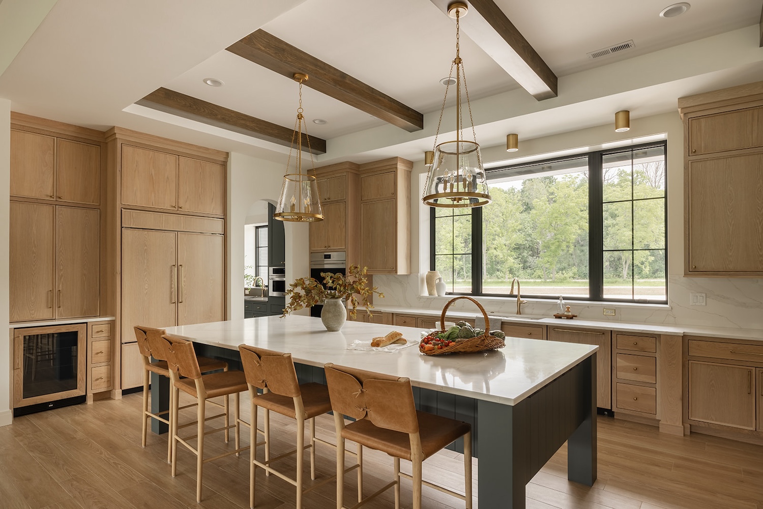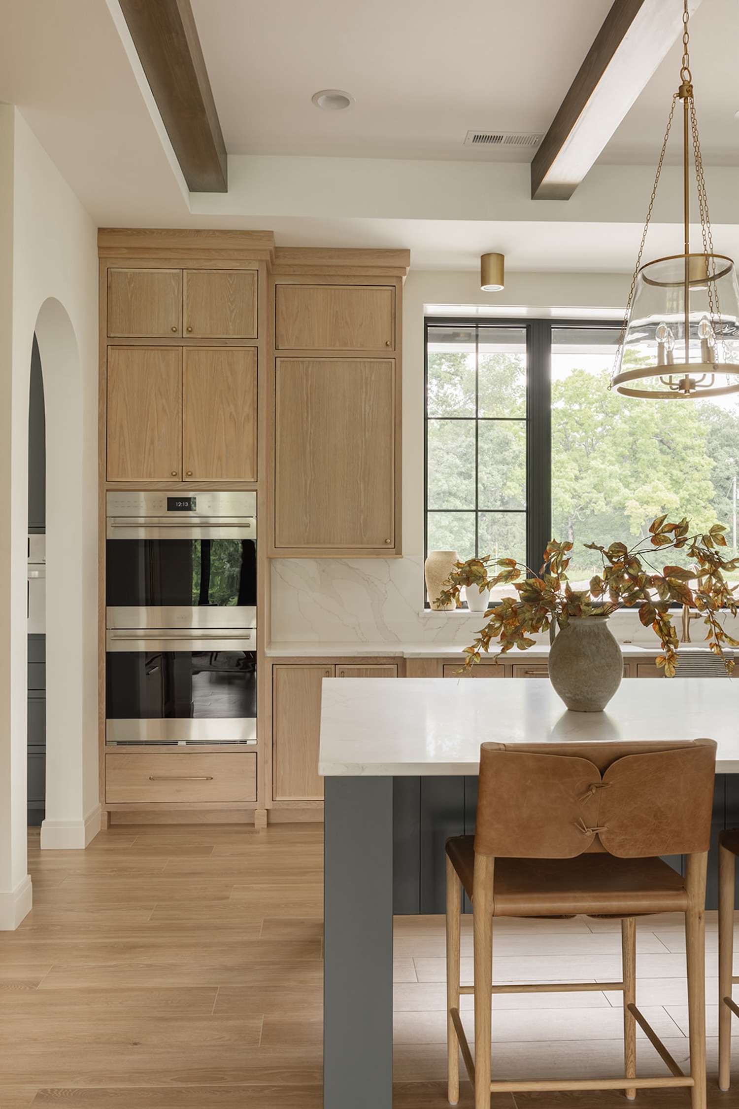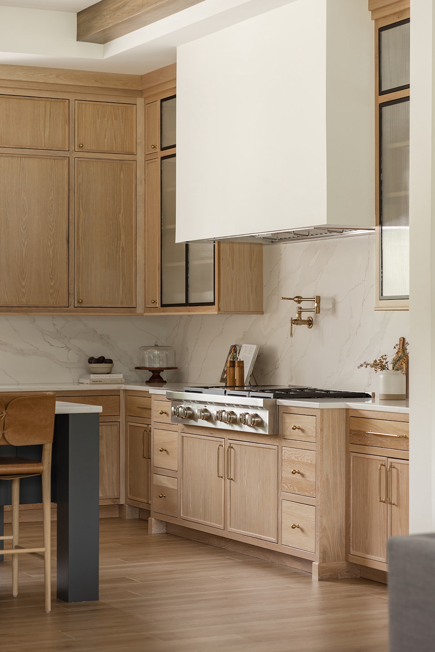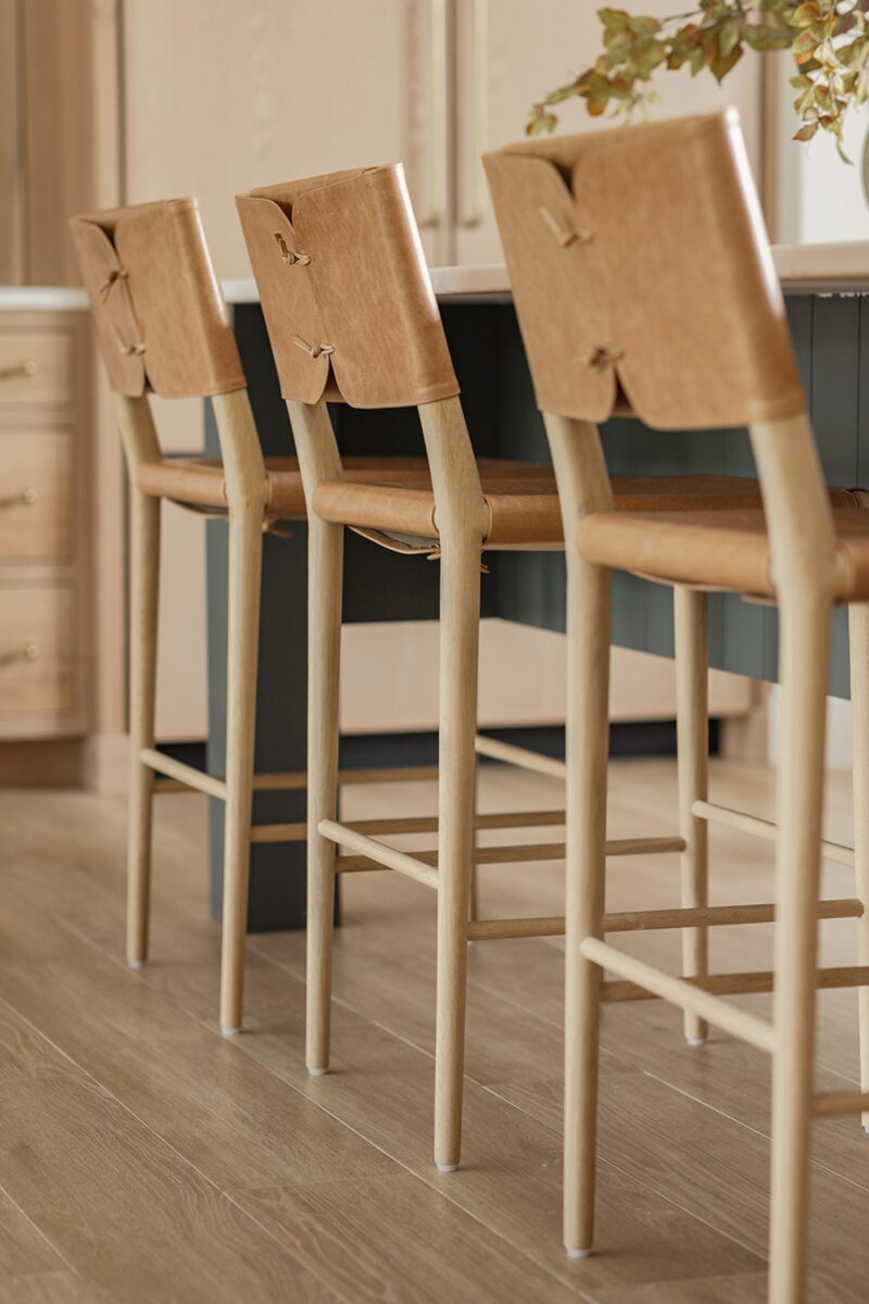 In Iowa City, designer Brooke Mennen-Talsma of Brooke MT Interiors crafted a home that balances refined simplicity with everyday function. Photographed by Dan Rolling, this home pairs a soft, nature-inspired palette with thoughtful materials like warm white oak cabinetry, creamy stone surfaces, and textural leather stools—offering a fresh, livable take on transitional design.