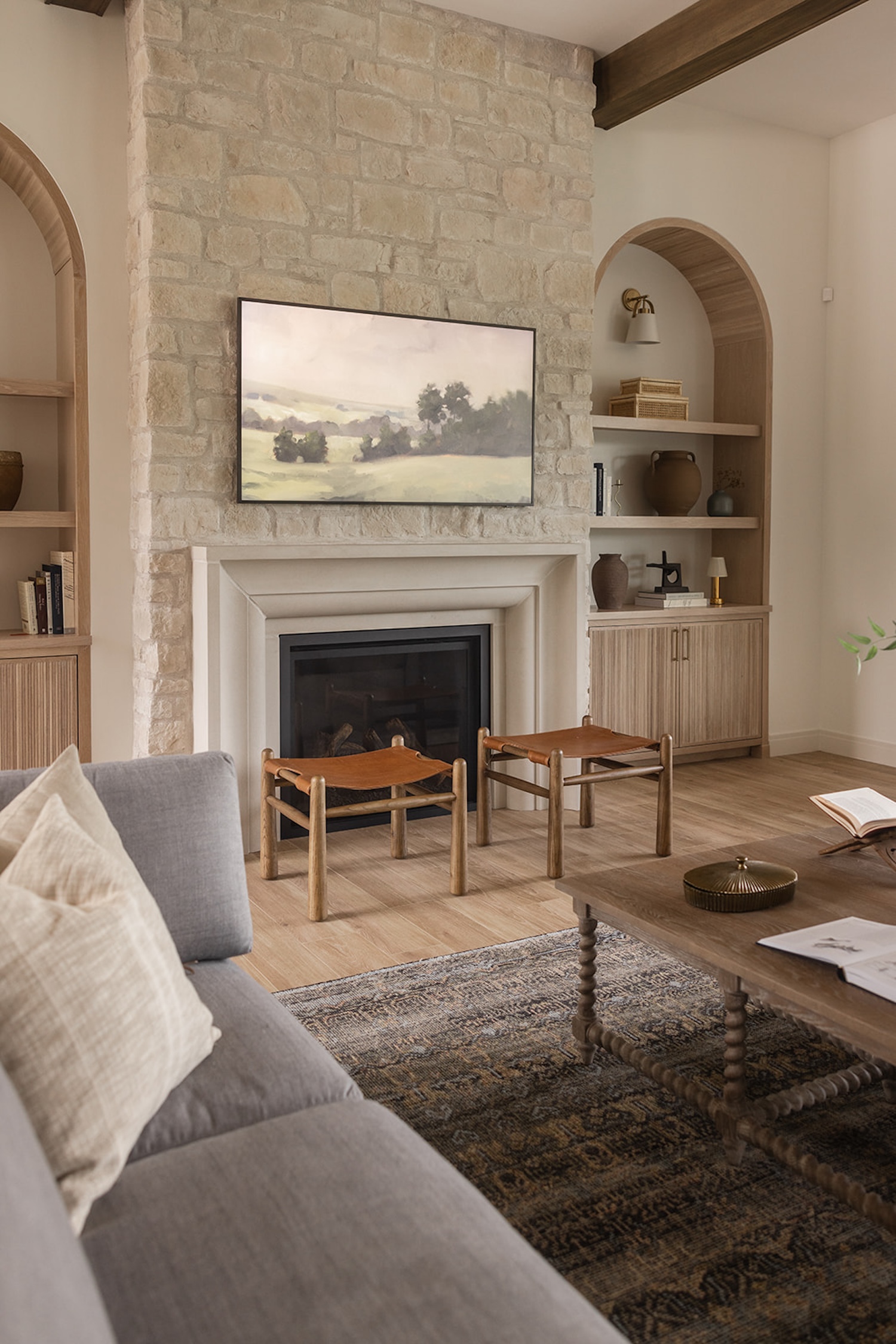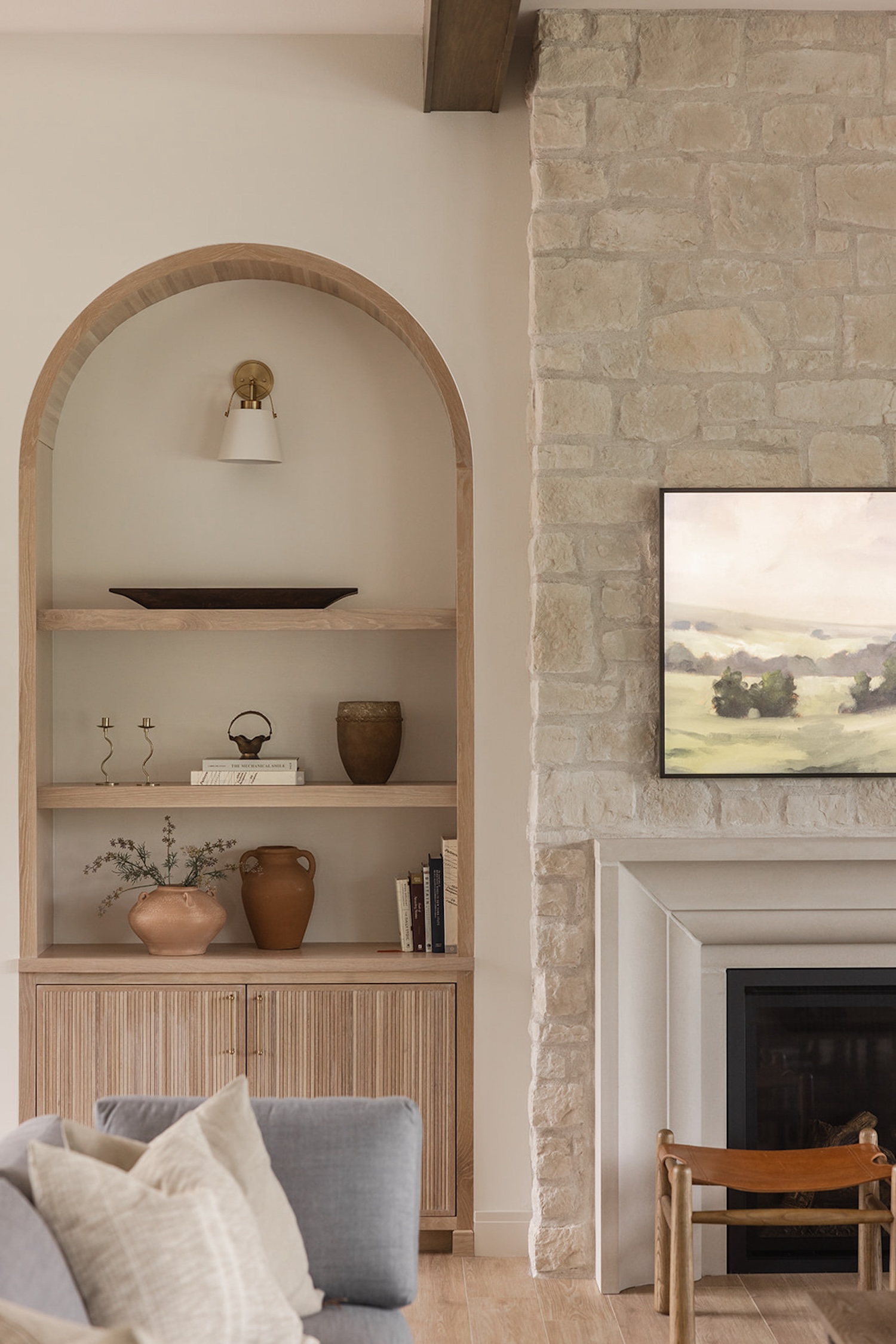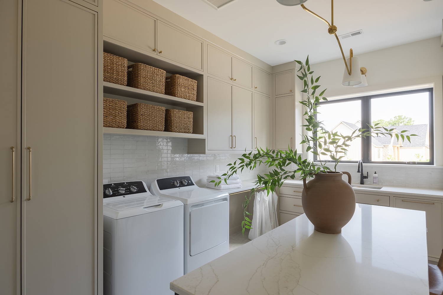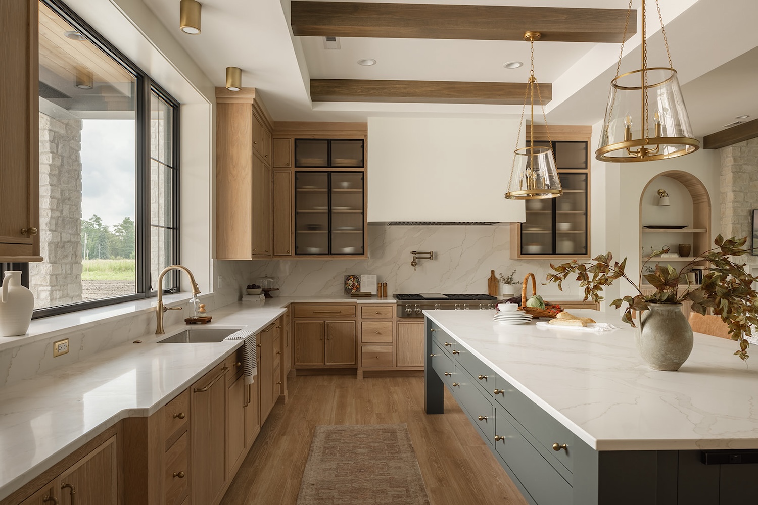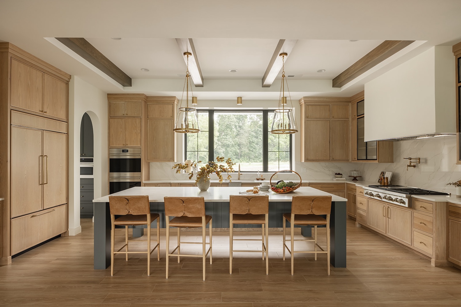 In Iowa City, designer Brooke Mennen-Talsma of Brooke MT Interiors crafted a home that balances refined simplicity with everyday function. Photographed by Dan Rolling, this home pairs a soft, nature-inspired palette with thoughtful materials like warm white oak cabinetry, creamy stone surfaces, and textural leather stools—offering a fresh, livable take on transitional design.