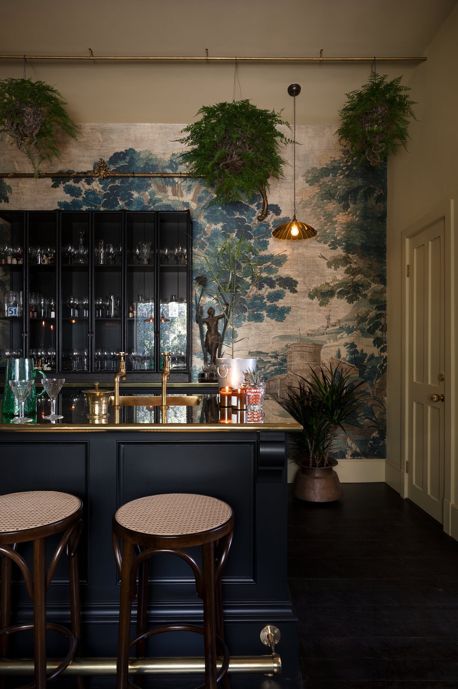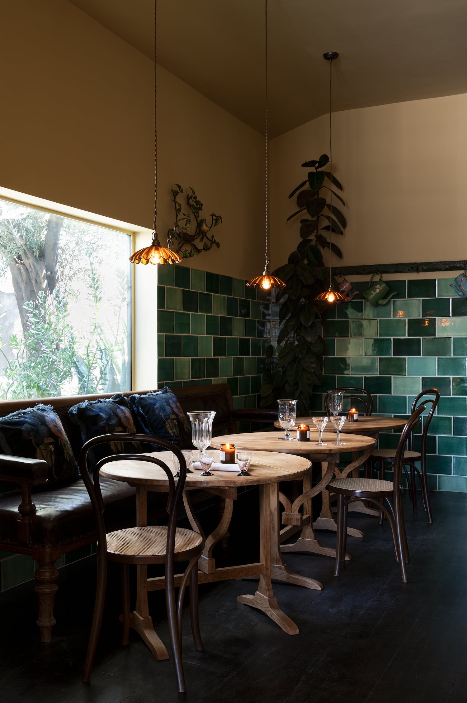 Turning a corner, the mood shifts. Painted in Bobbin Black, the Haberdasher’s bar feels cocooning and intimate, anchored by a polished brass countertop that catches the light. Grasscloth wallpaper, emerald tiles, and hand-dyed oak floors layer texture and depth, while bentwood chairs and vineyard tables lend a hint of European café culture.