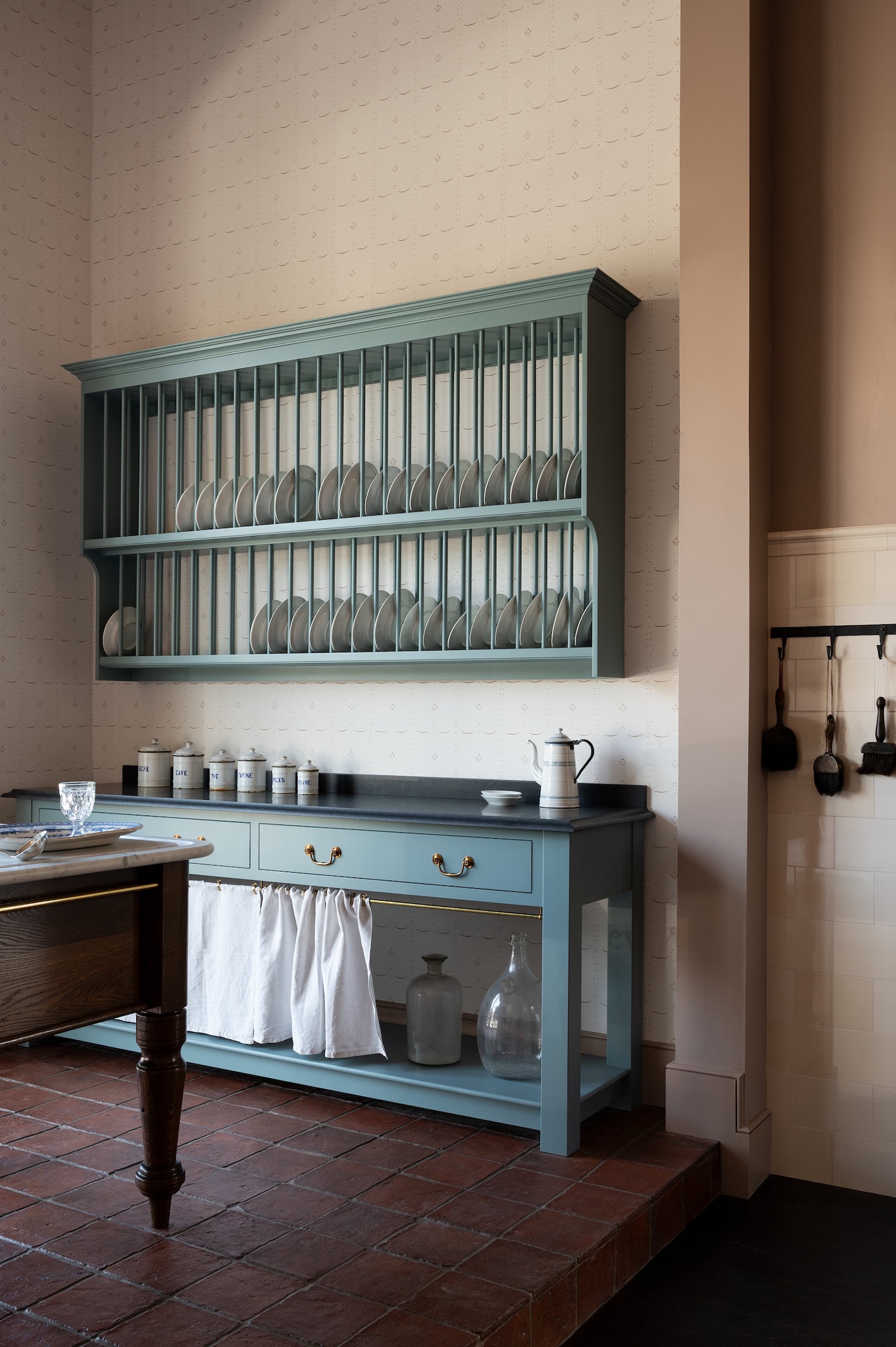 Beyond the window, the showroom opens into a spacious, light-filled kitchen that balances generosity with restraint. This very simple display shows a space that is quintessentially English, with its terracotta tiled floor, Dairy Table, open cupboards and delightfully organized plate racks. The walls have been covered in Ditsy Delft Wallpaper, subtle and clean and the perfect ‘hardly there’ backdrop to the Trinity Blue cupboards and simple styling.