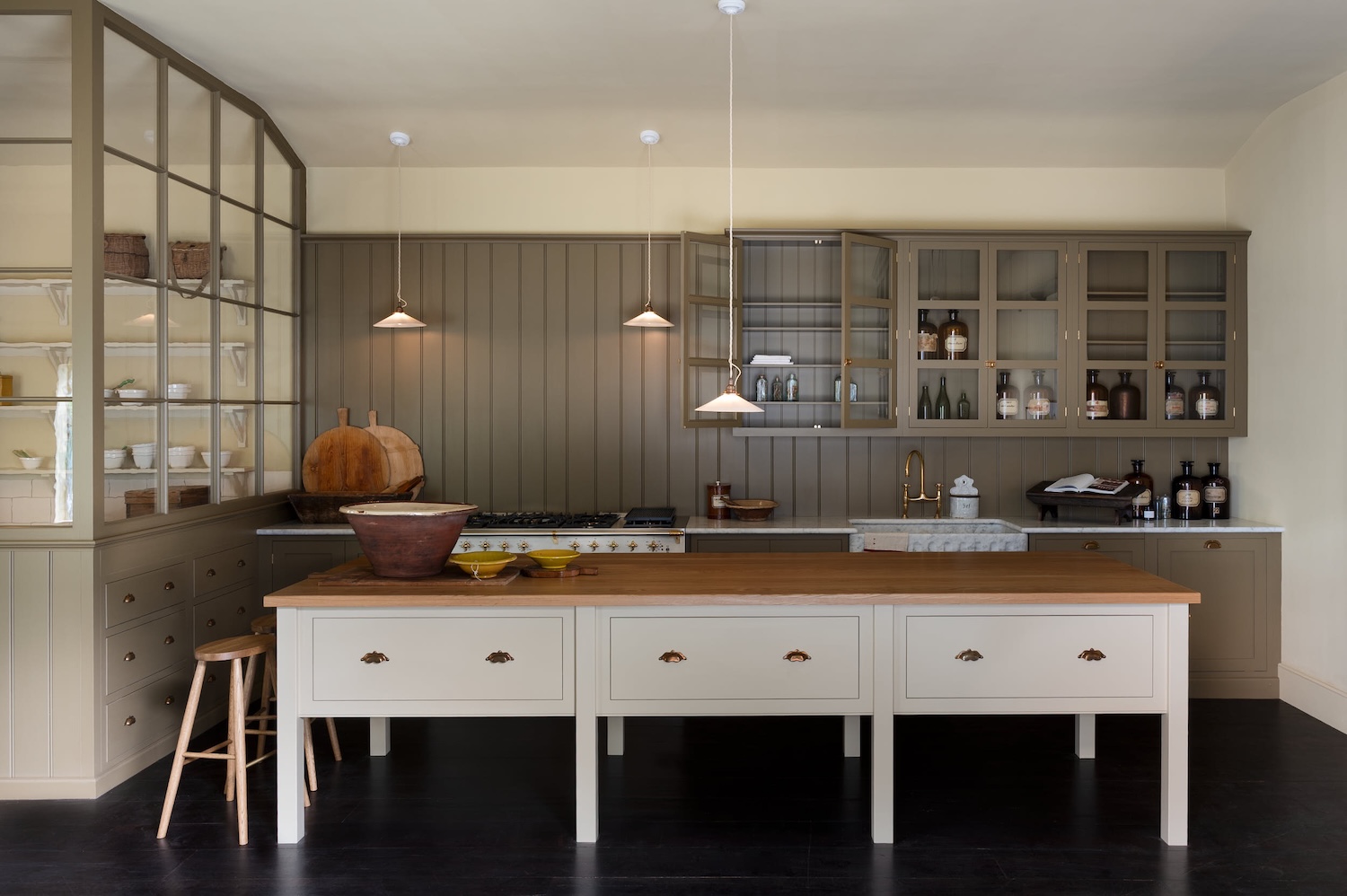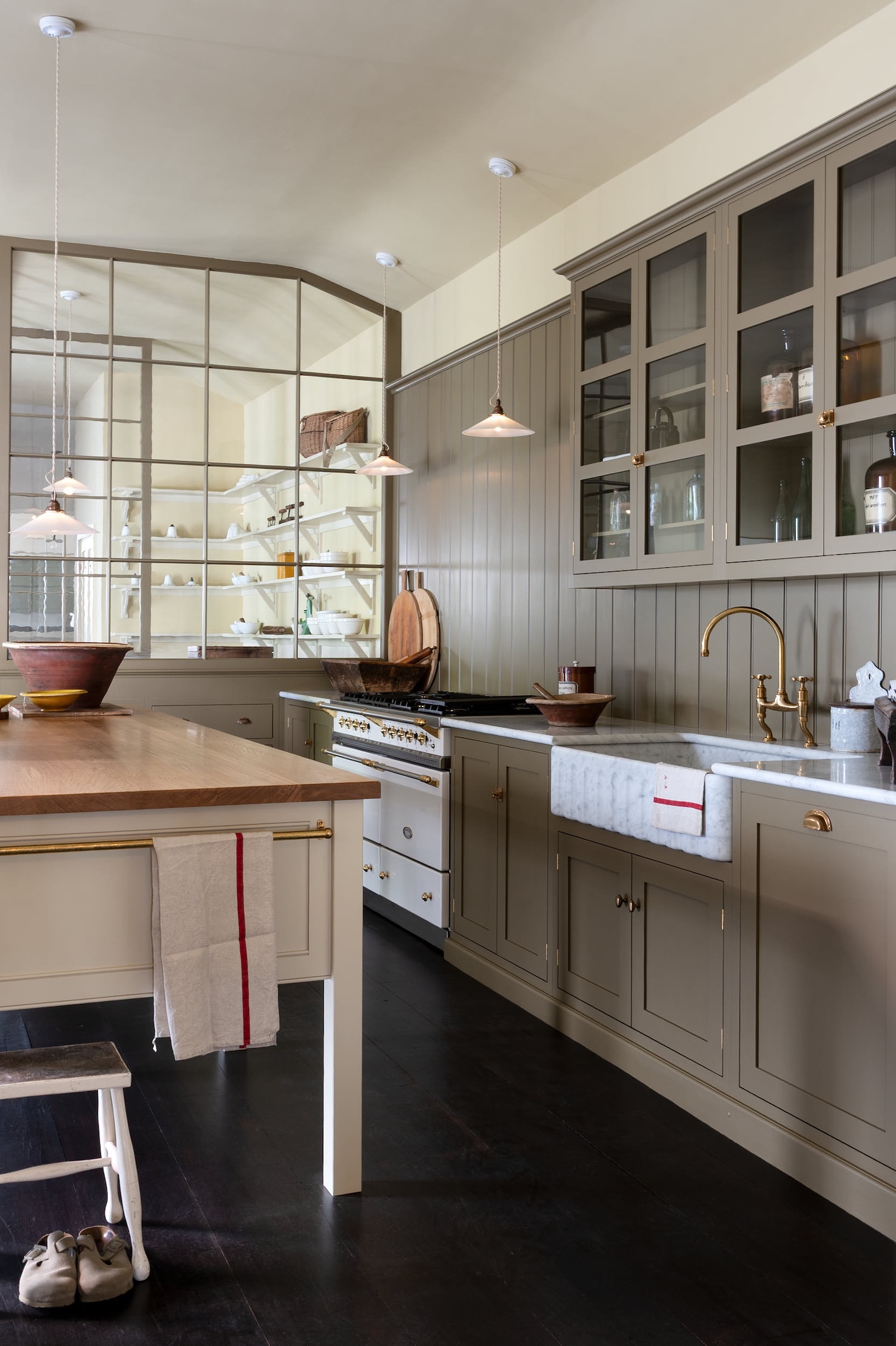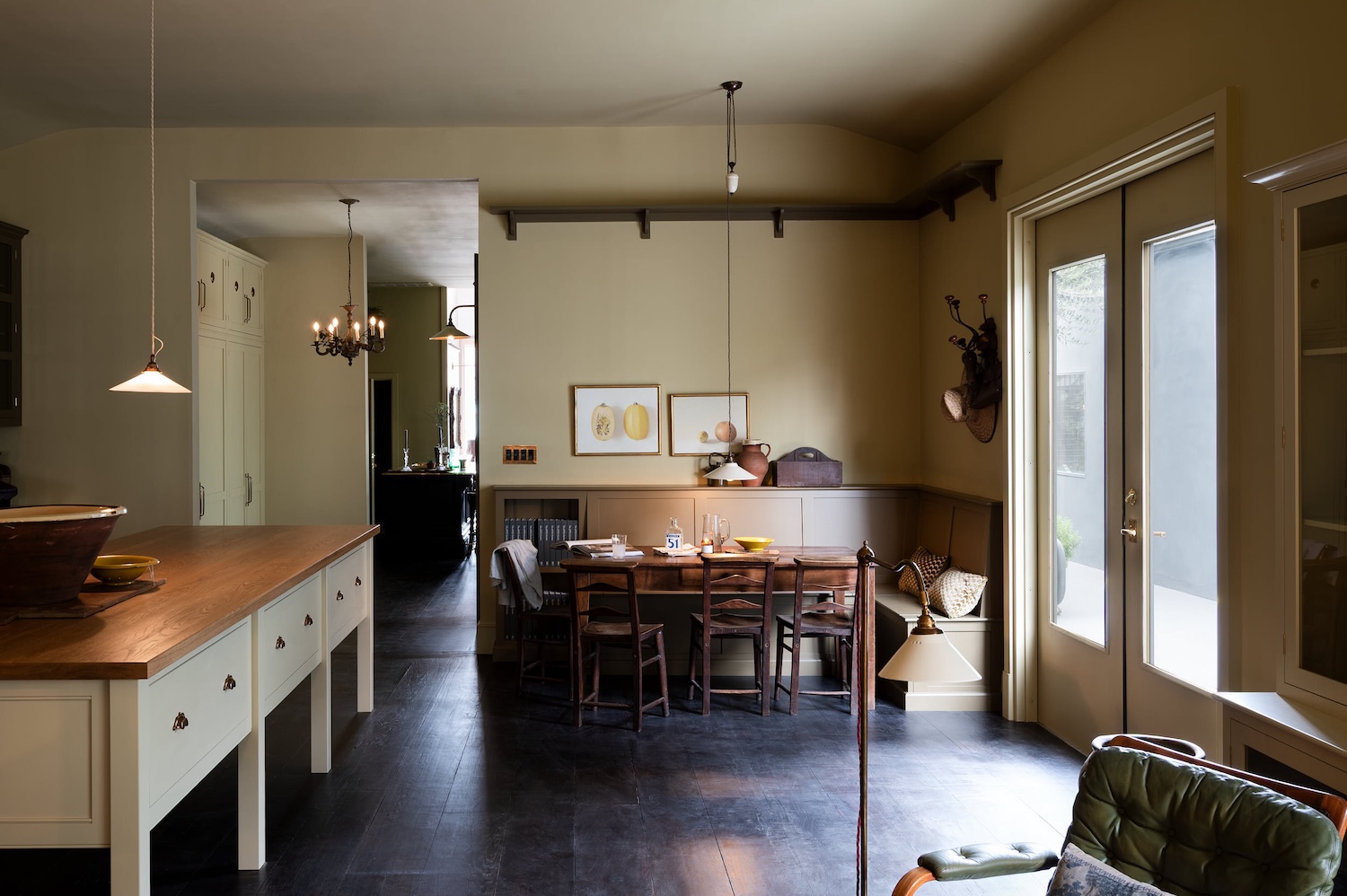 The Shaker kitchen introduces three new deVOL paint colors — earthy, muted tones that feel both fresh and familiar. A prep table stands in place of a traditional island, keeping the room open and unfussy, while a built-in bench and low-hung lighting create a natural gathering spot nearby.