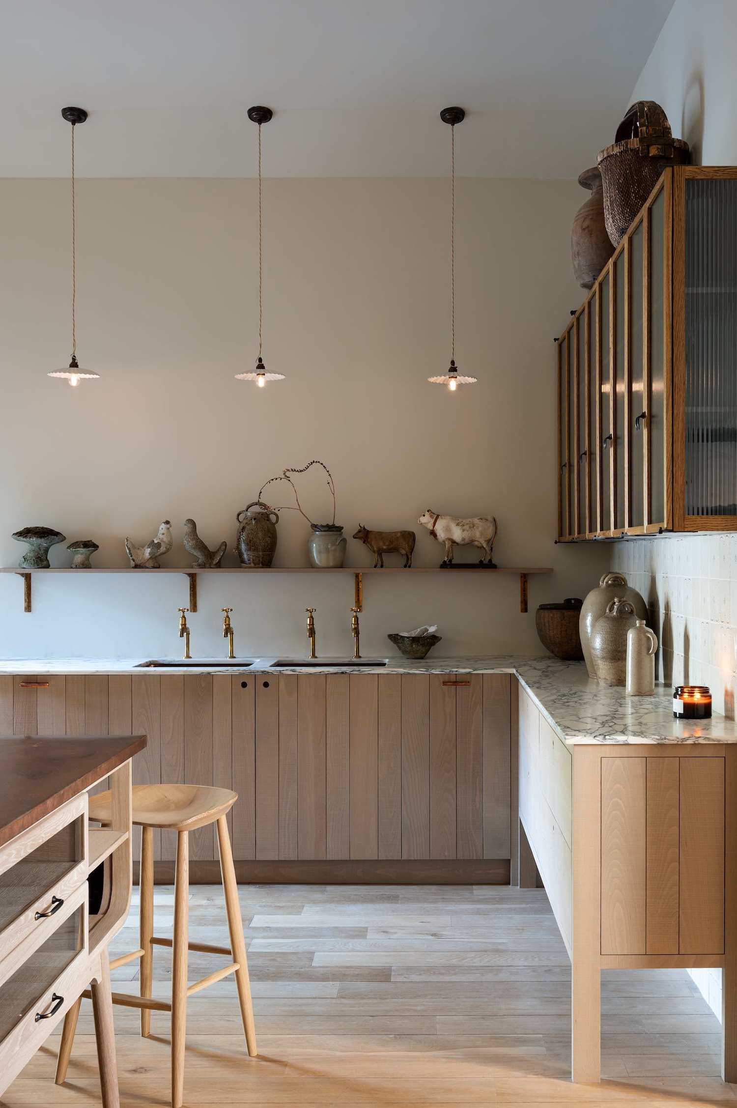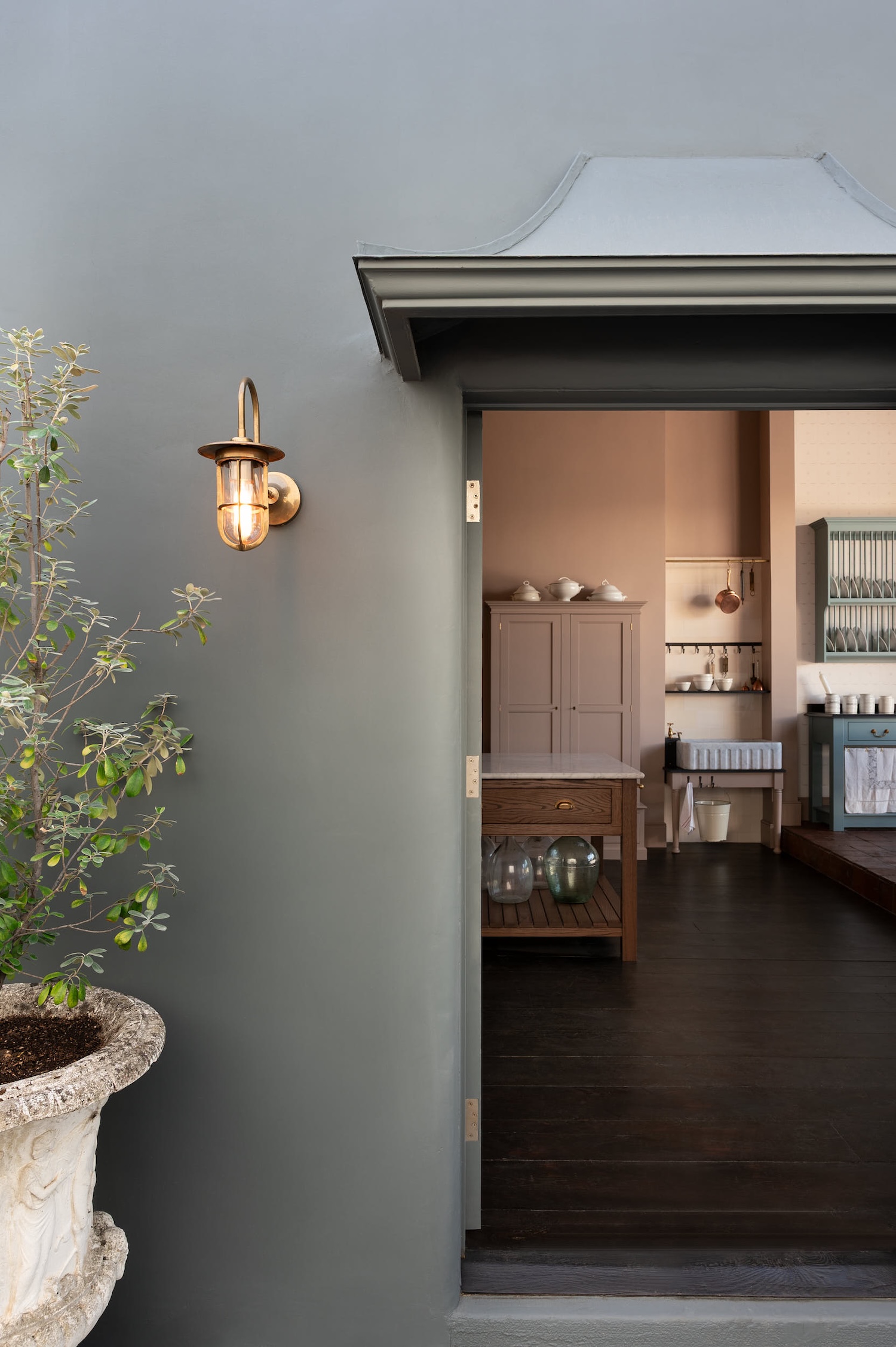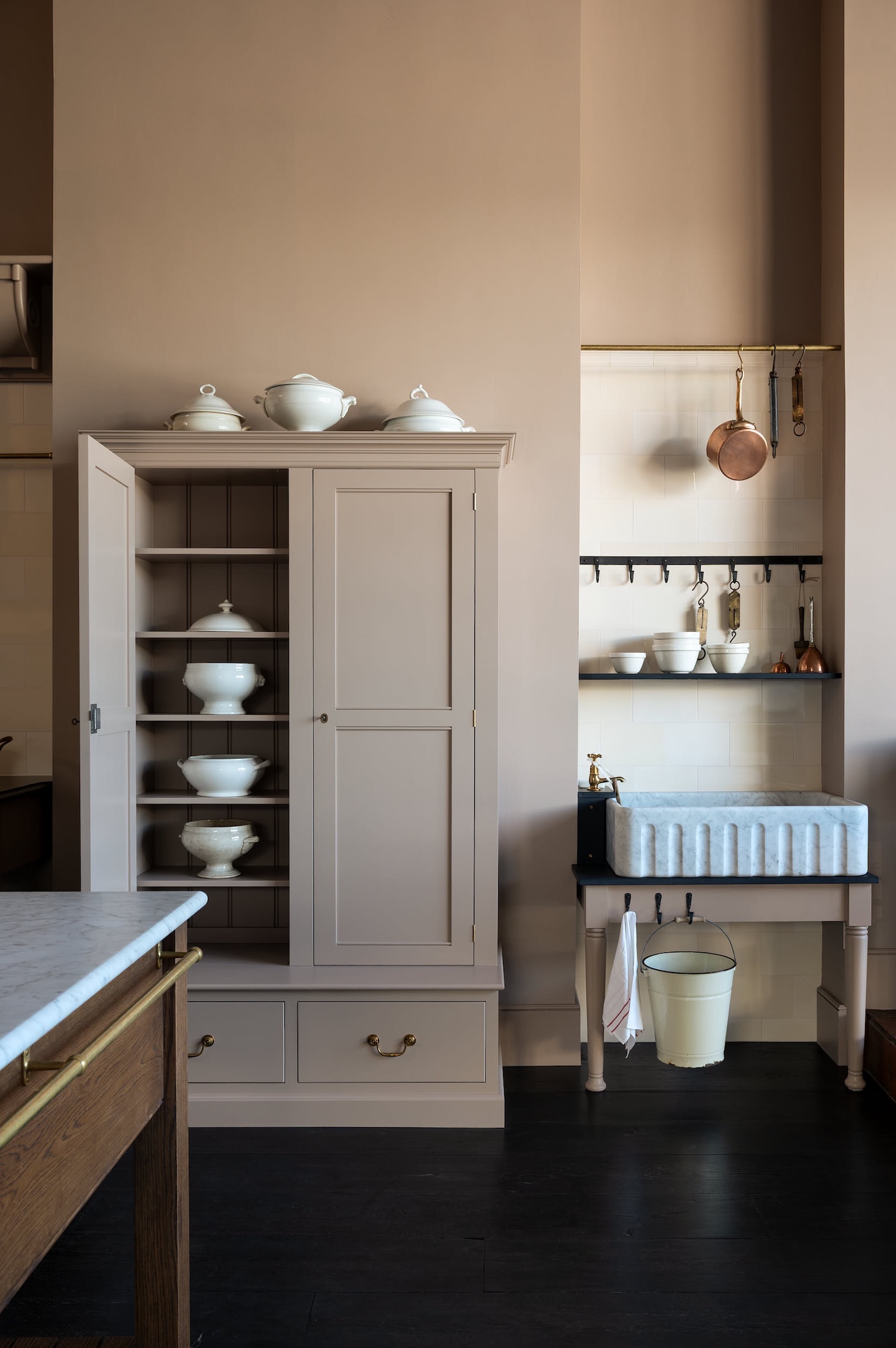 The Shaker kitchen introduces three new deVOL paint colors — earthy, muted tones that feel both fresh and familiar. A prep table stands in place of a traditional island, keeping the room open and unfussy, while a built-in bench and low-hung lighting create a natural gathering spot nearby.
