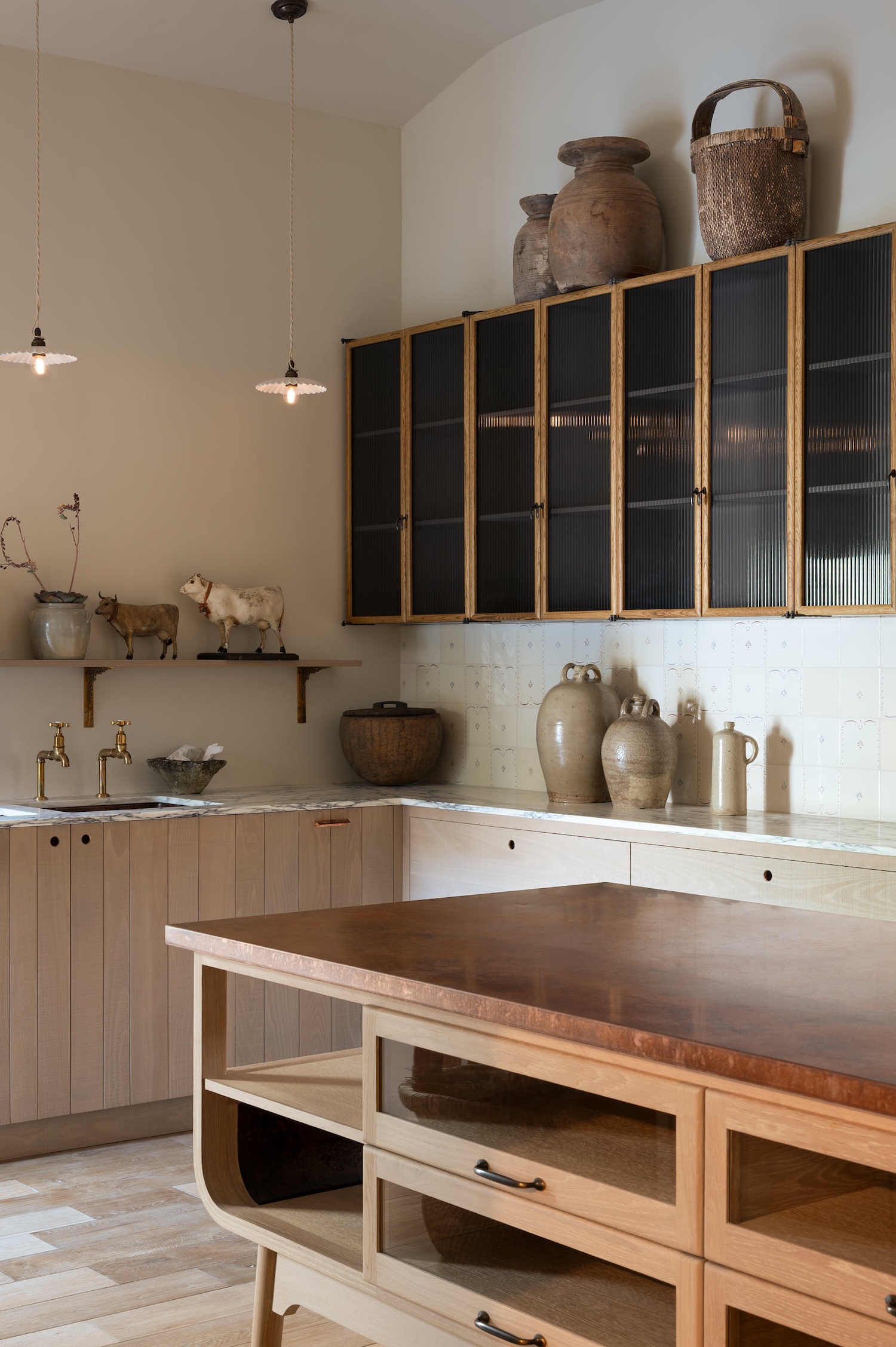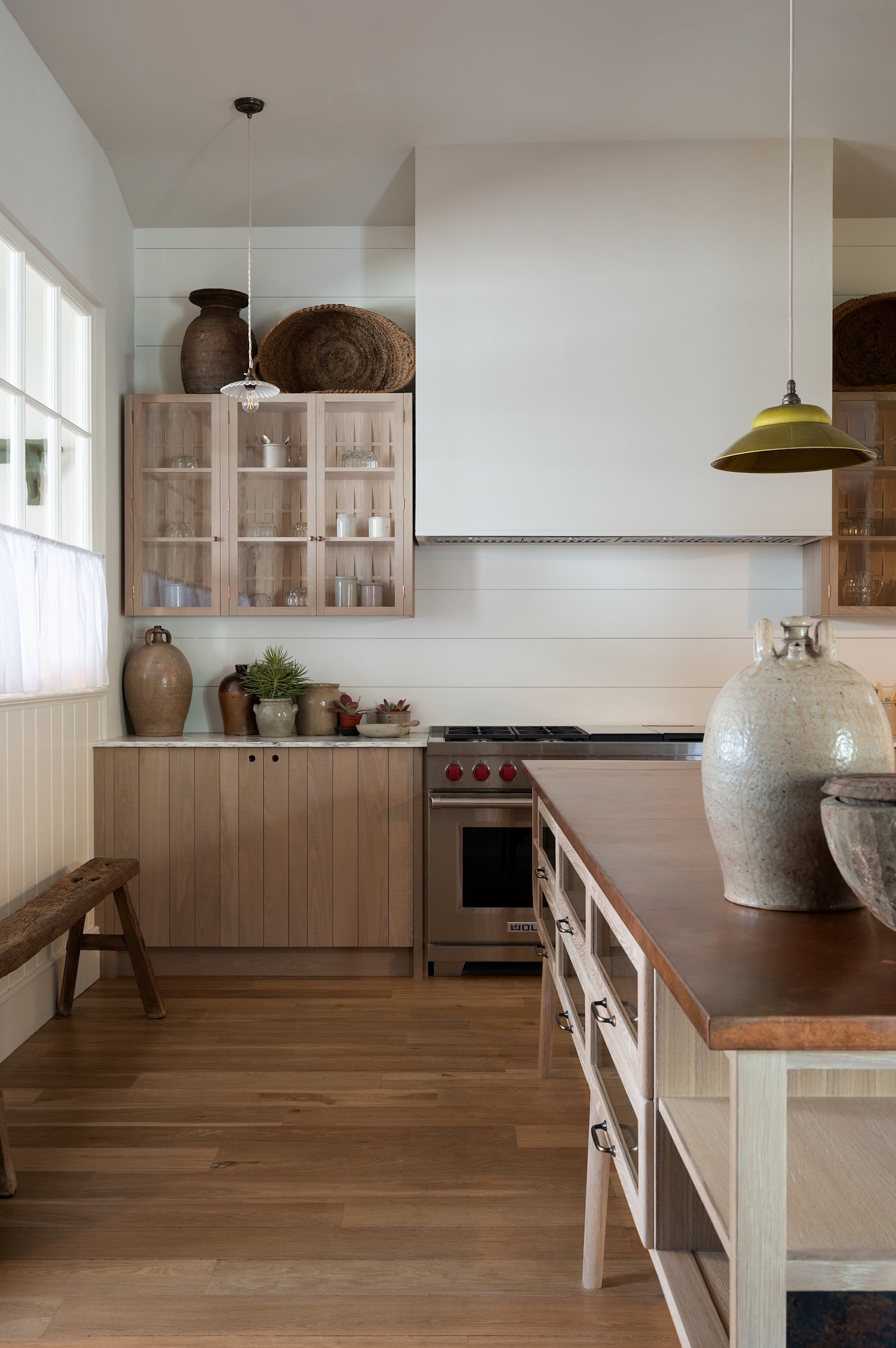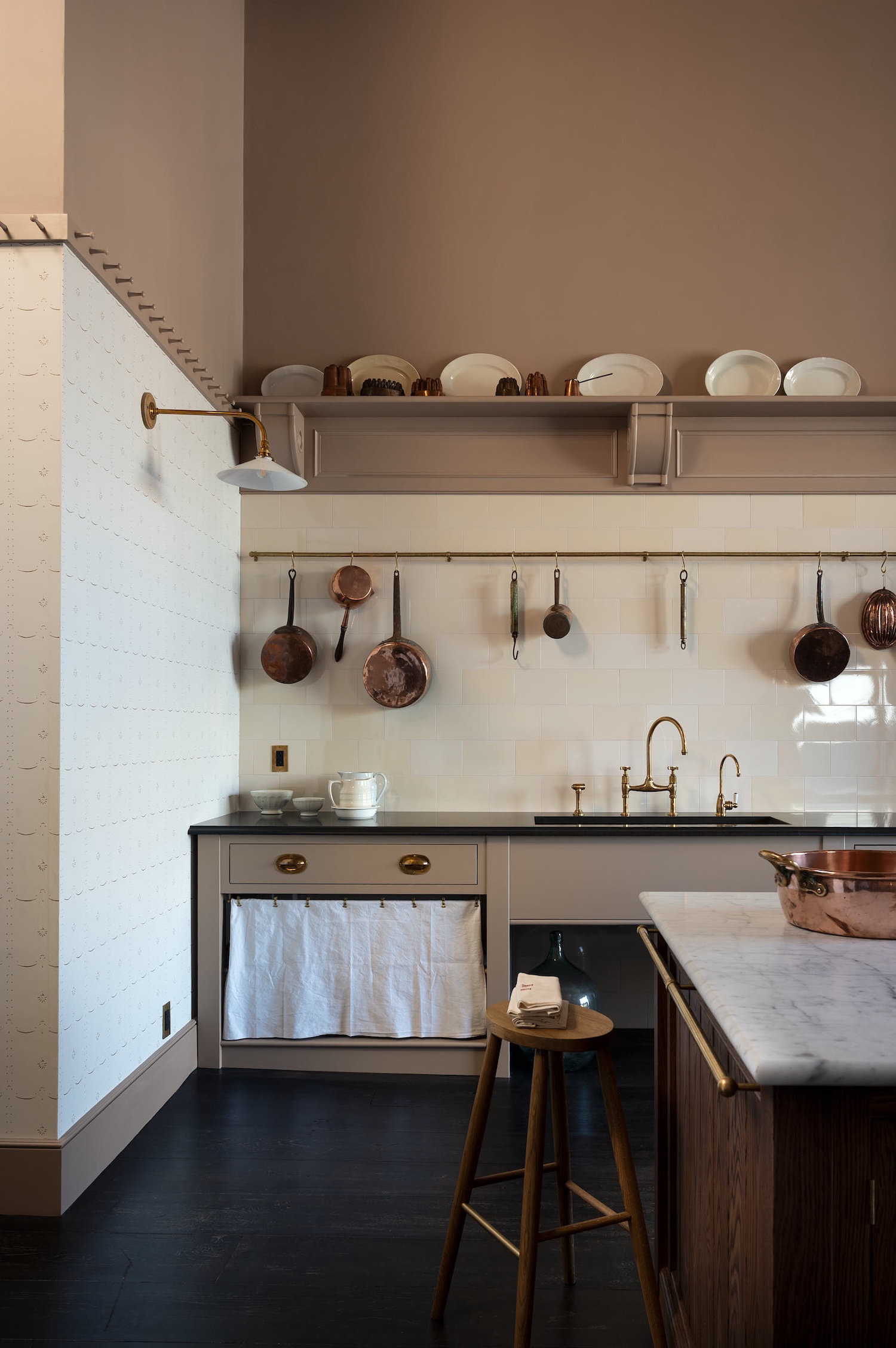 Just beyond the window display, the showroom opens into a spacious, light-filled kitchen with a soft, restrained palette. Inspired by under-the-stairs kitchens in English country homes, the space balances generous storage with an easy warmth, thanks to plaster-toned walls and rich wood floors that ground the room. Cream subway tile, a janitor’s sink, and thoughtfully placed lighting bring function to the forefront, while a copper canopy, brass sink, and vintage accents add quiet glamour. Practical and welcoming, this kitchen is designed for everyday life, where classic forms meet lived-in charm.