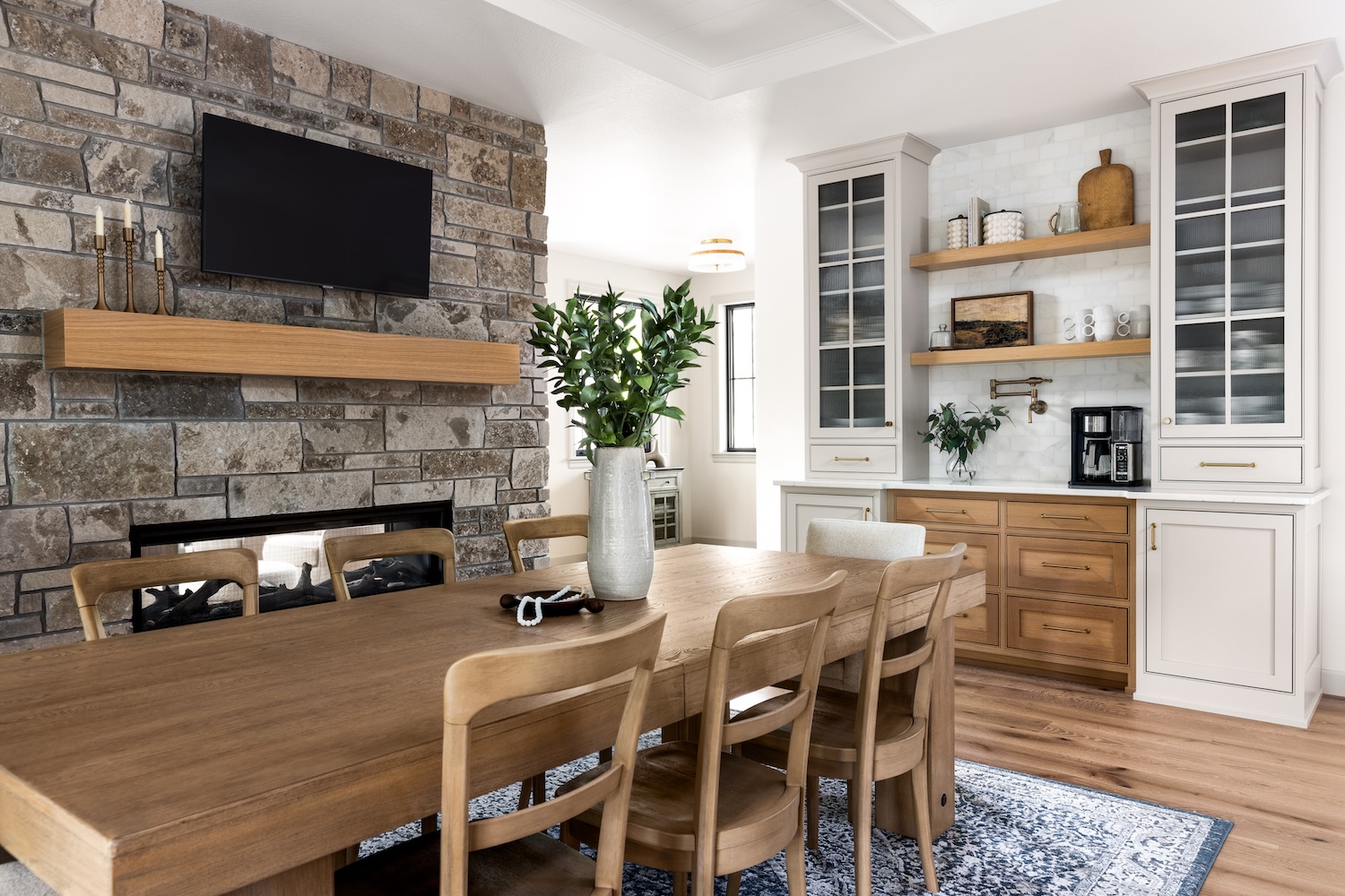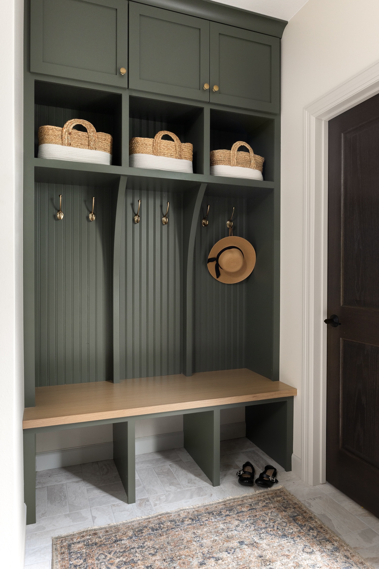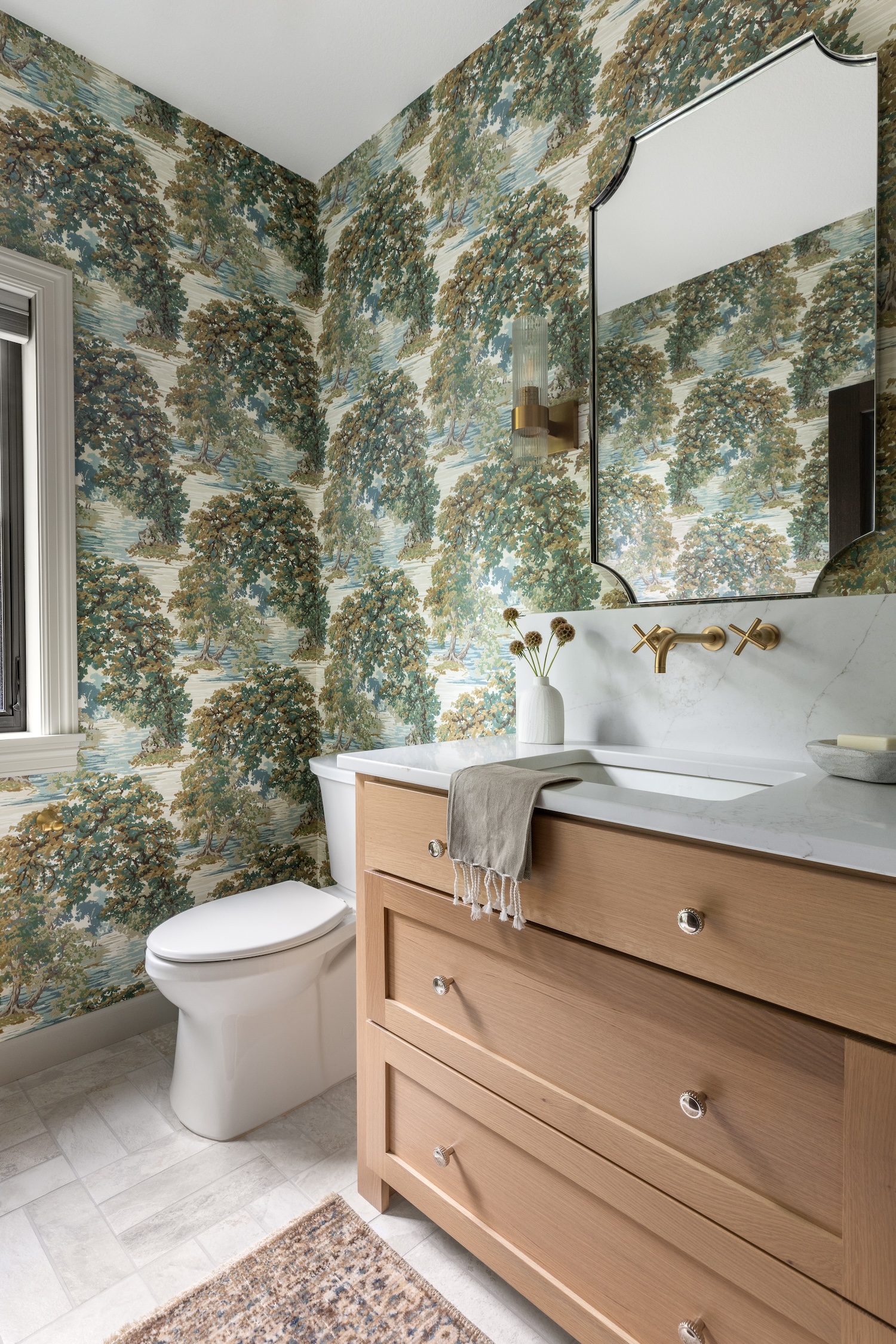 From Katie Kern Interior Design…This client, a seasoned general contractor, came into the project with a clear vision for how the build would come together. Having already built two homes, they were confident in their preferences and knew exactly which materials and finishes they liked and which to avoid. To prevent the home from feeling too dark, we chose a greige tone for the painted trim and kitchen cabinets, complemented by lighter walls. Natural wood and dark espresso stains were introduced to highlight the character and knots in the white oak flooring. I also layered in rich, earthy green tones and a playful wallpaper to echo the surrounding wooded landscape and bring the outdoors in.